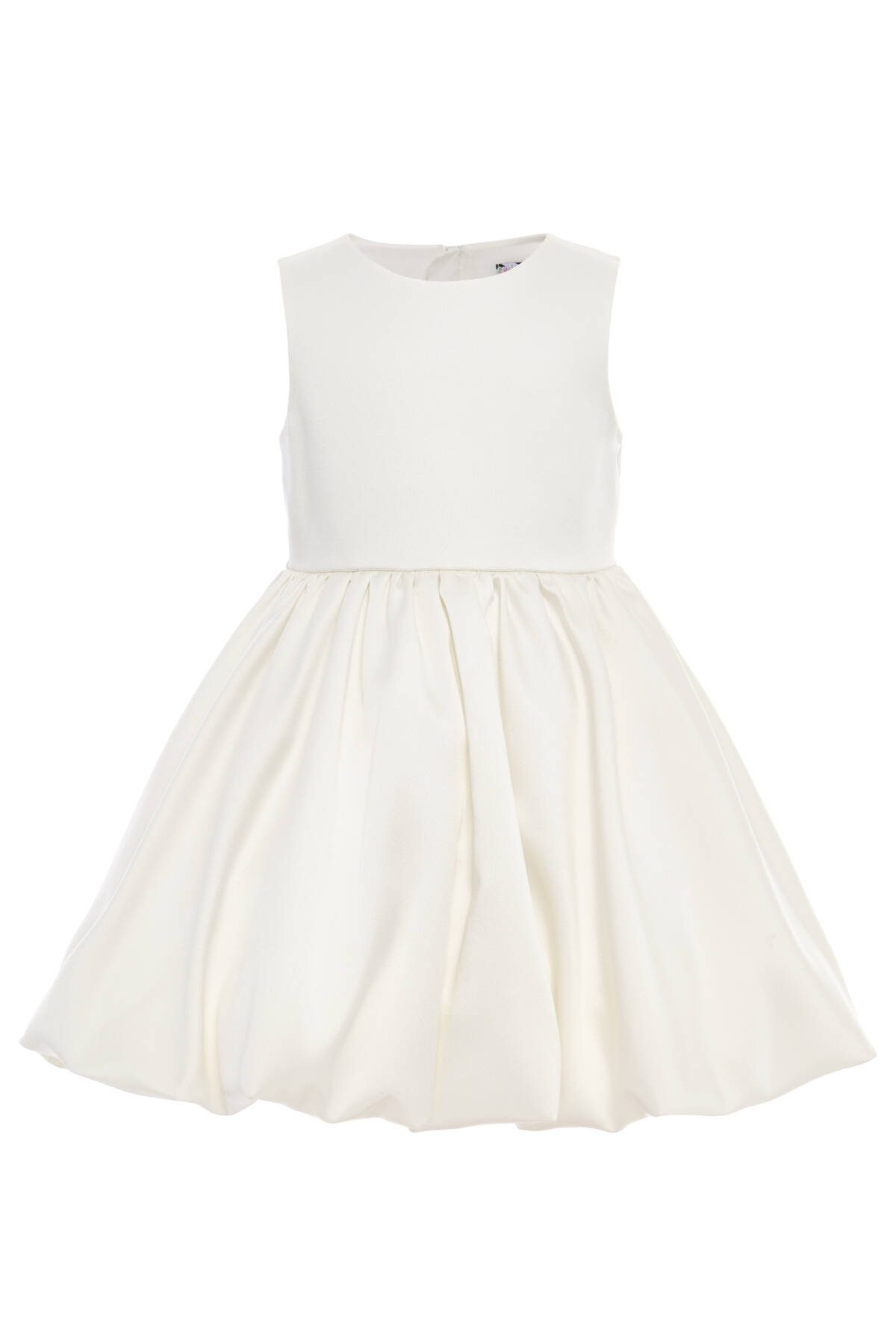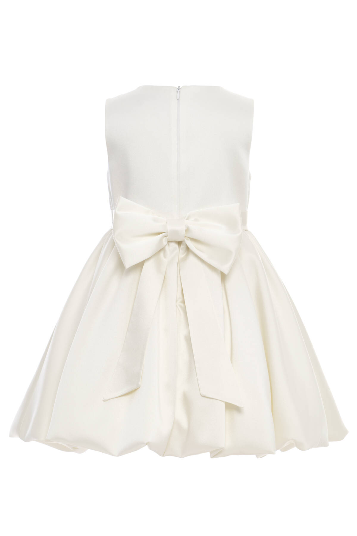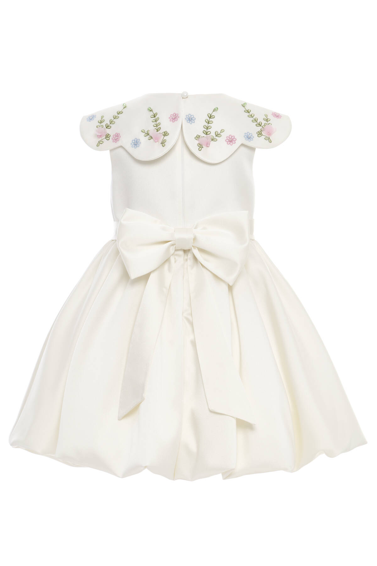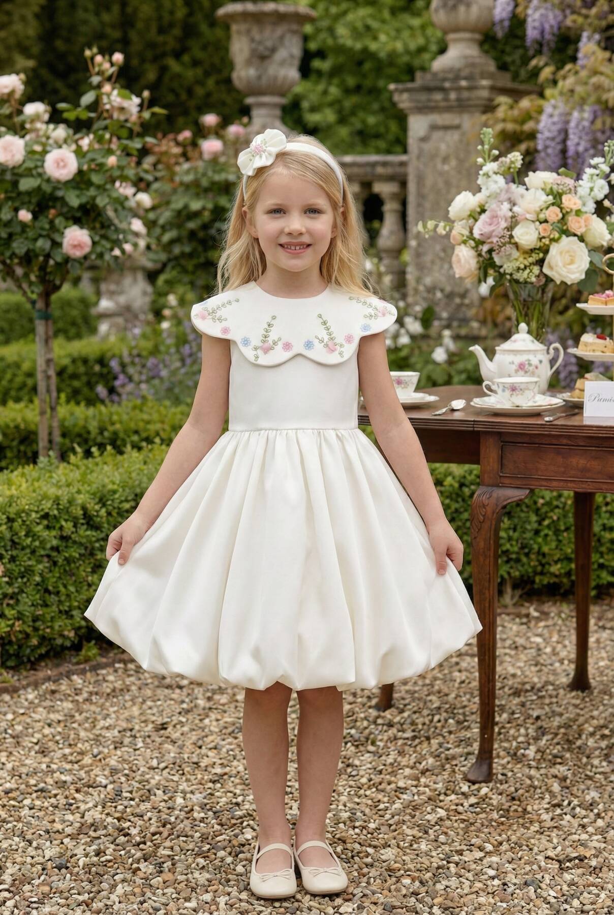 A timeless trio of elegance! This three-piece set features a soft satin dress with a bubble hem skirt, a removable scalloped collar beautifully embroidered with pastel floral details, and a matching flower headband for the perfect finishing touch. The large satin bow at the back adds a charming silhouette, while the removable collar transforms the dress from classic to playful in seconds.