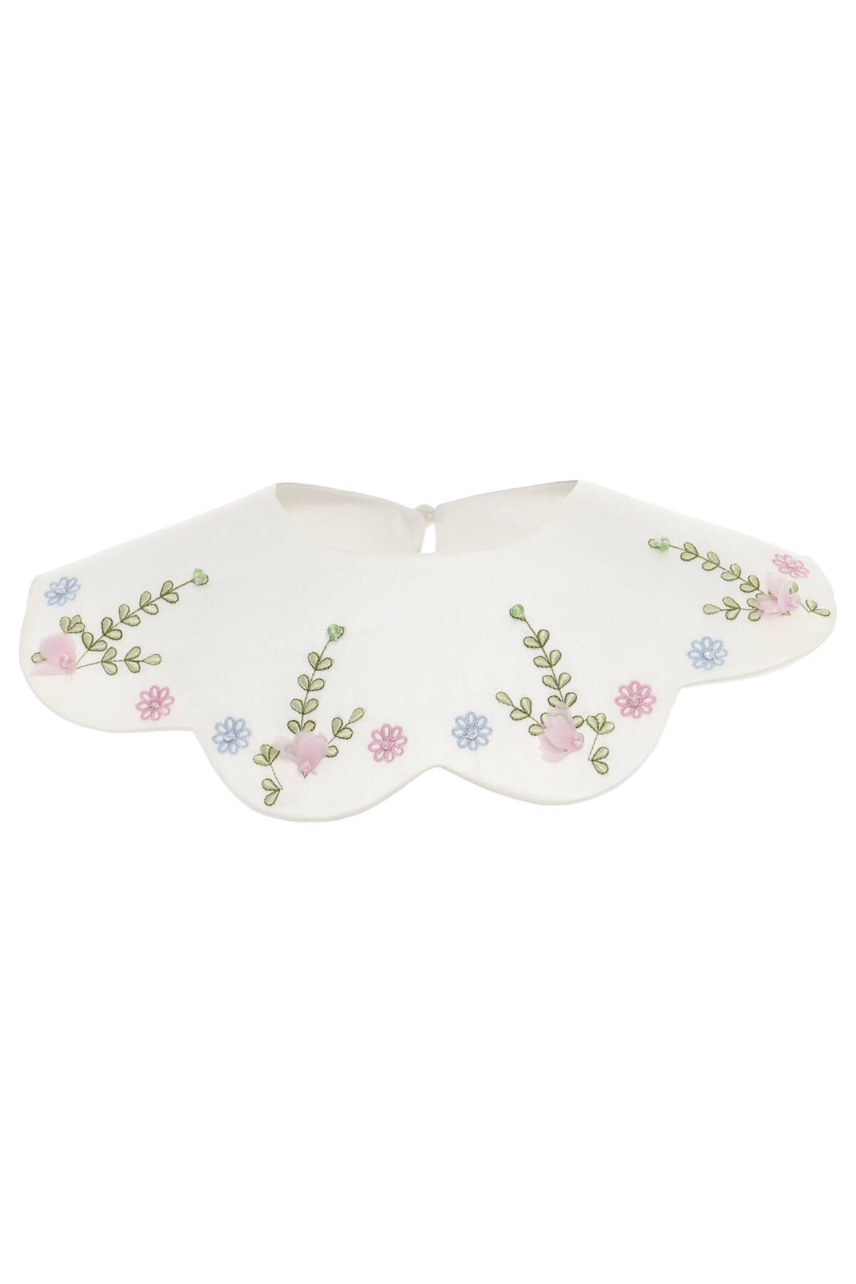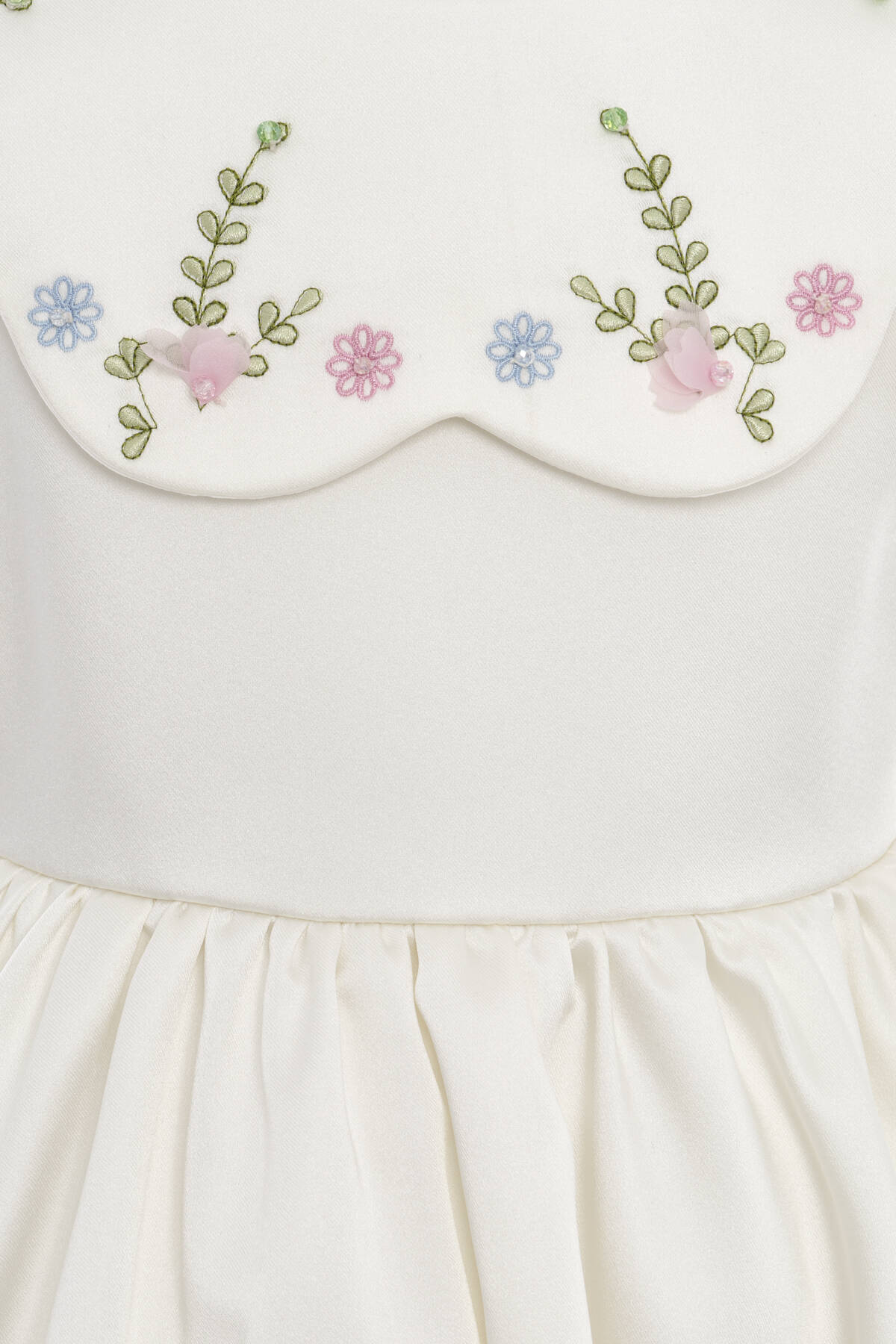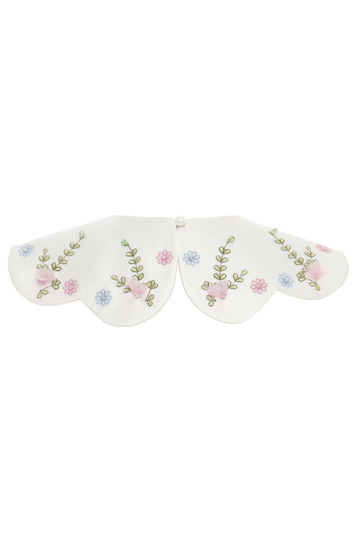 - Scalloped collar with delicate floral embroidery and 3D appliqué