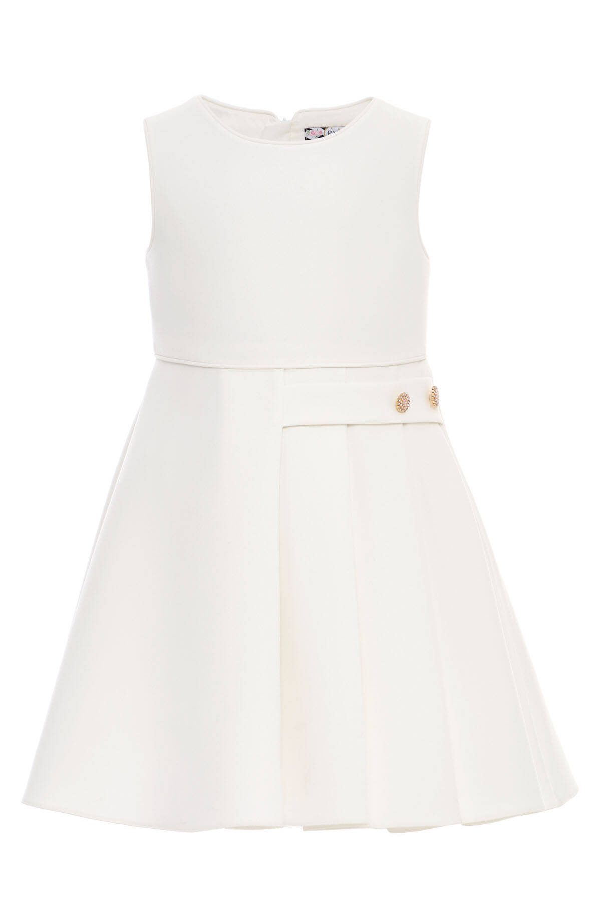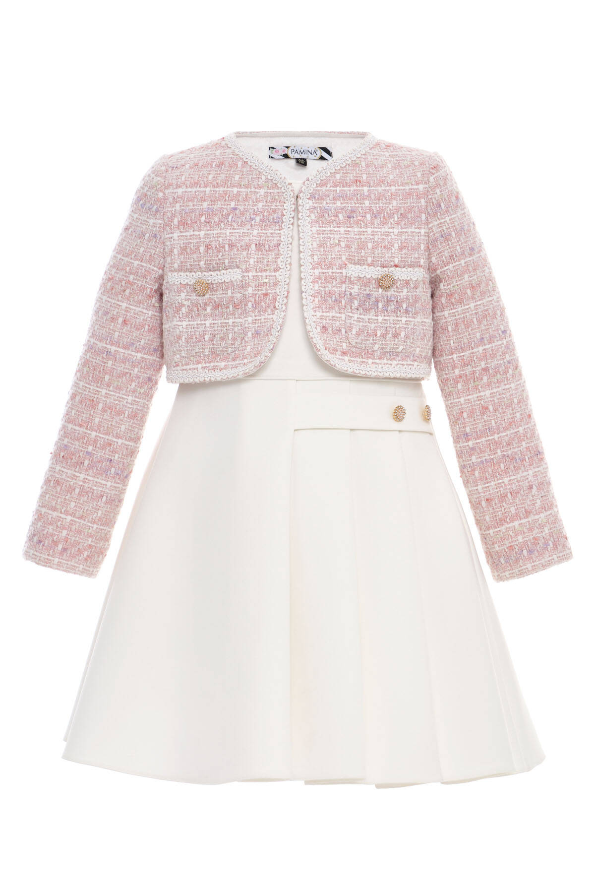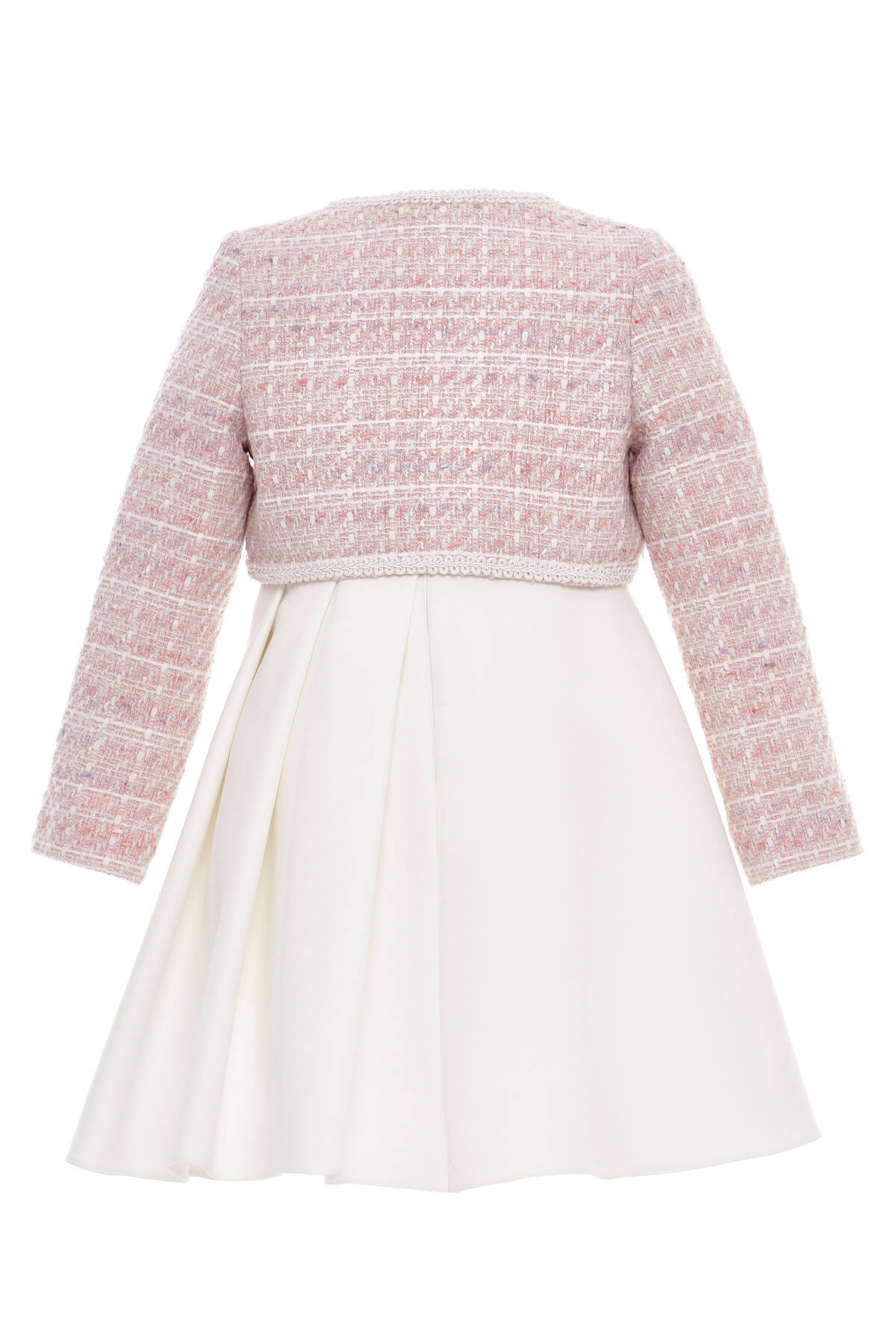 A timeless and polished ensemble for little girls with big style! This elegant two-piece set features a sleeveless pleated dress in a soft pastel tone, paired with a refined tweed jacket designed in classic Chanel-inspired style. The jacket sparkles subtly with interwoven shimmer threads and is finished with pearl-accented gold buttons and delicate trims. Worn as a set, it creates a sophisticated look perfect for weddings, family celebrations, and special events. Worn separately, each piece adds charm and versatility to her wardrobe—effortlessly stylish and comfortable for all-day elegance.