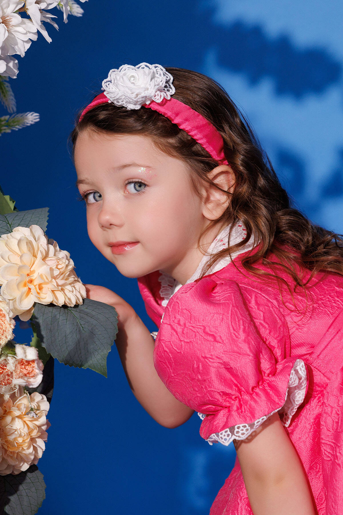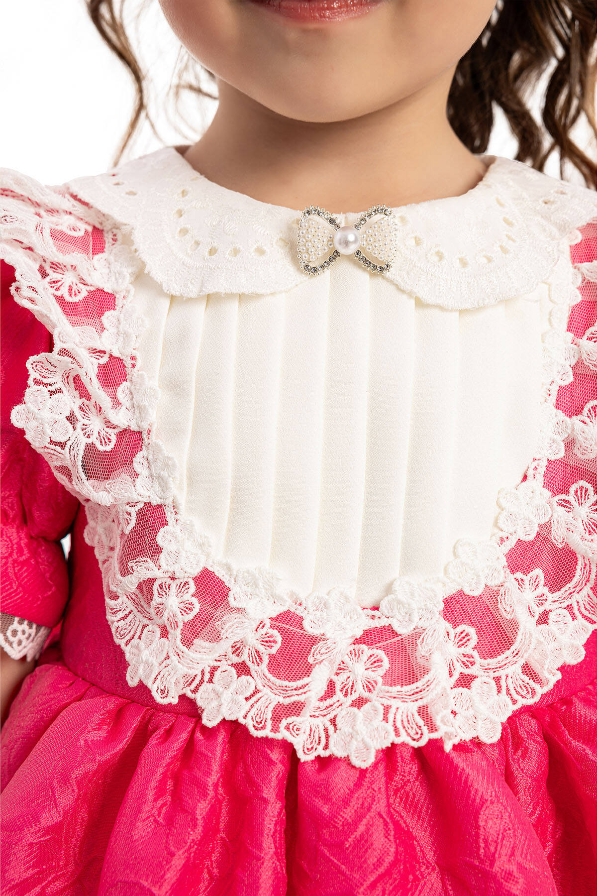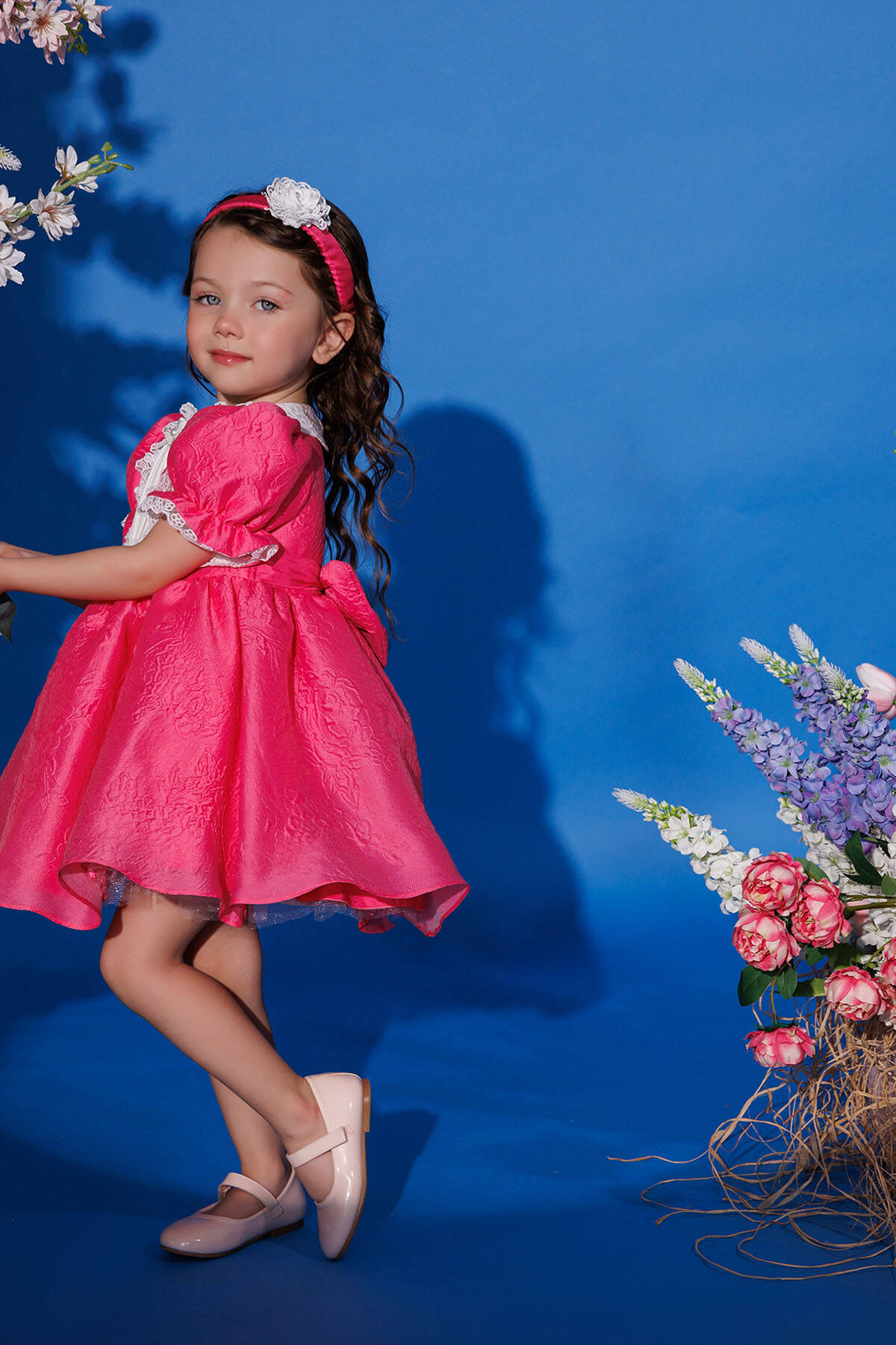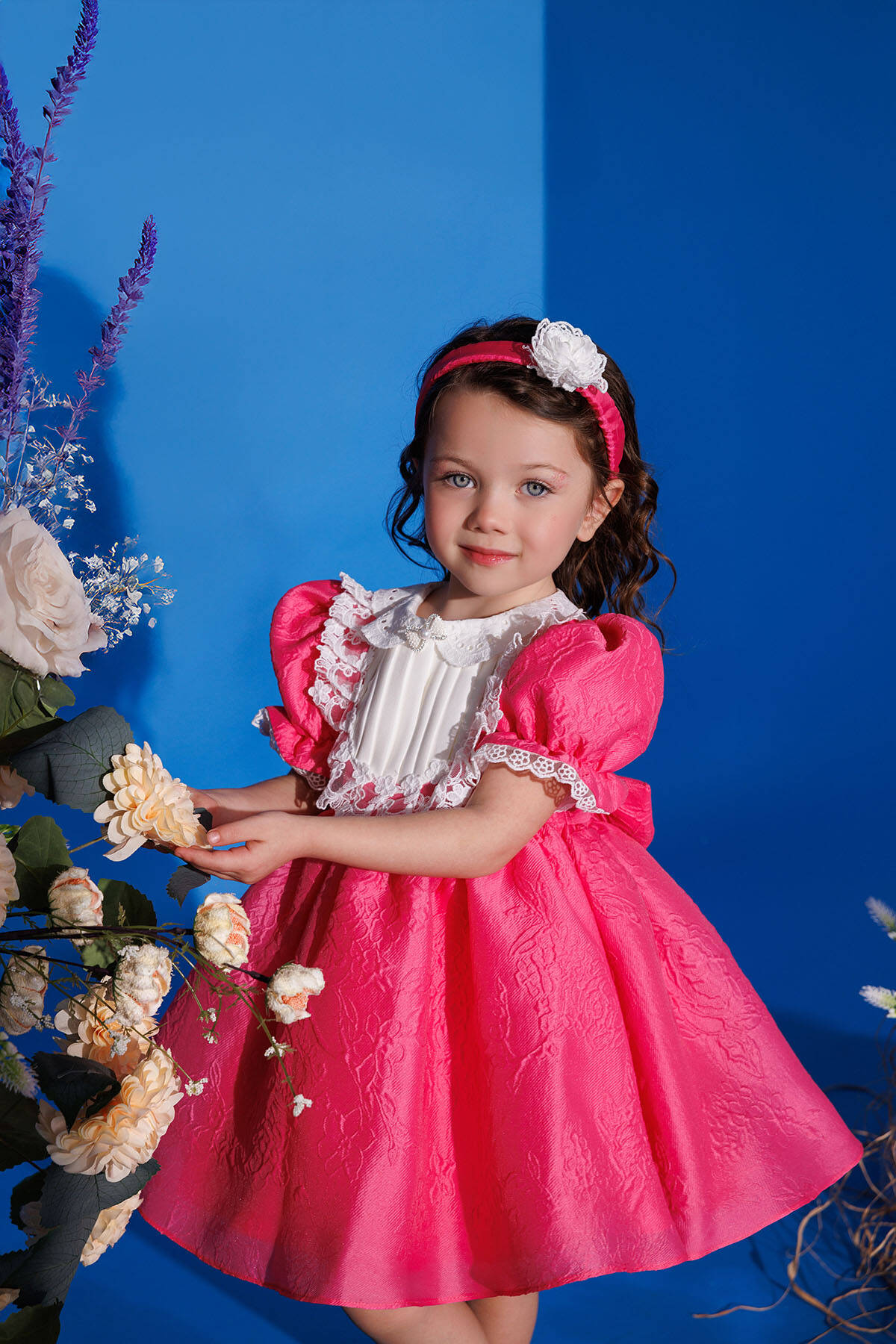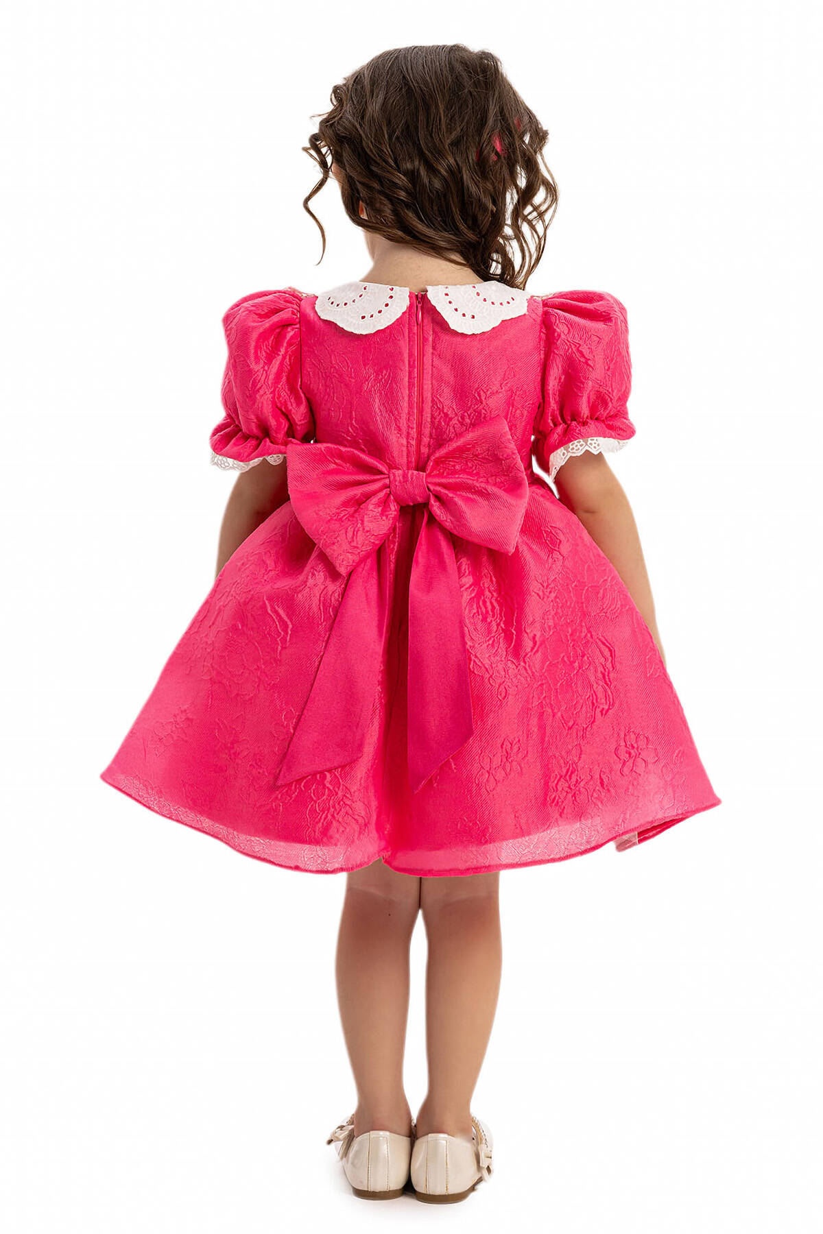 Crafted from premium-quality, soft jacquard fabric, ensuring both comfort and a luxurious texture. The fabric is lightweight yet durable, ideal for your little one’s delicate skin. Features puffed short sleeves with lace trim, a Peter Pan collar detailed with delicate embroidery, and a pleated front panel adorned with a pearl and rhinestone bow. The back showcases an oversized bow for added cuteness, while the flared skirt adds a playful touch to the design. Includes a matching headband wrapped in soft fabric, embellished with a lace flower and pearl center for a coordinated, elegant look.