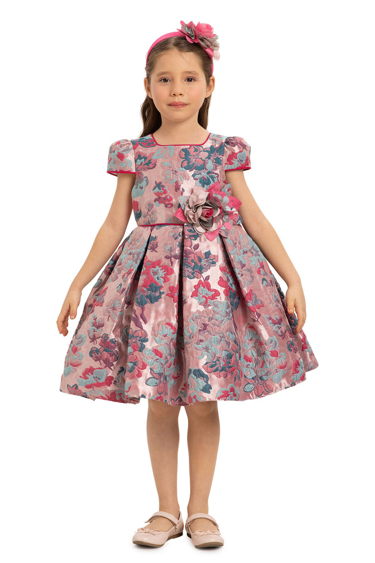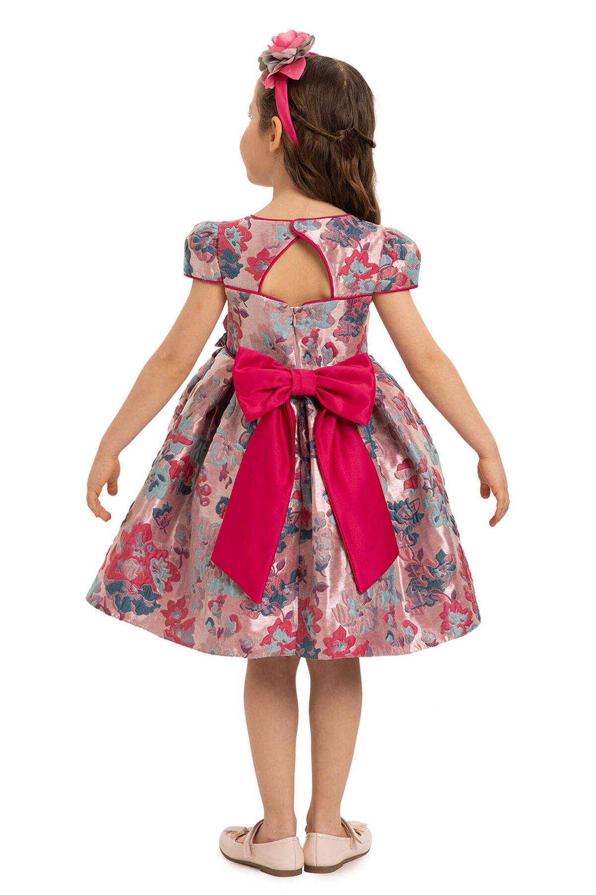 A perfect ensemble for your little one to dazzle at any special occasion, this floral dress with a matching hair accessory combines sophisticated design and premium craftsmanship. Made from luxurious jacquard fabric featuring vibrant floral patterns. The fabric's textured finish and subtle shimmer add a touch of elegance to the design. The waistline is accentuated with a 3D floral applique, complete with layered petals and sparkling embellishments. A voluminous pleated skirt ensures effortless movement and a princess-like feel. A large satin bow at the back enhances the design with a playful yet elegant flair.