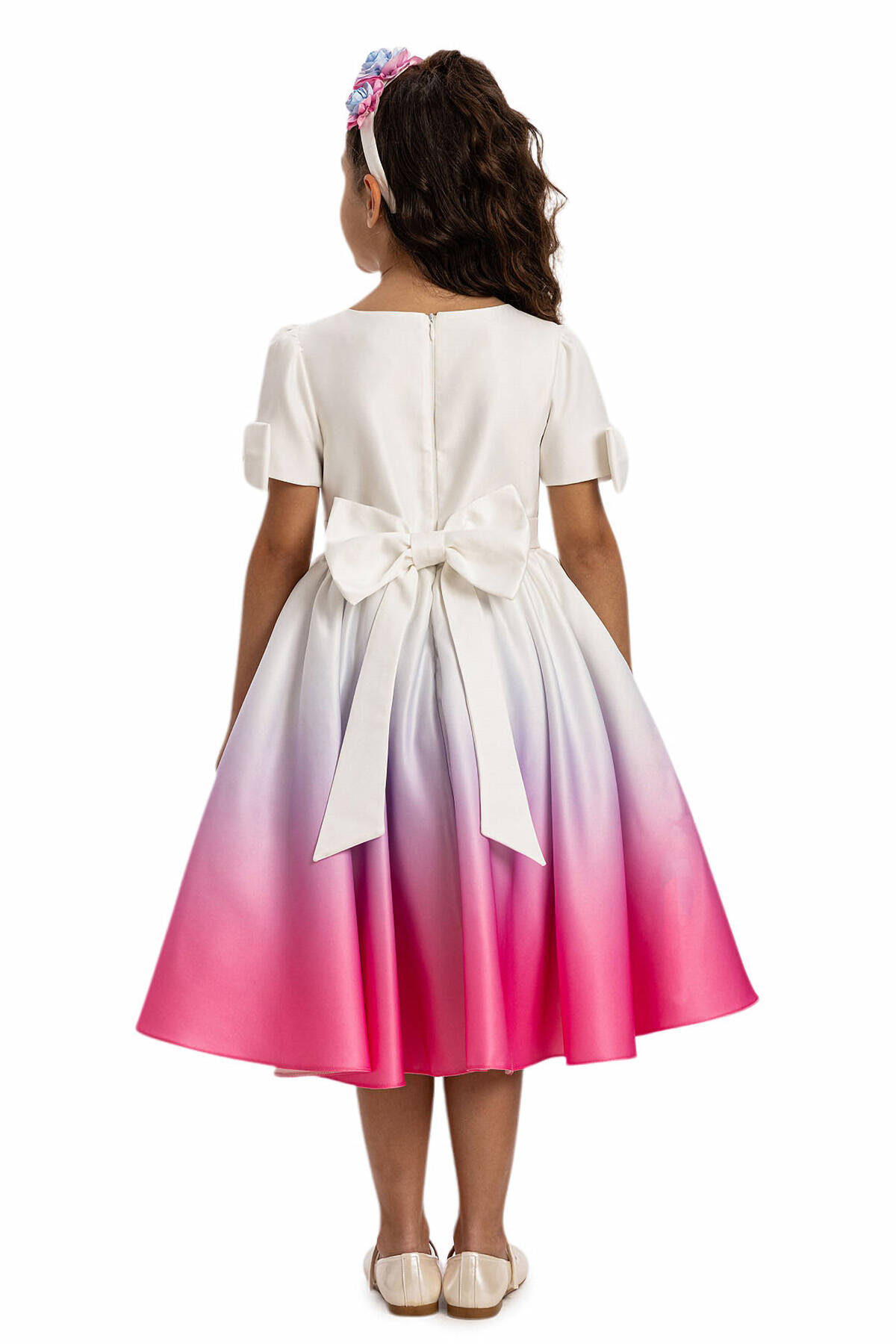 The dress features a beautifully crafted gradient design in blue and fuchsia tones, creating a striking visual appeal. Short puffed sleeves with bow details and a cluster of vibrant floral accents at the waist add charming details to this standout piece. The back is finished with a flowing satin bow, ensuring both adjustability and style. Perfect for birthdays, weddings, or any special occasion, this dress combines sophistication and playfulness in one timeless design.