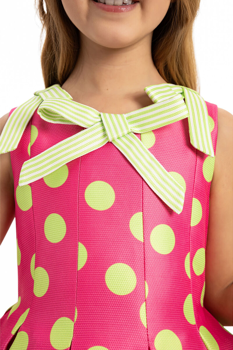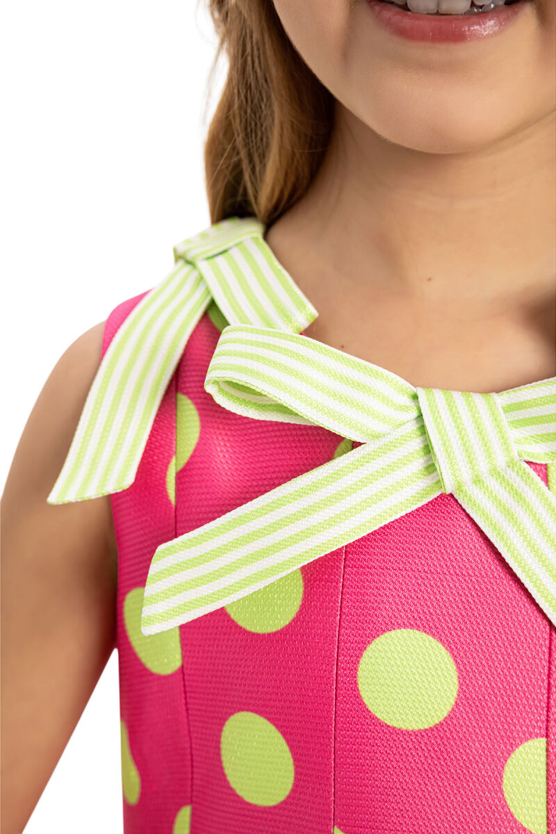 Add a burst of playful charm to your little girl’s wardrobe with this vibrant polka dot dress and matching bag set. Designed in bold colors, the sleeveless dress features delightful striped bow accents and a full flared skirt for twirling fun. The matching bag, complete with a coordinating bow, is the perfect accessory for carrying small treasures. This cheerful ensemble is ideal for birthday parties, family gatherings, or any occasion that calls for colorful style.
