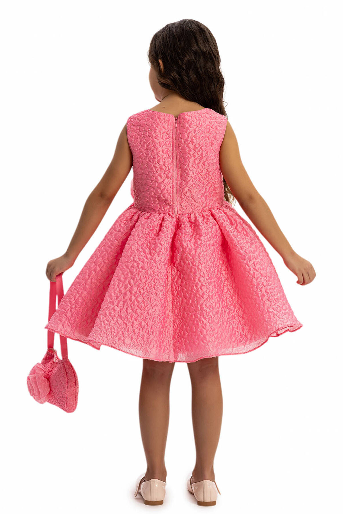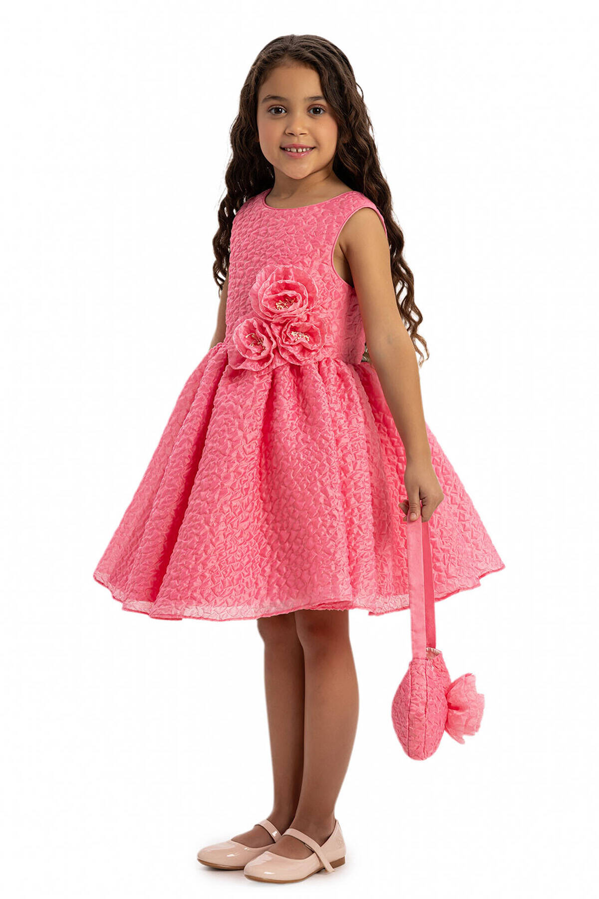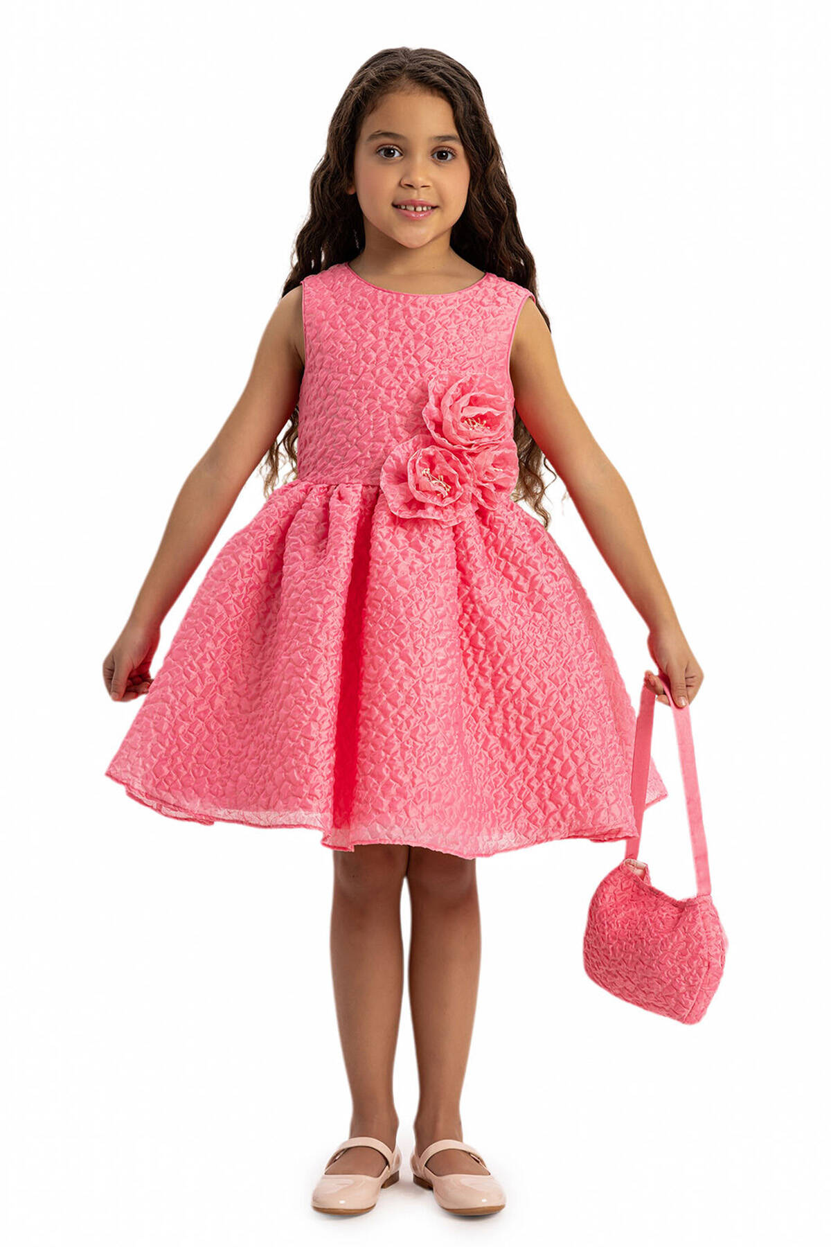 Make every special occasion unforgettable with this elegant textured dress and matching bag set. The dress showcases a soft, crinkled fabric adorned with delicate flower appliqués at the waist for a touch of sophistication. Its flared skirt adds a twirl-worthy charm, perfect for parties or family gatherings. The coordinating bag completes the look, featuring the same textured fabric and a matching flower detail.
