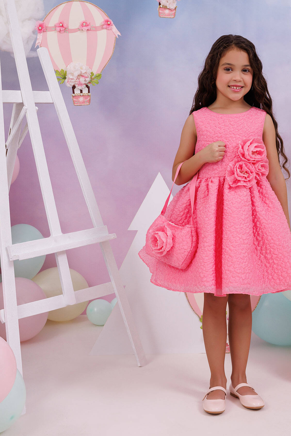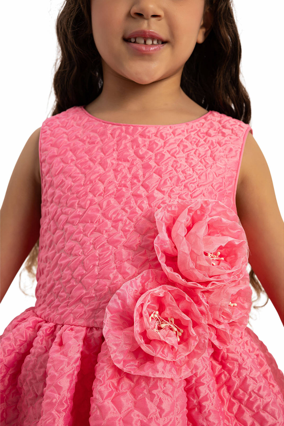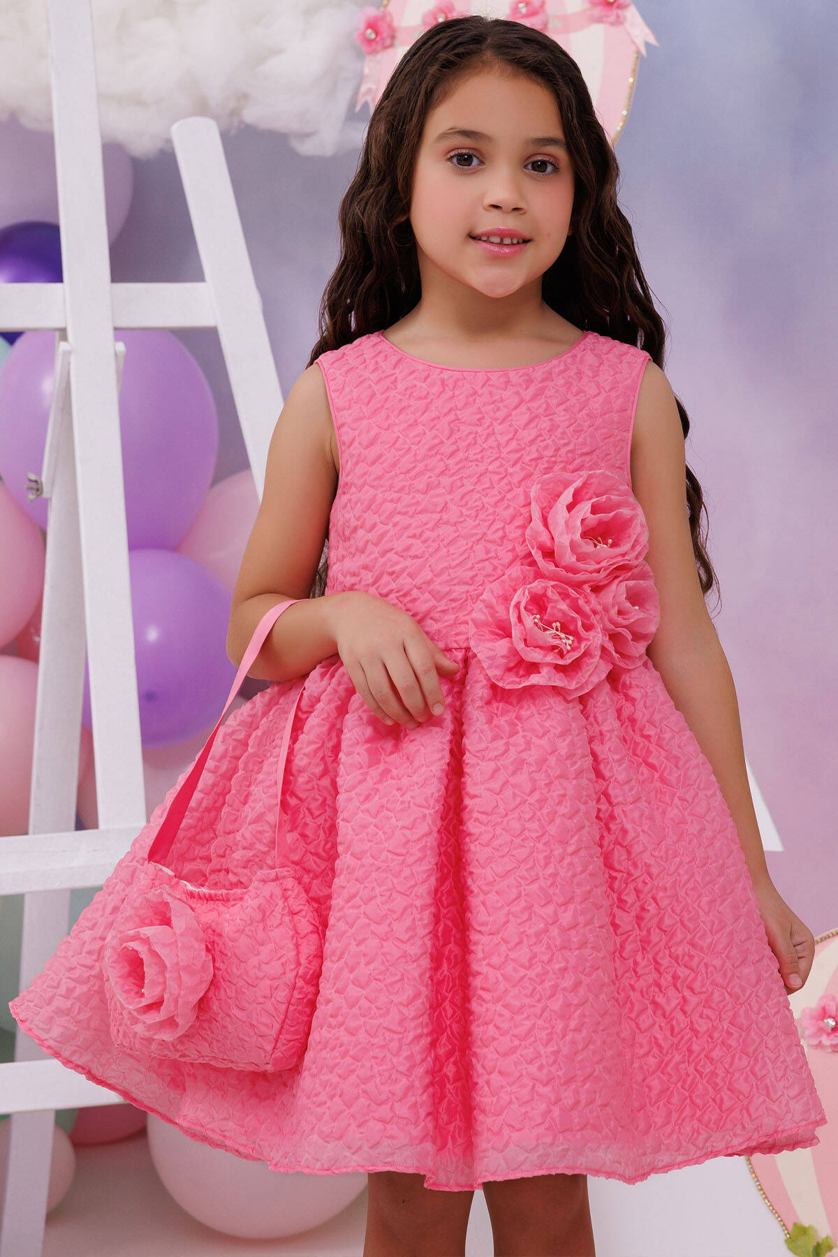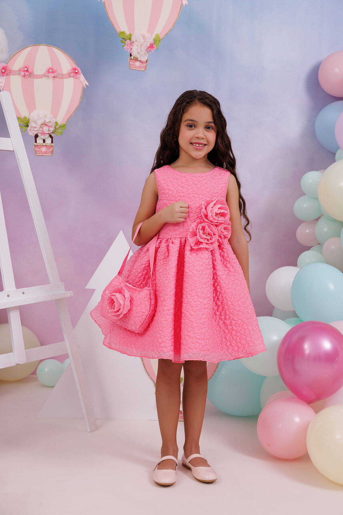 Make every special occasion unforgettable with this elegant textured dress and matching bag set. The dress showcases a soft, crinkled fabric adorned with delicate flower appliqués at the waist for a touch of sophistication. Its flared skirt adds a twirl-worthy charm, perfect for parties or family gatherings. The coordinating bag completes the look, featuring the same textured fabric and a matching flower detail.