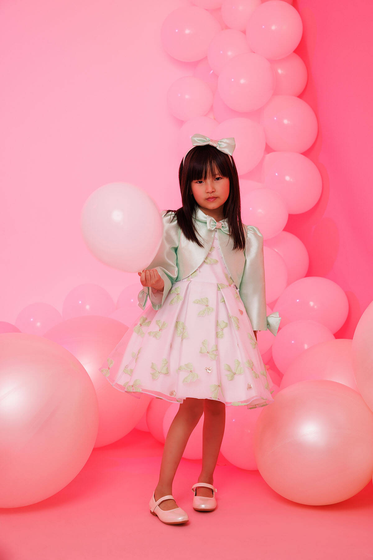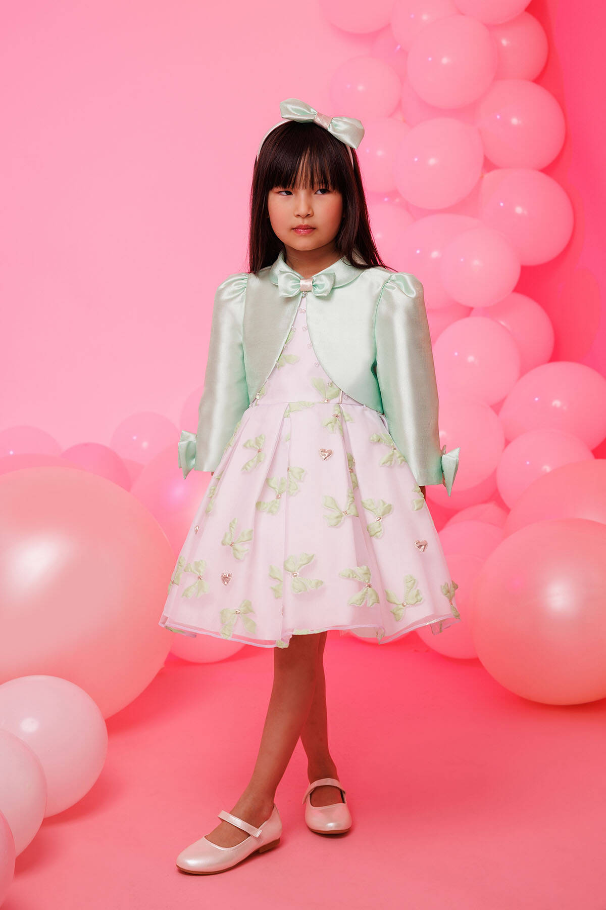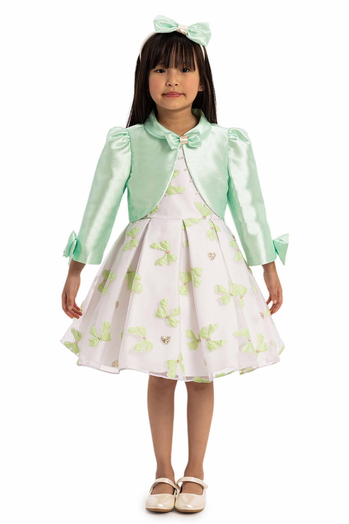 This sleeveless dress features a charming bow embroidery design and a stylish cutout back detail, perfect for special occasions. The set includes a matching satin-finish jacket, complete with a bow embellishment on the collar and cuffs, adding a sophisticated touch. A coordinating hair accessory finishes the look, making this outfit an ideal choice for weddings, birthdays, or family celebrations.