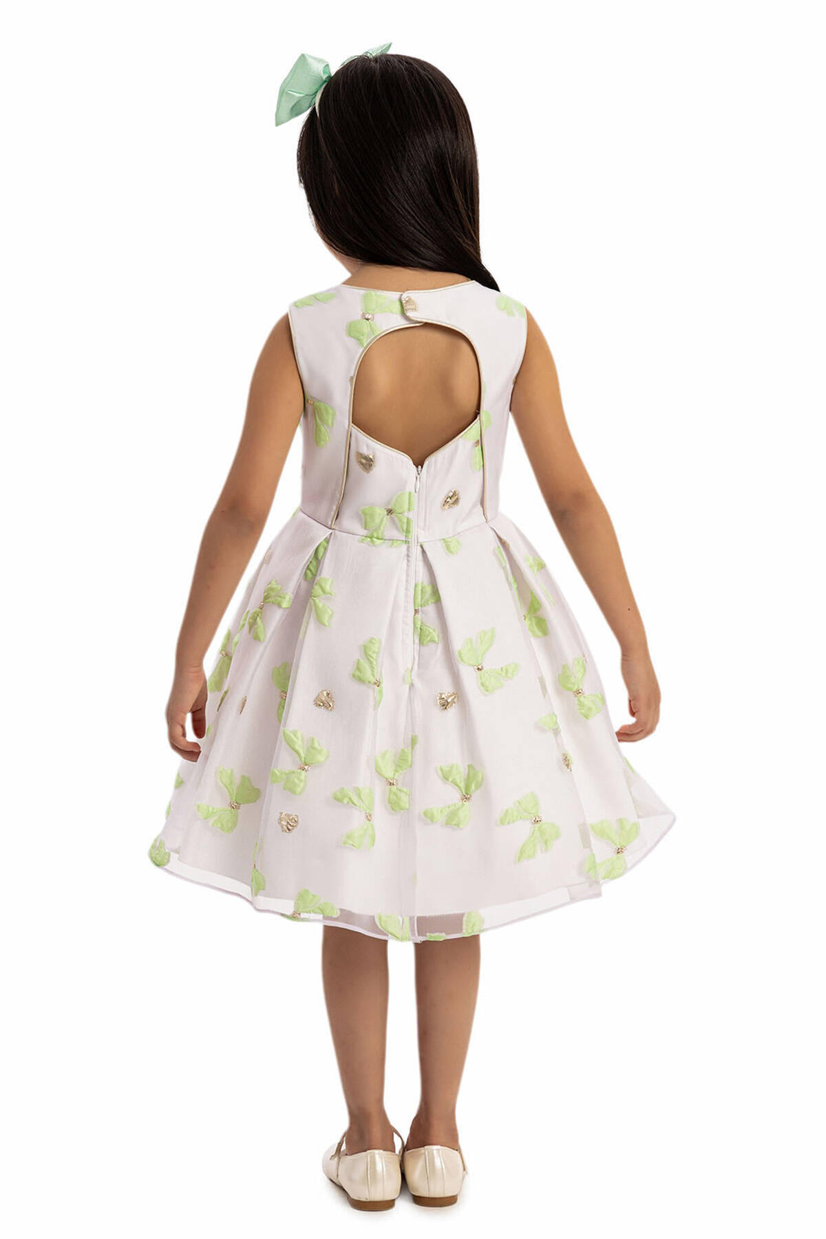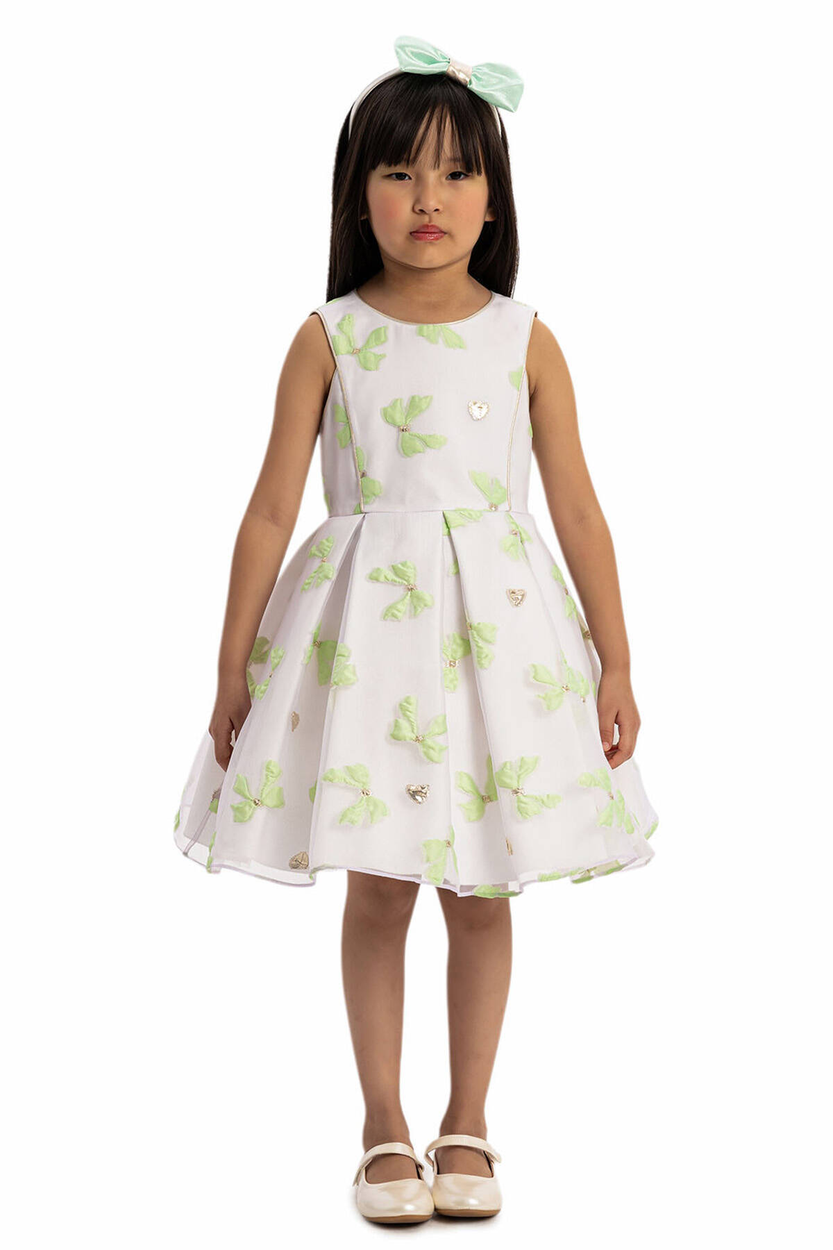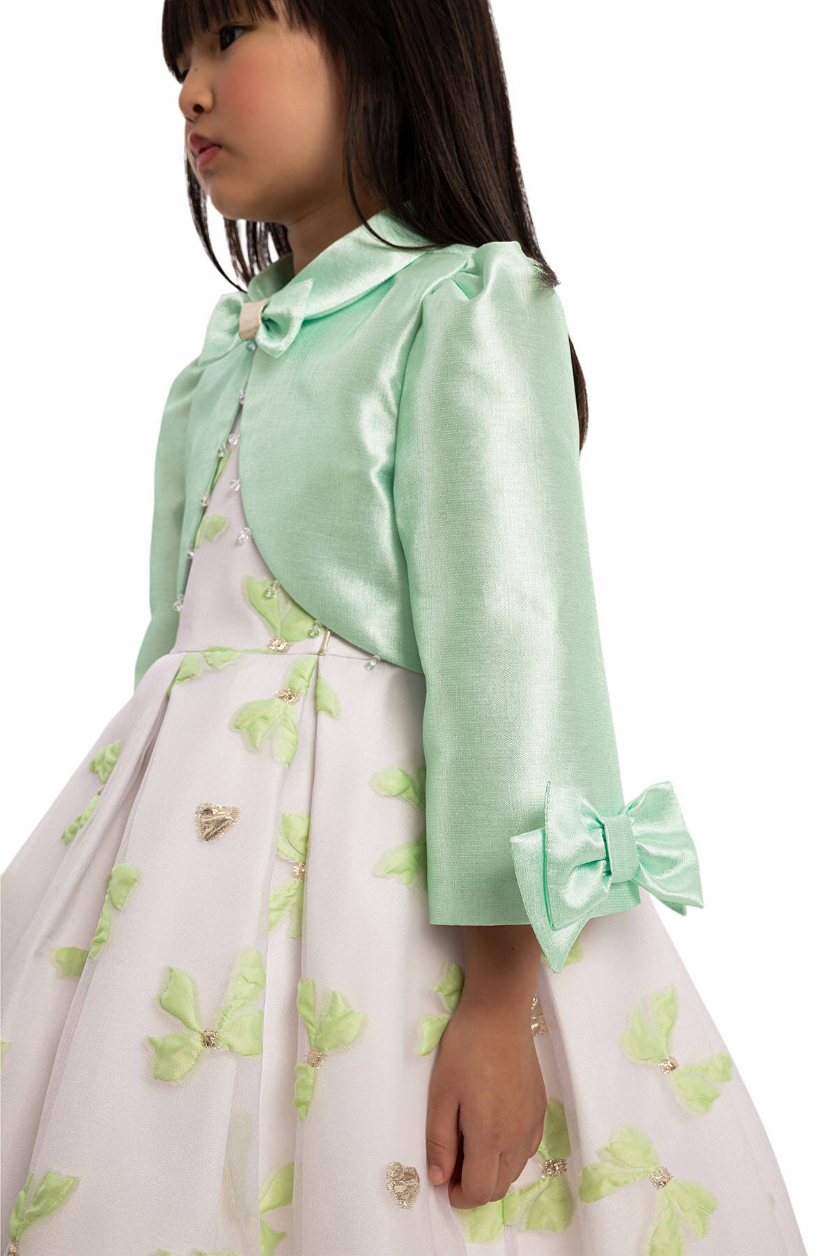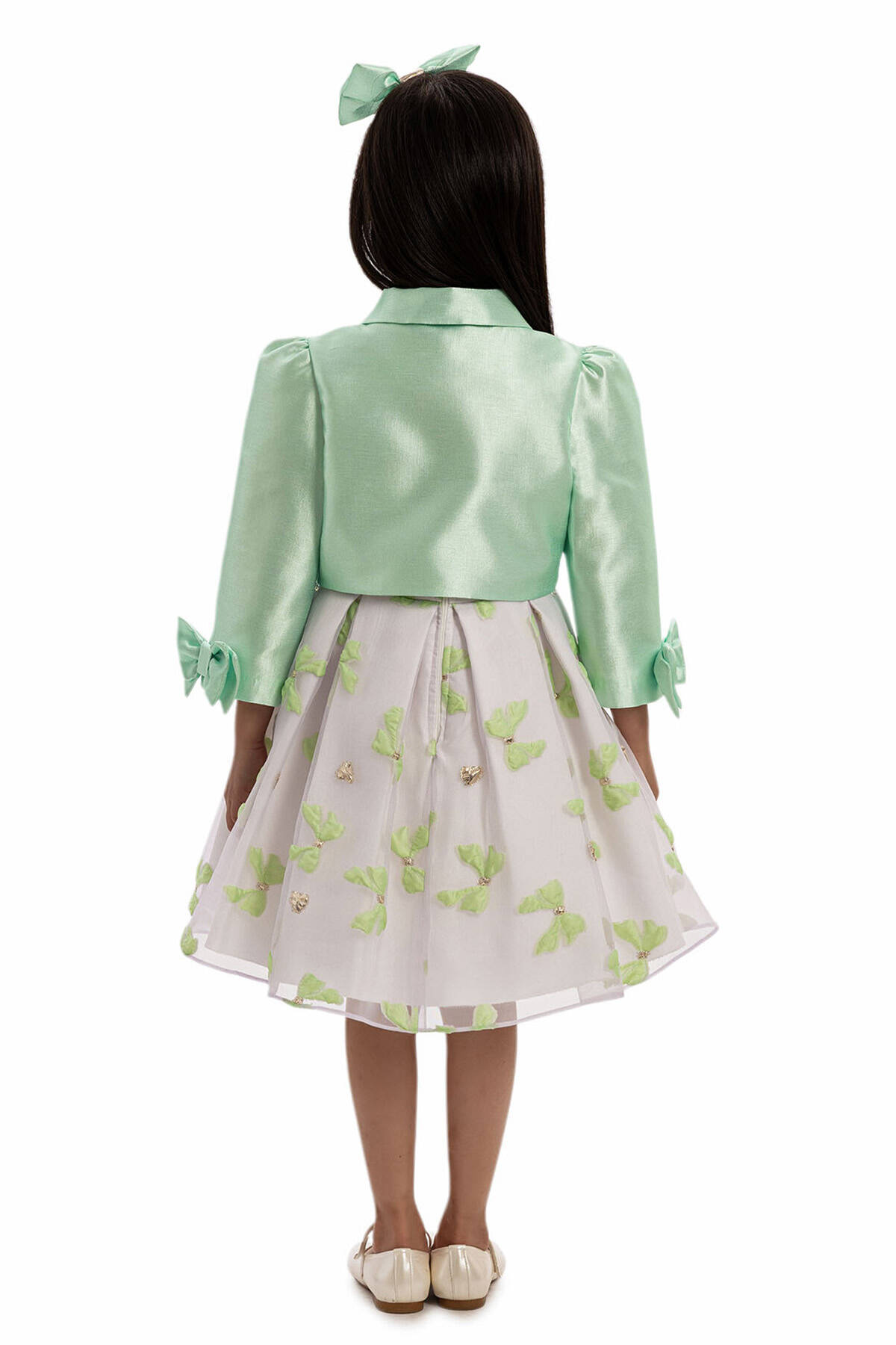 This sleeveless dress features a charming bow embroidery design and a stylish cutout back detail, perfect for special occasions. The set includes a matching satin-finish jacket, complete with a bow embellishment on the collar and cuffs, adding a sophisticated touch. A coordinating hair accessory finishes the look, making this outfit an ideal choice for weddings, birthdays, or family celebrations.