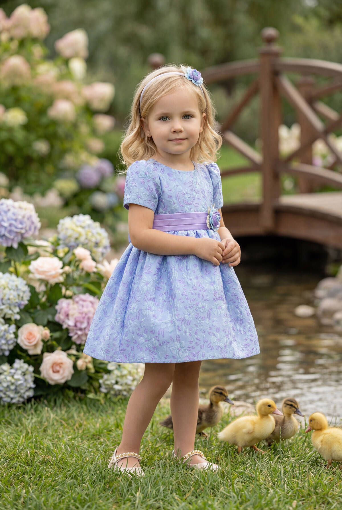 Make your little one the center of attention with this delightful baby dress set, complete with a matching headband. Perfectly suited for special occasions, this dress features soft floral embroidery, a charming bow at the back, and delicate pastel hues of powder pink and lilac. The satin waistband with a floral embellishment adds a touch of elegance, while the lightweight fabric ensures all-day comfort. A coordinating headband with a floral accent completes the adorable look, making it ideal for birthdays, celebrations, or family photoshoots.