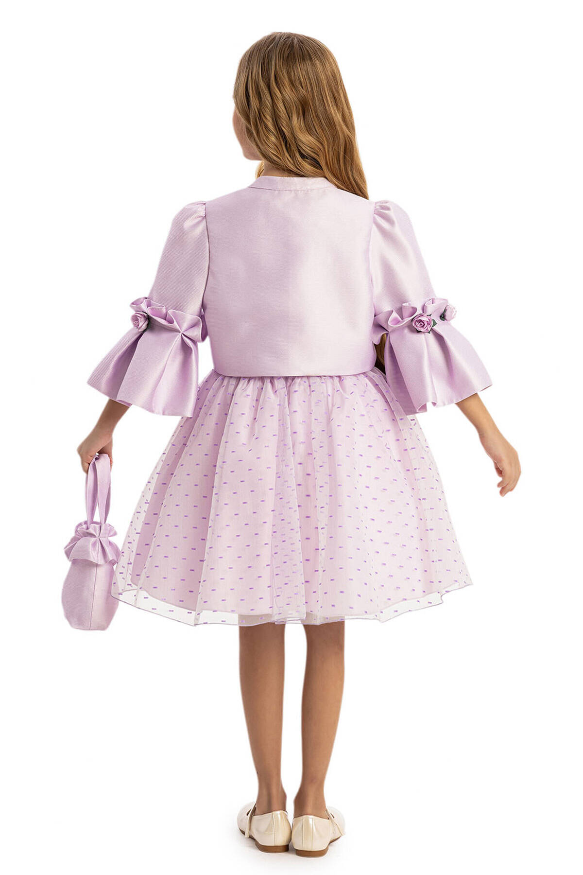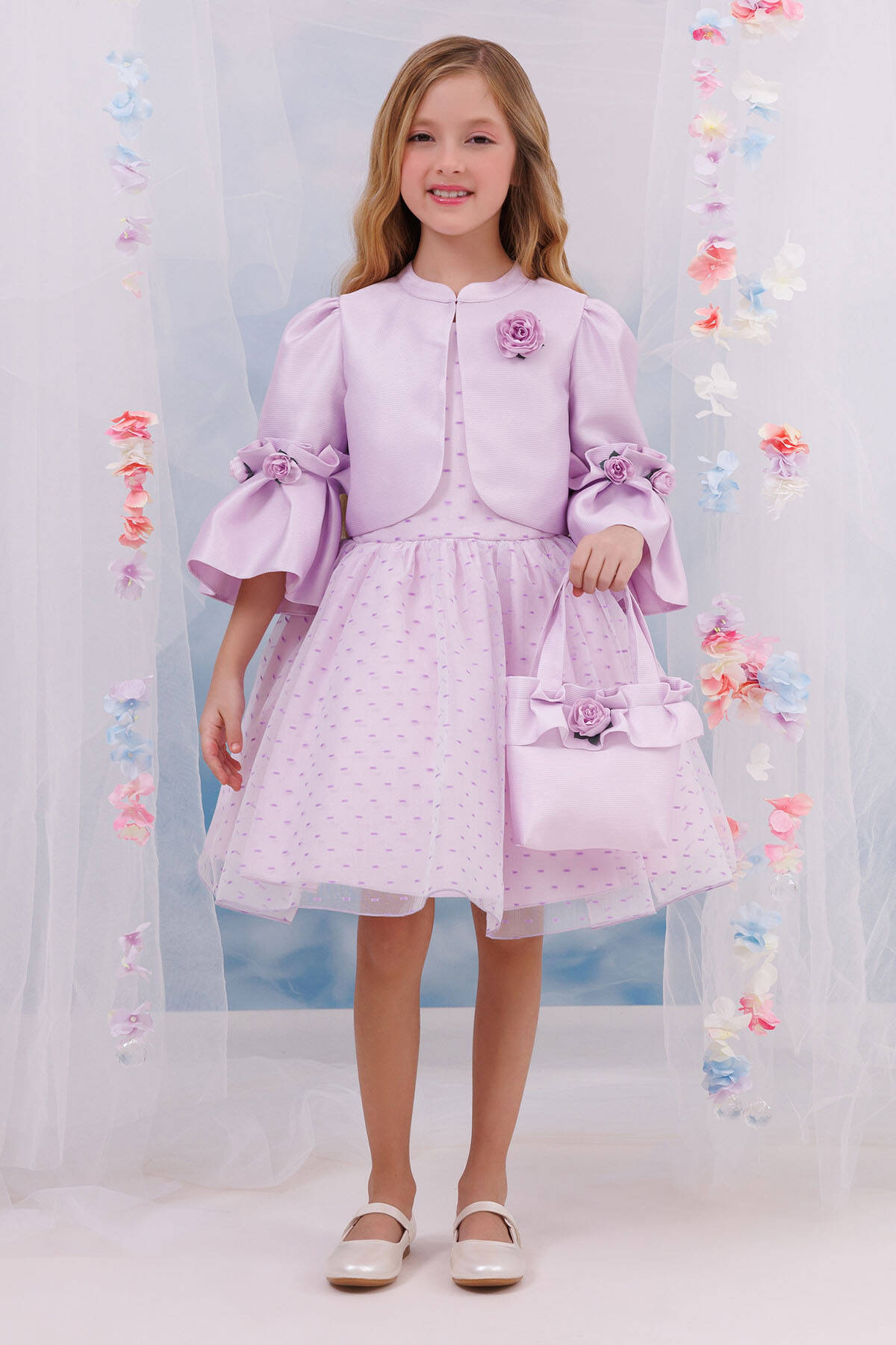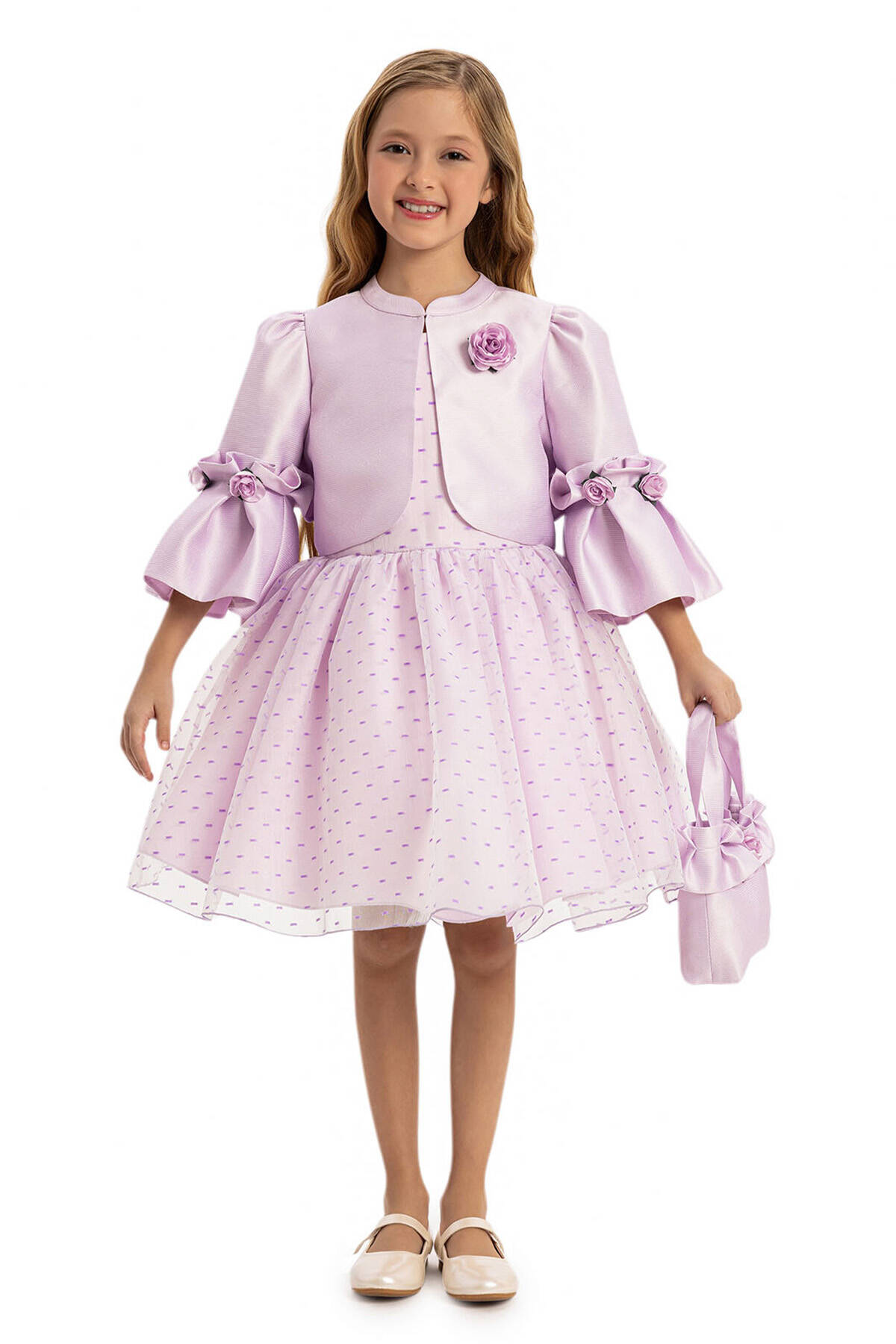Let your little princess shine in our Pink Polka Dot Dress Set, a stunning combination of style and charm. The sleeveless polka dot dress is designed with a flattering flare silhouette that ensures comfort and grace for every special occasion. This delightful set includes a matching textured jacket with elegant flower details on the sleeves and chest, adding a touch of sophistication. The set is completed with a coordinating bag adorned with a flower embellishment, making it the perfect outfit for weddings, birthdays, or family gatherings.