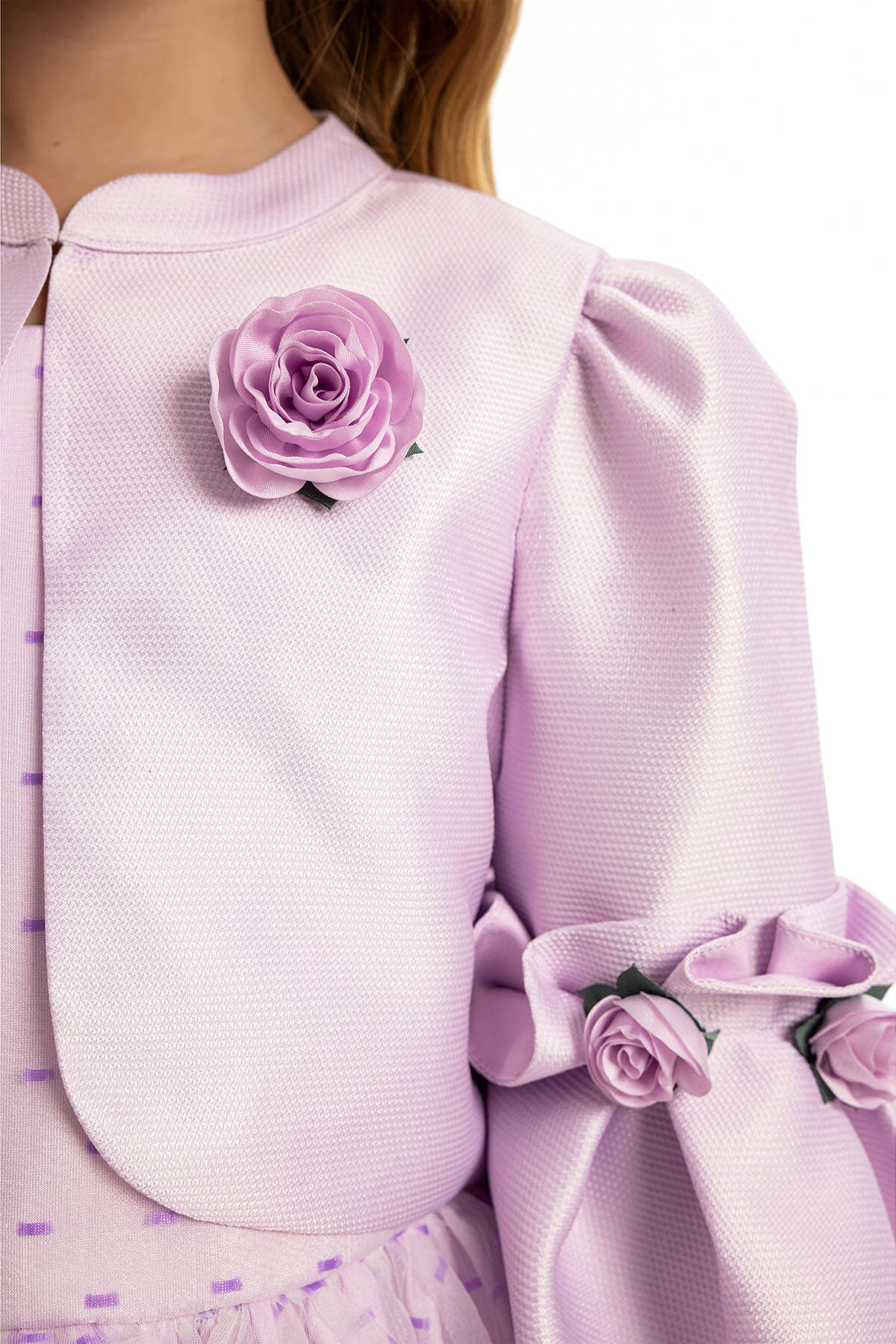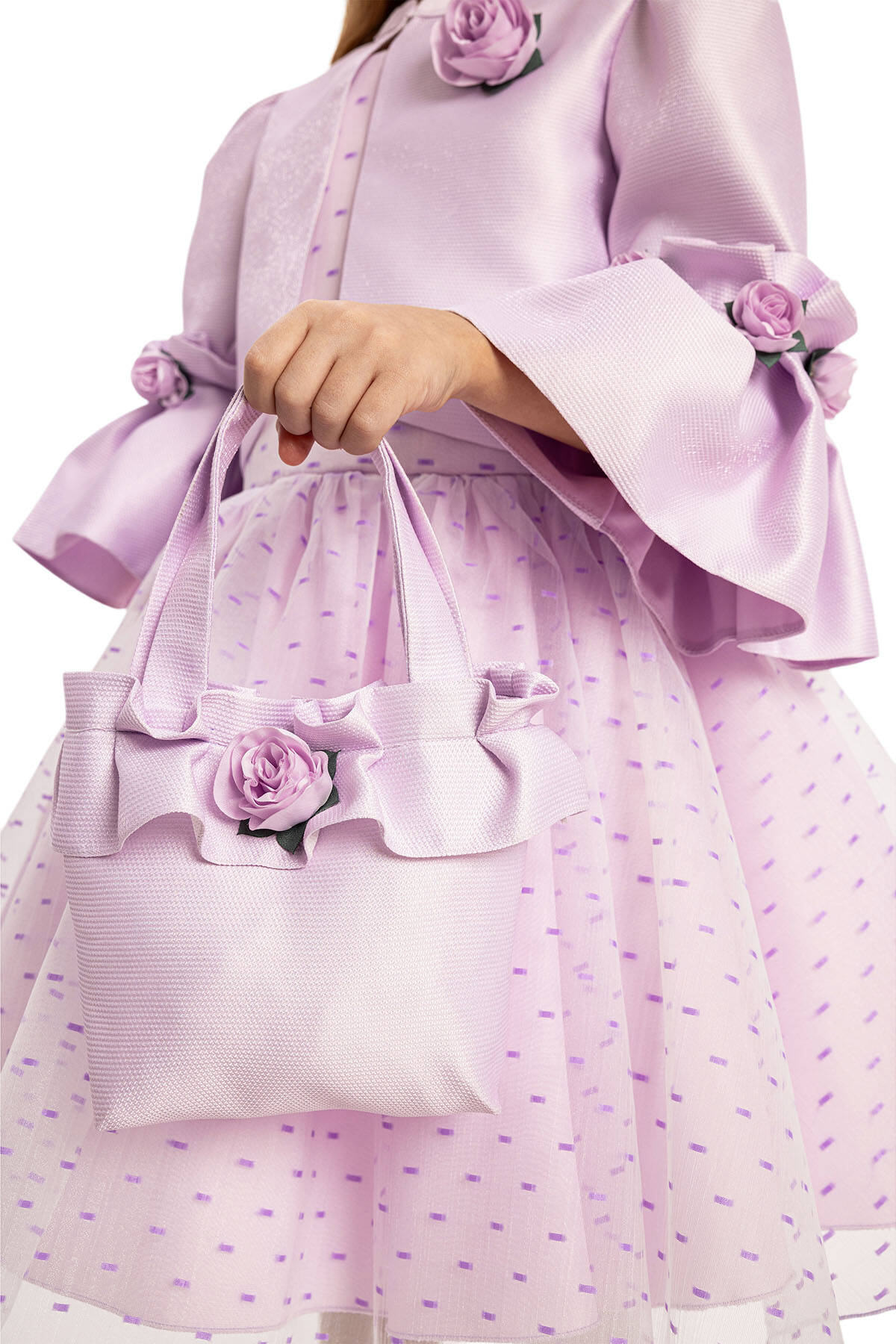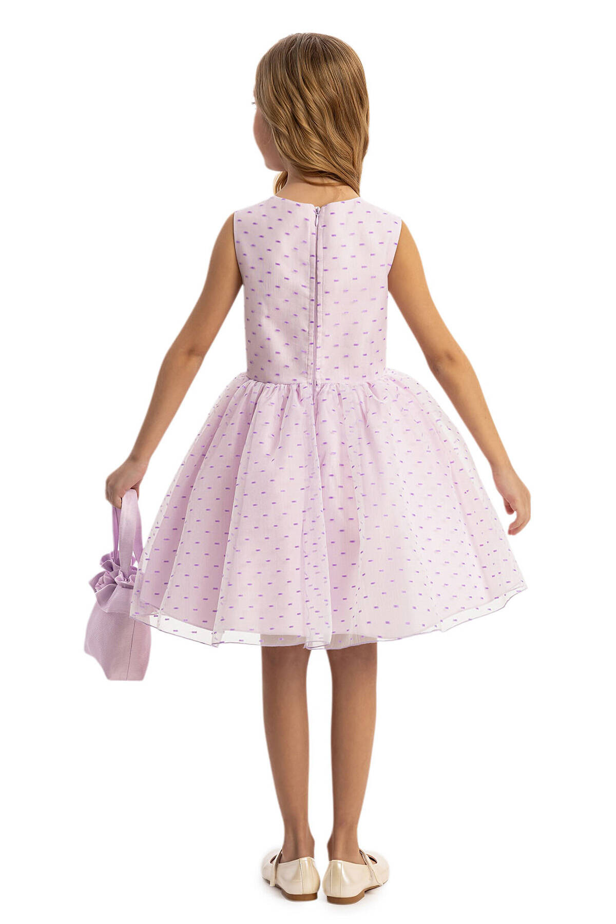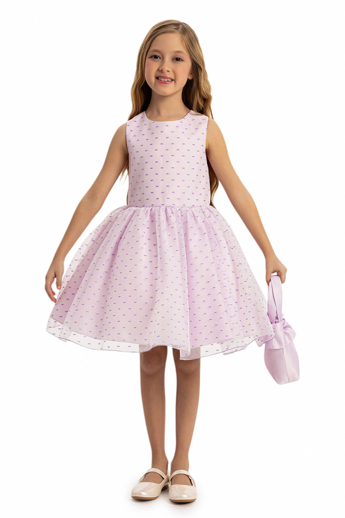 Let your little princess shine in our Pink Polka Dot Dress Set, a stunning combination of style and charm. The sleeveless polka dot dress is designed with a flattering flare silhouette that ensures comfort and grace for every special occasion. This delightful set includes a matching textured jacket with elegant flower details on the sleeves and chest, adding a touch of sophistication. The set is completed with a coordinating bag adorned with a flower embellishment, making it the perfect outfit for weddings, birthdays, or family gatherings.