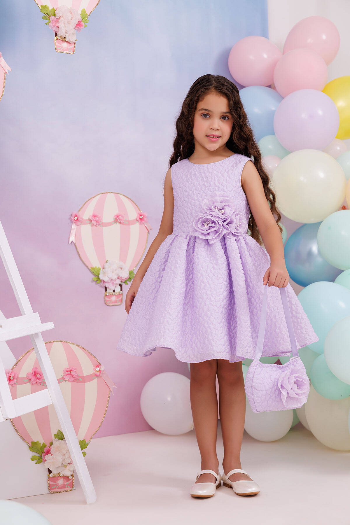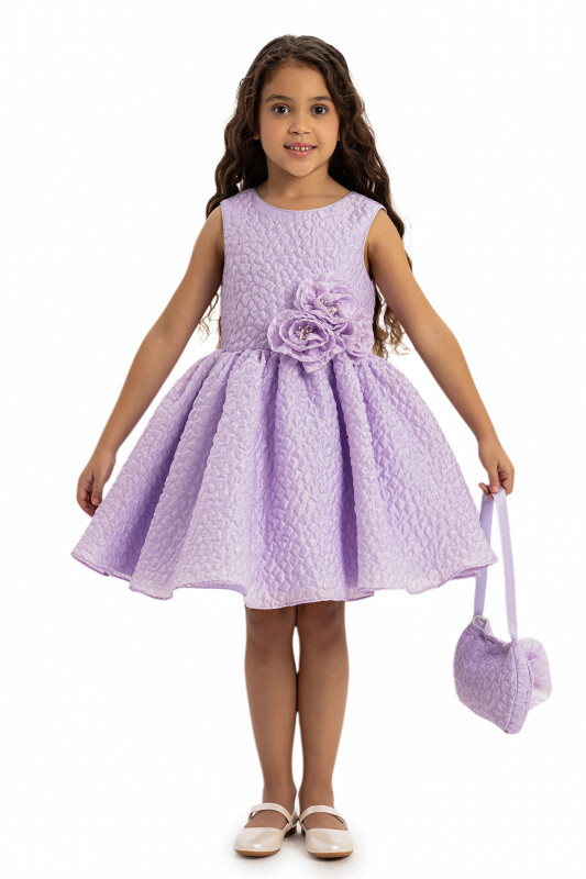 Make every special occasion unforgettable with this elegant textured dress and matching bag set. The dress showcases a soft, crinkled fabric adorned with delicate flower appliqués at the waist for a touch of sophistication. Its flared skirt adds a twirl-worthy charm, perfect for parties or family gatherings. The coordinating bag completes the look, featuring the same textured fabric and a matching flower detail.