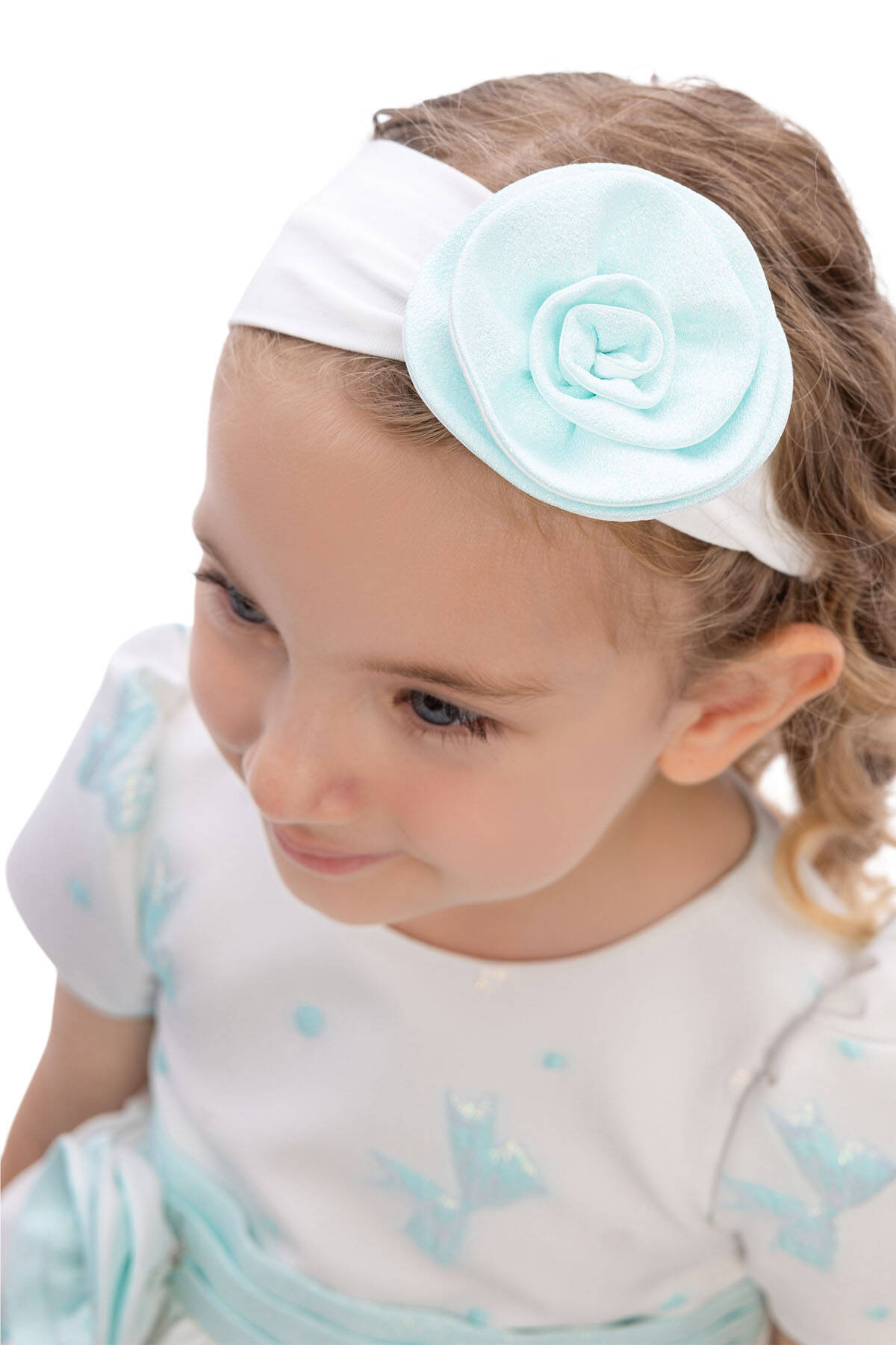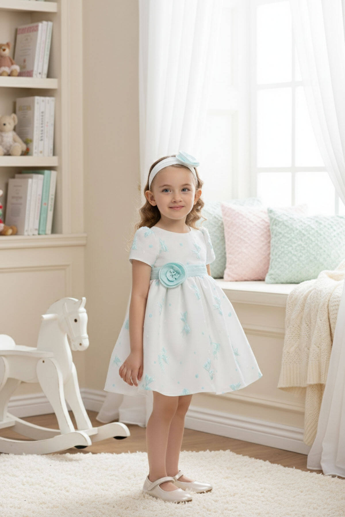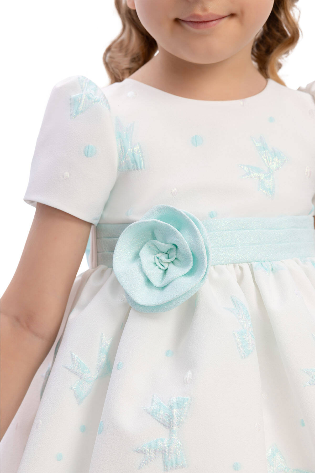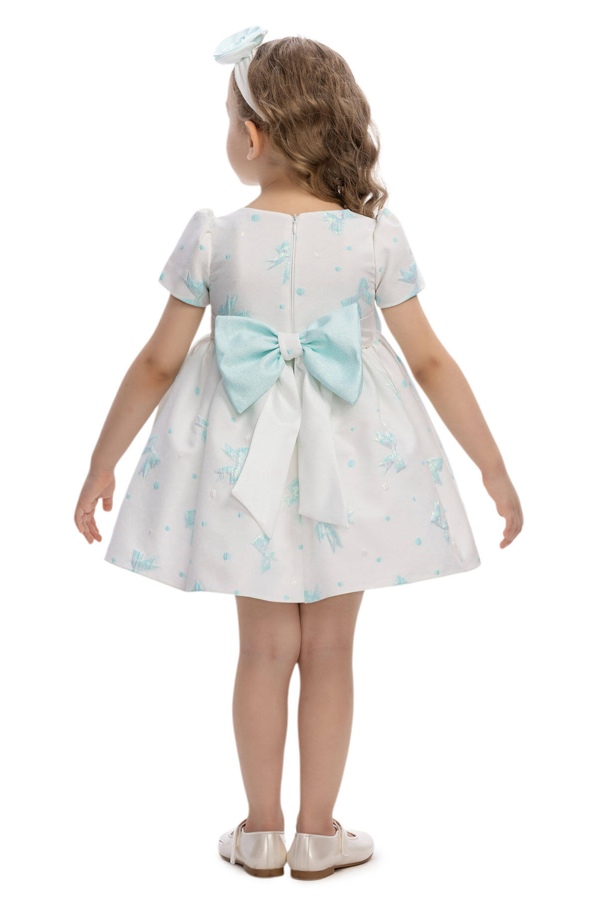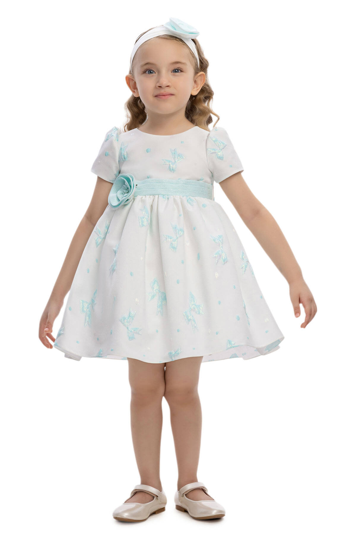 This sweet and elegant baby dress is designed for memorable occasions. The jacquard fabric is adorned with shimmering bow motifs and subtle polka dots, adding a playful yet refined texture. A wide waistband with a fabric flower appliqué highlights the waistline, while the back is finished with an oversized bow for extra charm.Short puff sleeves and a flared skirt create a timeless silhouette, while the matching headband with a coordinating flower detail completes the look. Perfect for birthdays, family gatherings, or special celebrations, this dress ensures your little one looks both stylish and comfortable.