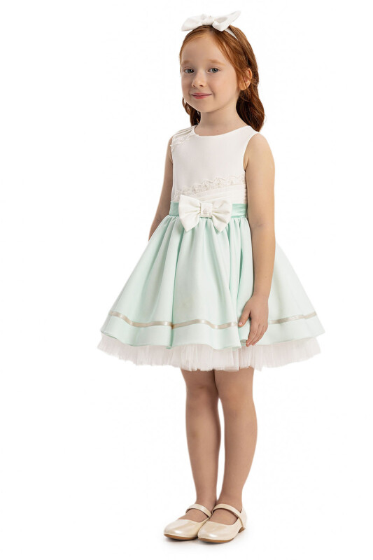 The set includes a charming sleeveless dress and a matching hair accessory. Crafted from soft and lightweight fabric, the dress ensures your baby stays comfortable while looking adorable. The bodice features delicate lace details with subtle beadwork, while the skirt is enhanced with layered tulle for extra volume. A satin bow on the waist and another at the back add a refined touch, creating a picture-perfect outfit. The coordinating hair accessory completes the look, making it a delightful choice for celebrations or memorable photo moments.
