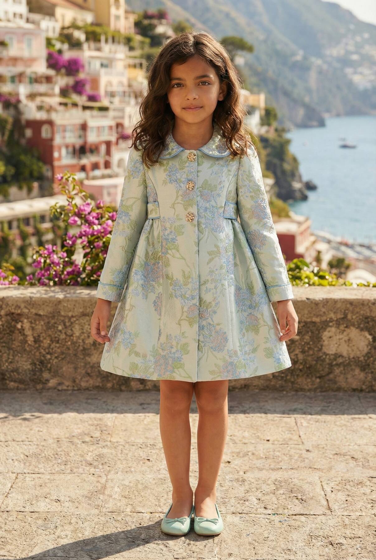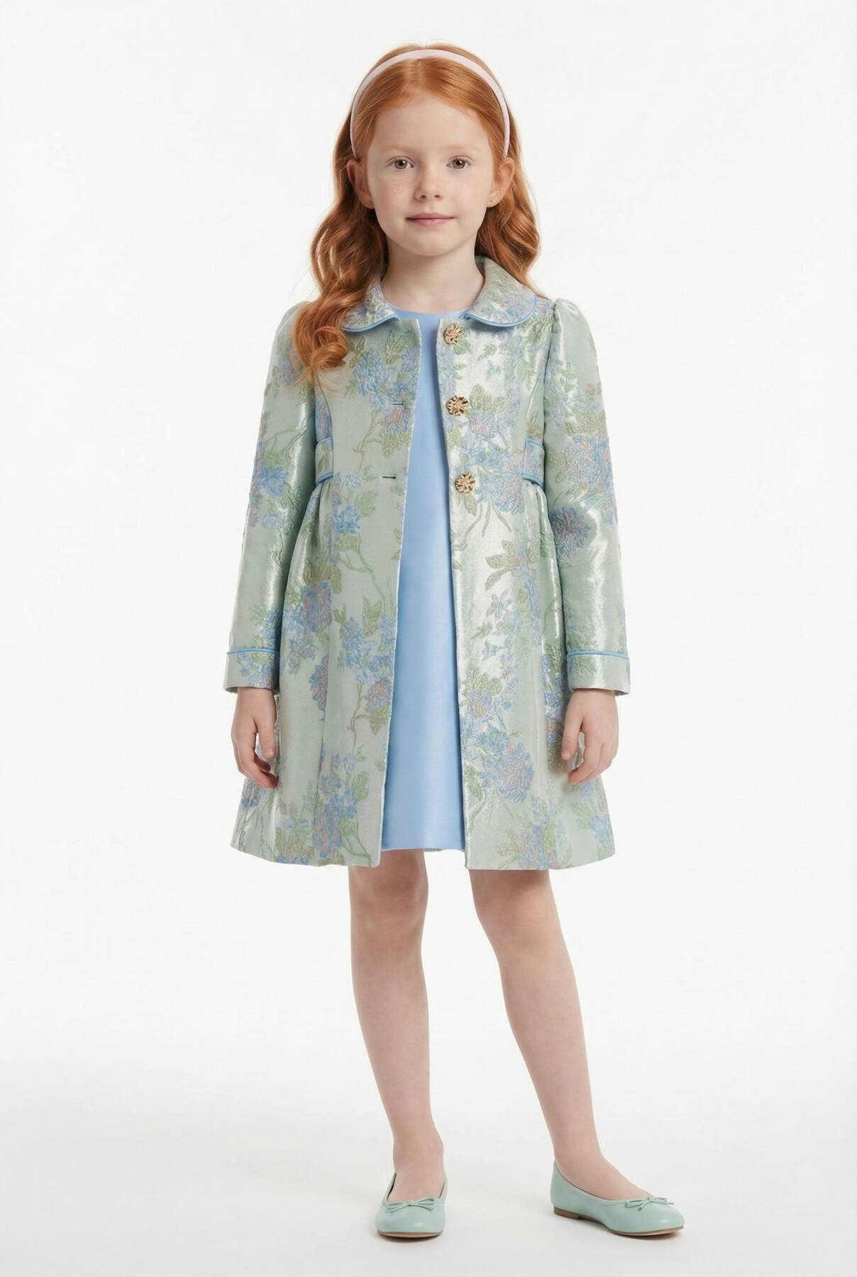 An exquisite choice for little girls who love to dress up with elegance! This sophisticated two-piece set features a soft satin A-line dress paired with a luxurious jacquard coat, detailed with blooming floral patterns in shimmering tones. The coat is fully lined and designed with a classic Peter Pan collar, structured pleats, and sparkling floral buttons for a timeless finish.Worn together, it's the perfect look for weddings, special events, or picture-perfect moments. Worn separately, both pieces add versatility to your little one’s wardrobe. Beauty, comfort, and charm—all in one set.