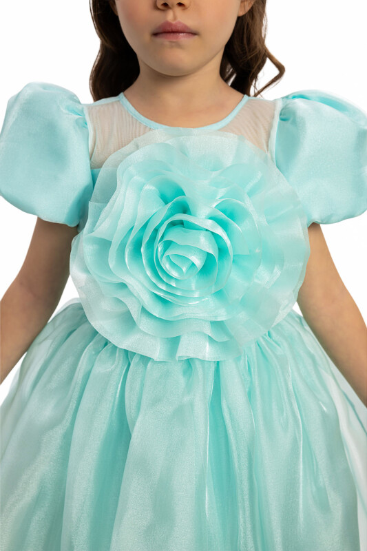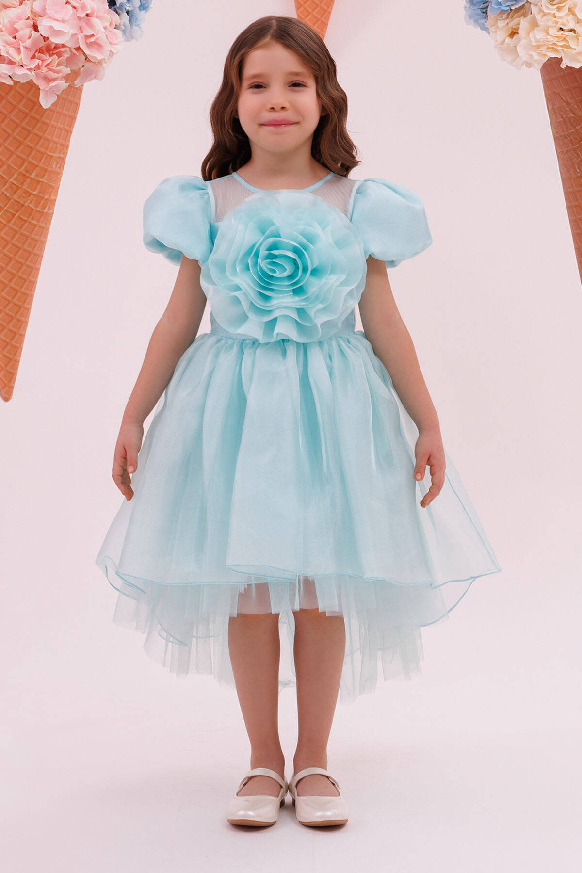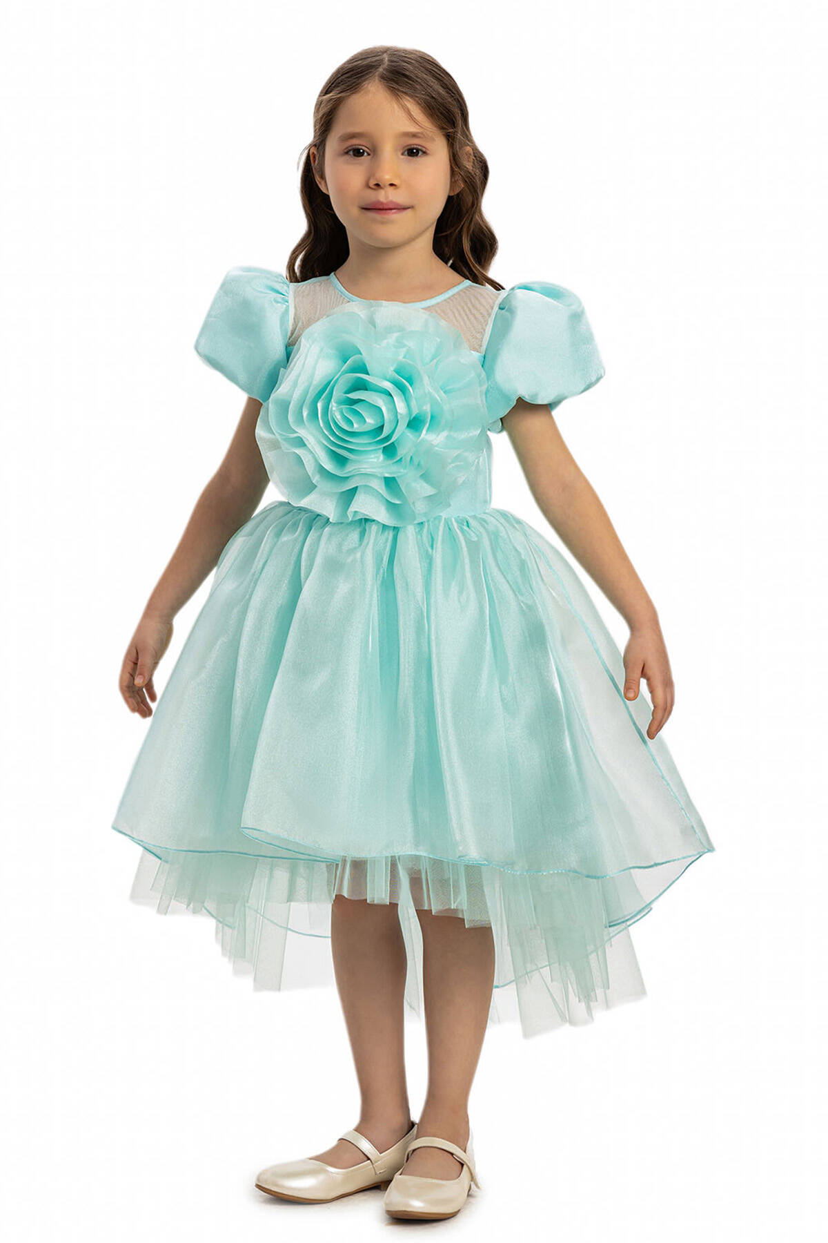 The centerpiece of the design is a stunning oversized flower embellishment on the bodice, perfectly complemented by puff sleeves and a sheer neckline for added charm. The layered skirt features a delicate high-low hem, creating graceful movement and a whimsical silhouette. The lace-up back detail adds an extra touch of sophistication, ensuring a perfect fit while enhancing the overall design. Whether for birthdays, parties, or other special occasions, this dress offers the perfect blend of style and comfort.