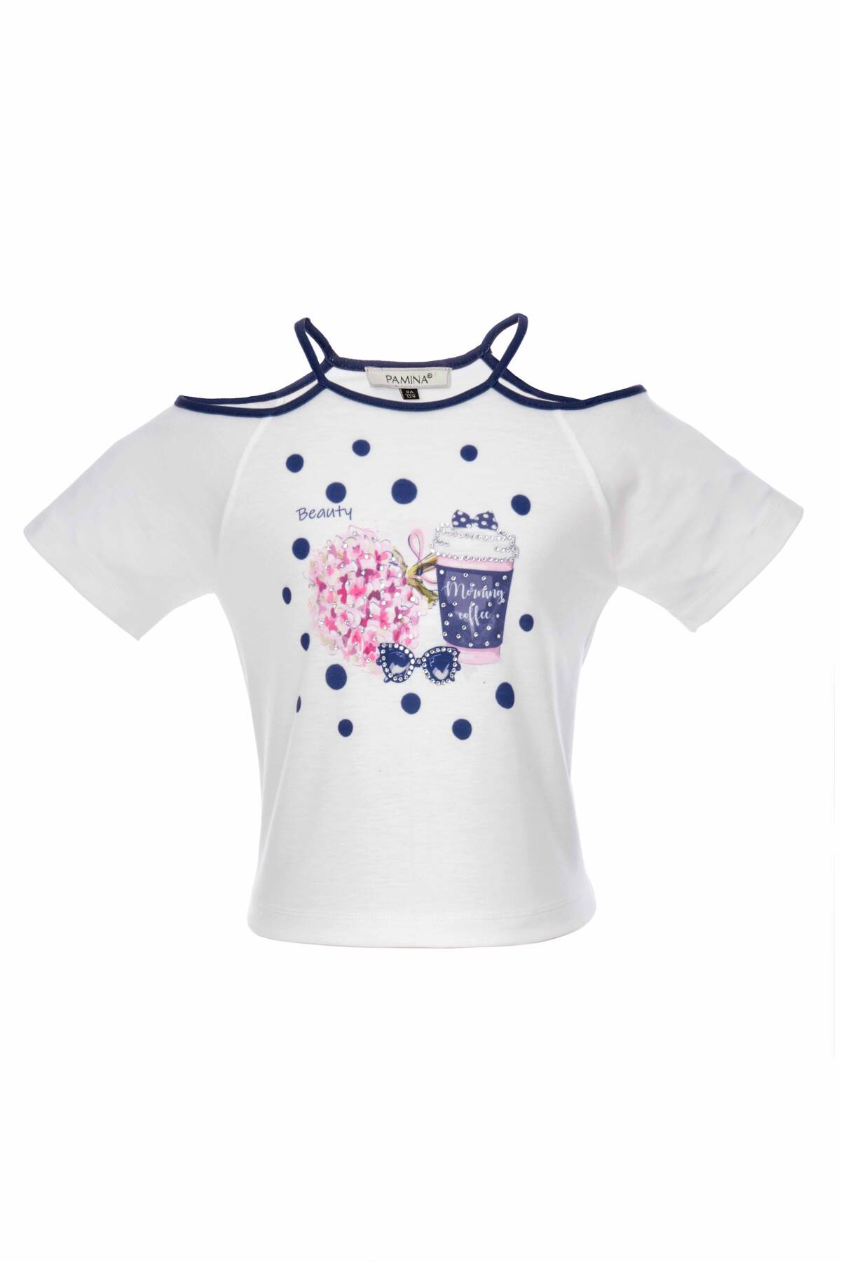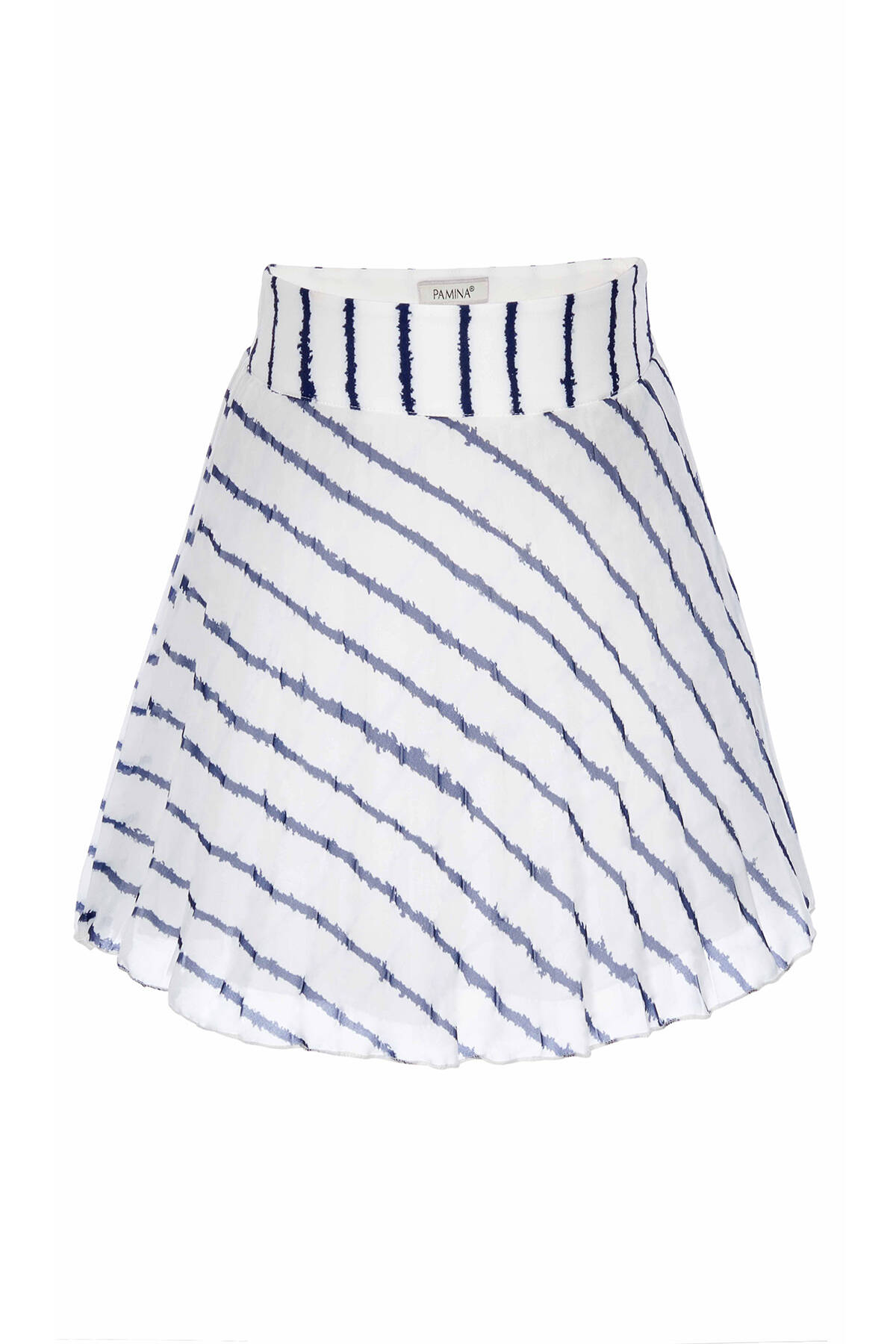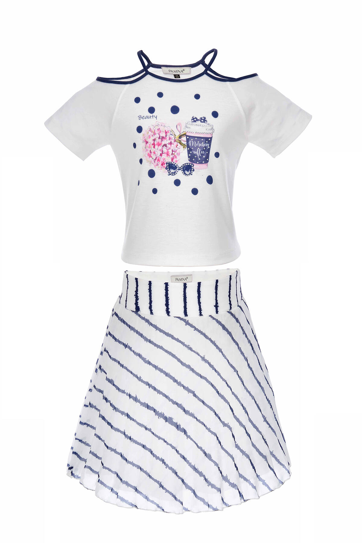 "Cotton lining is used in our skirt for extra comfort. Our T-shirt has digital and stone printing and window detail on the shoulders. Our canton crepe skirt has a non skin contact invisible zipper. Gentle hand washing only. Should be ironed with steam or at low heat."