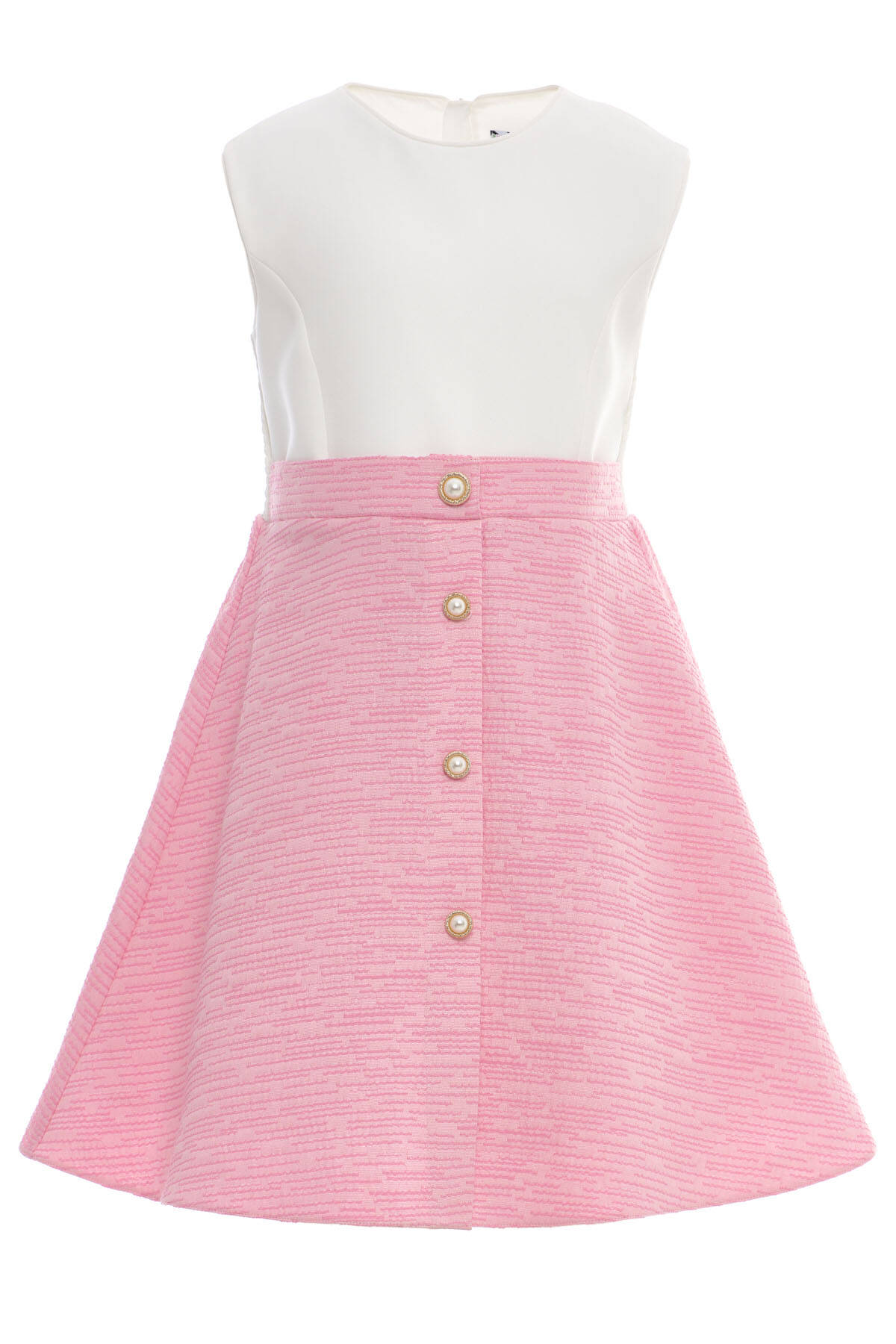 A chic and timeless two-piece set for young girls with classic taste. The sleeveless A-line dress features a textured woven skirt and a smooth ivory bodice with elastic shirring at the sides for a comfortable fit. The coordinating cropped jacket is crafted from the same textured fabric, accented with pearl-embellished buttons, white contrast pocket flaps, and a crisp collar for a polished finish. Soft structure, rich texture, and thoughtful tailoring come together in this elegant look—perfect for special events, ceremonies, or family gatherings.