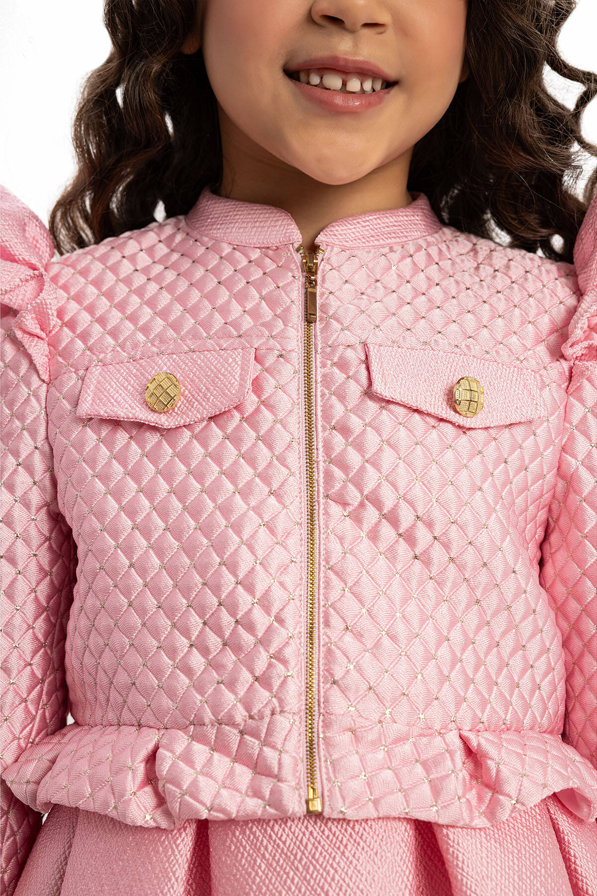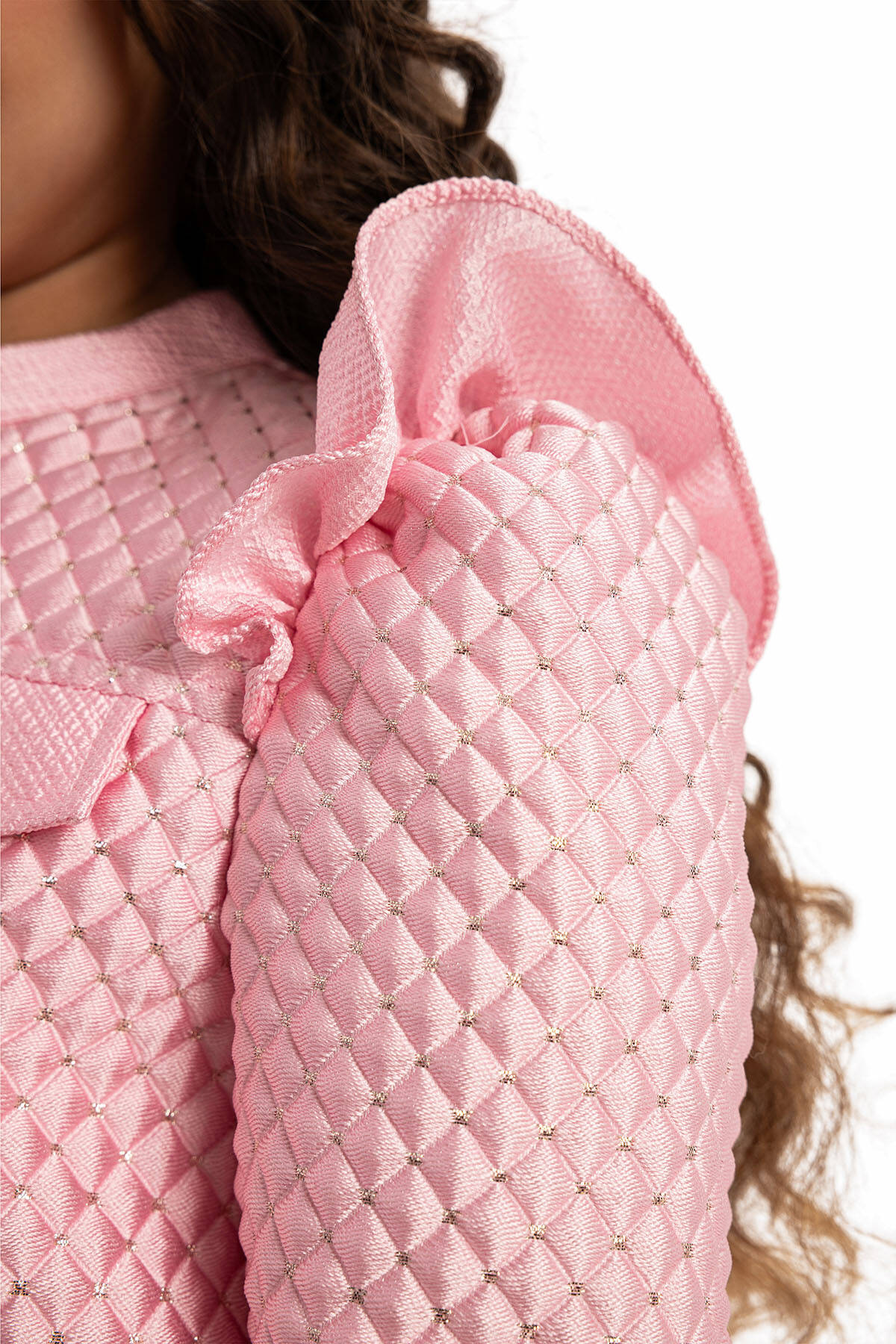 This delightful dress set combines style and functionality, making it the perfect choice for special occasions. Crafted from high-quality quilted and textured jacquard fabric, offering both a luxurious feel and durability. The fabric’s subtle shimmer adds an extra touch of charm. Features long sleeves, gold-tone buttons, and decorative flap pockets for a sophisticated look. Ruffled accents at the shoulders and hemline enhance its chic appeal. A matching quilted handbag with metallic details and a convenient handle, perfectly complementing the outfit.