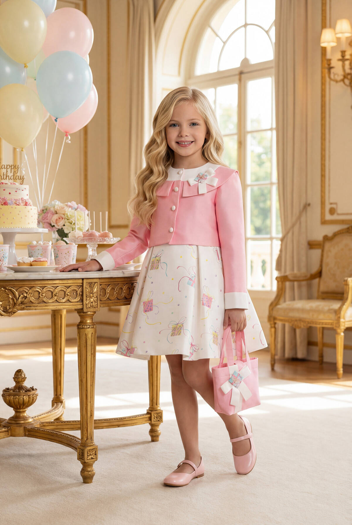This charming 3-piece set is perfect for your little one's special occasions. The set includes a delightful sleeveless dress, a chic matching jacket, and an adorable hair accessory. Made from high-quality satin fabric, the dress features a playful print of gift boxes and ribbons, adding a whimsical touch. The coordinating jacket with pearl button details and a bow embellishment ensures an elegant finish. The hair accessory completes the look with a delightful bow that ties the outfit together.