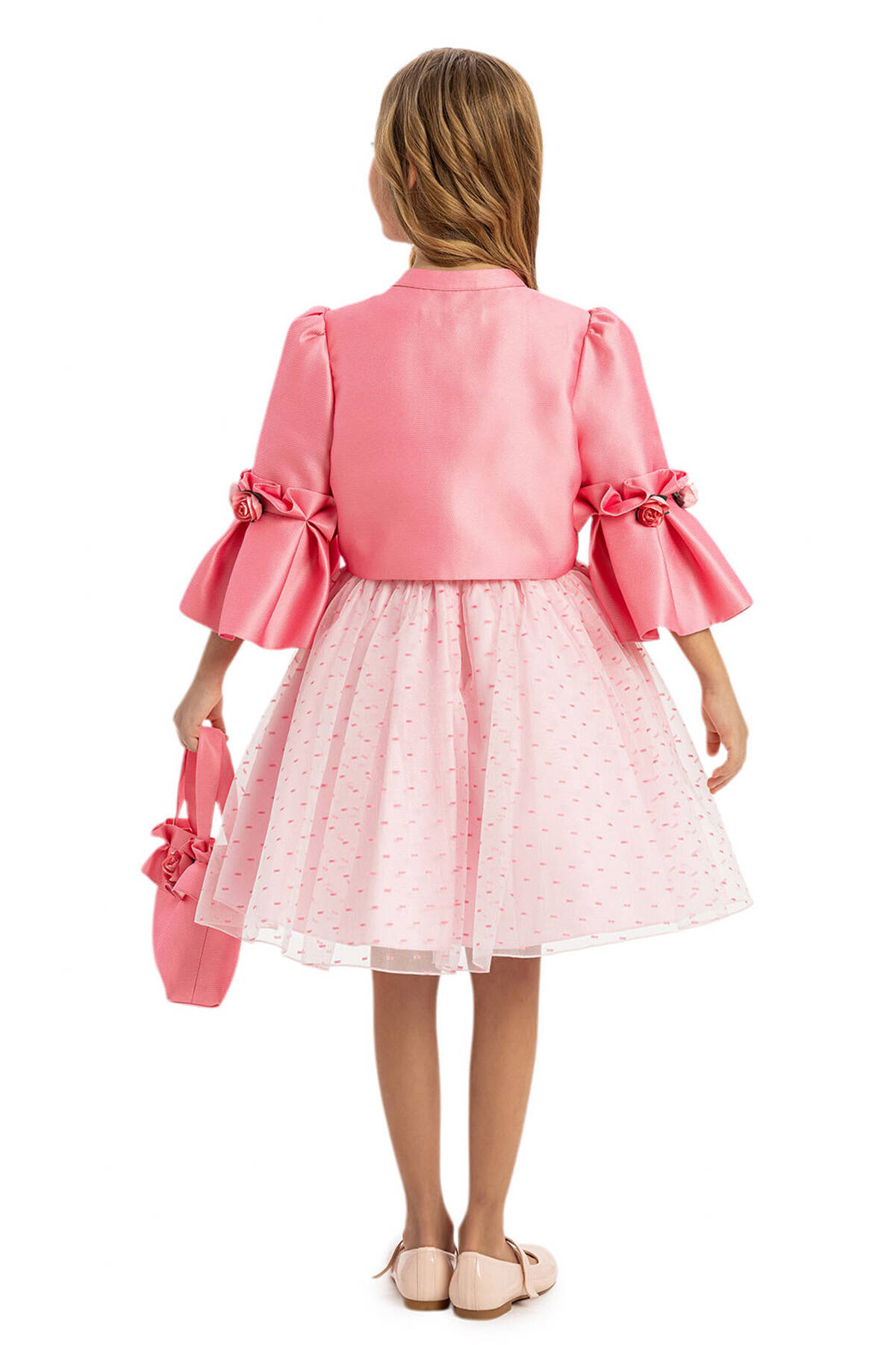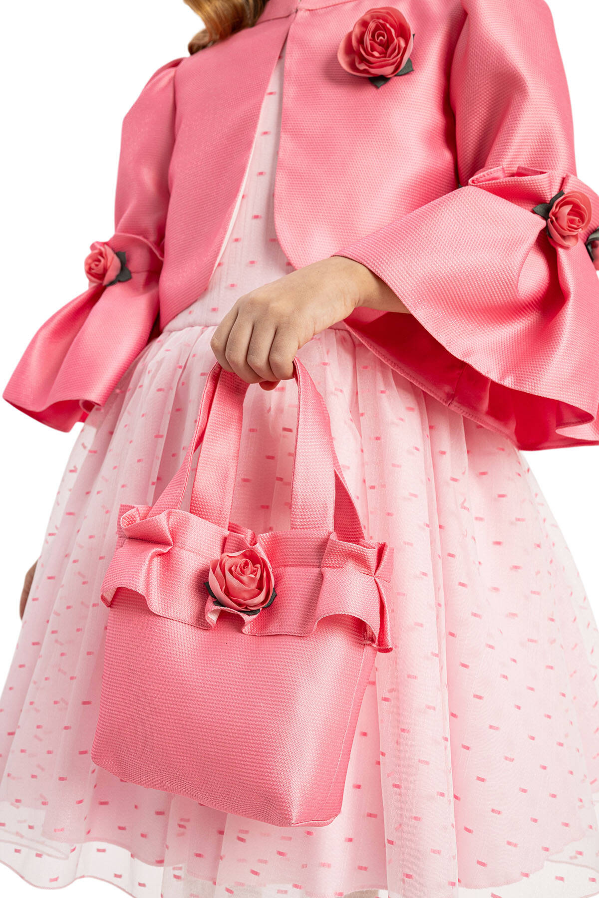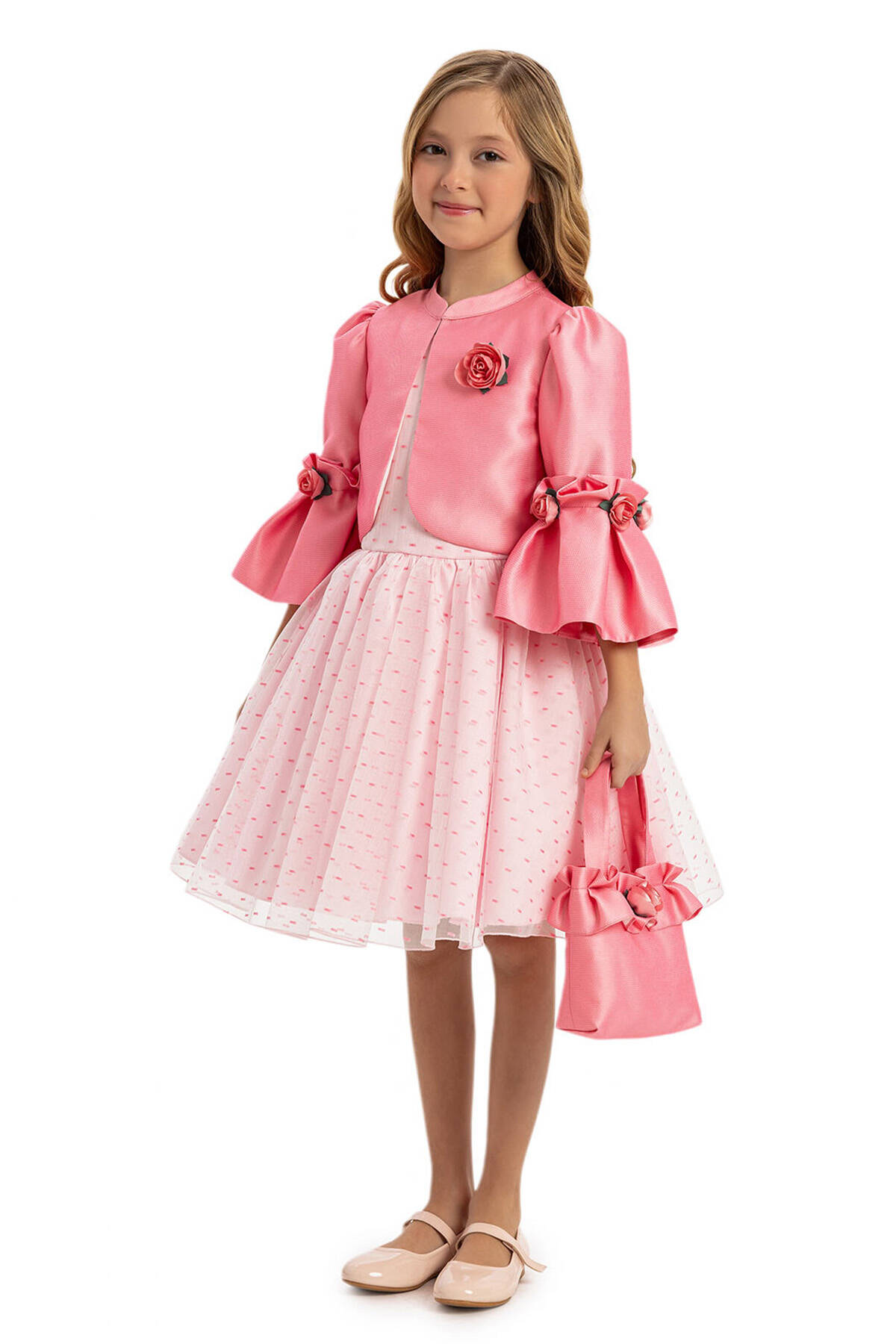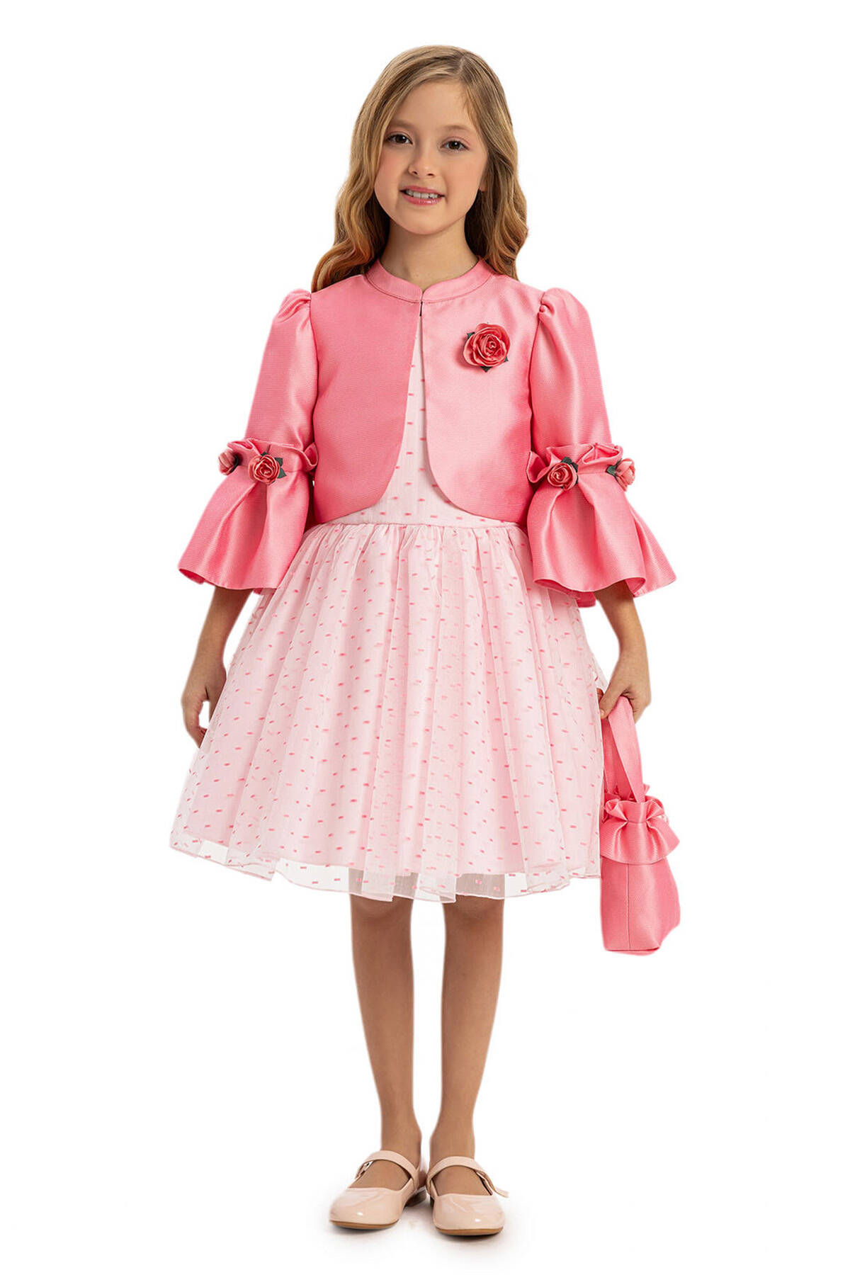 Let your little princess shine in our Pink Polka Dot Dress Set, a stunning combination of style and charm. The sleeveless polka dot dress is designed with a flattering flare silhouette that ensures comfort and grace for every special occasion. This delightful set includes a matching textured jacket with elegant flower details on the sleeves and chest, adding a touch of sophistication. The set is completed with a coordinating bag adorned with a flower embellishment, making it the perfect outfit for weddings, birthdays, or family gatherings.