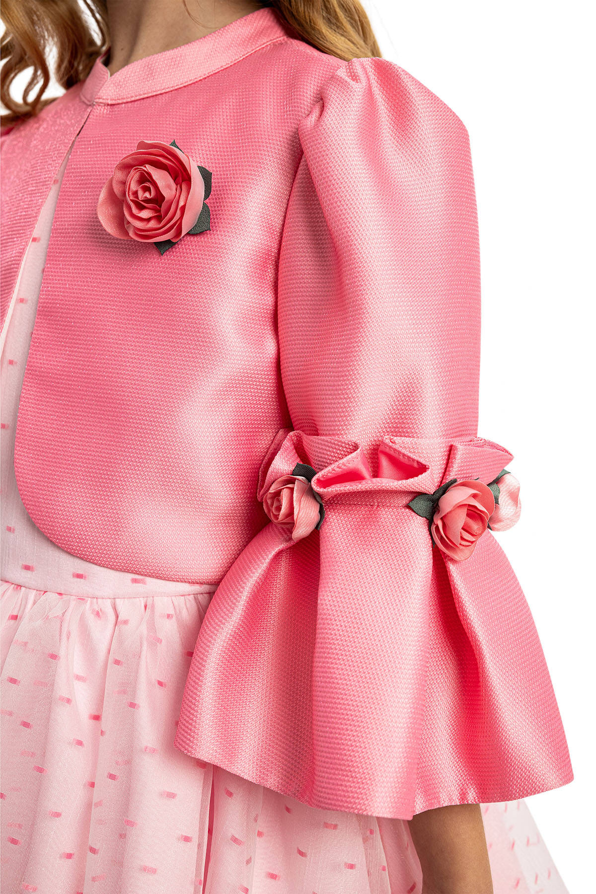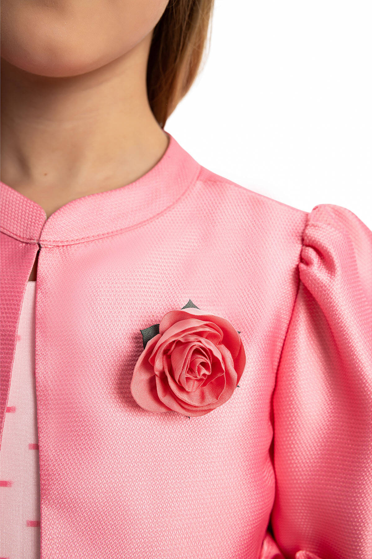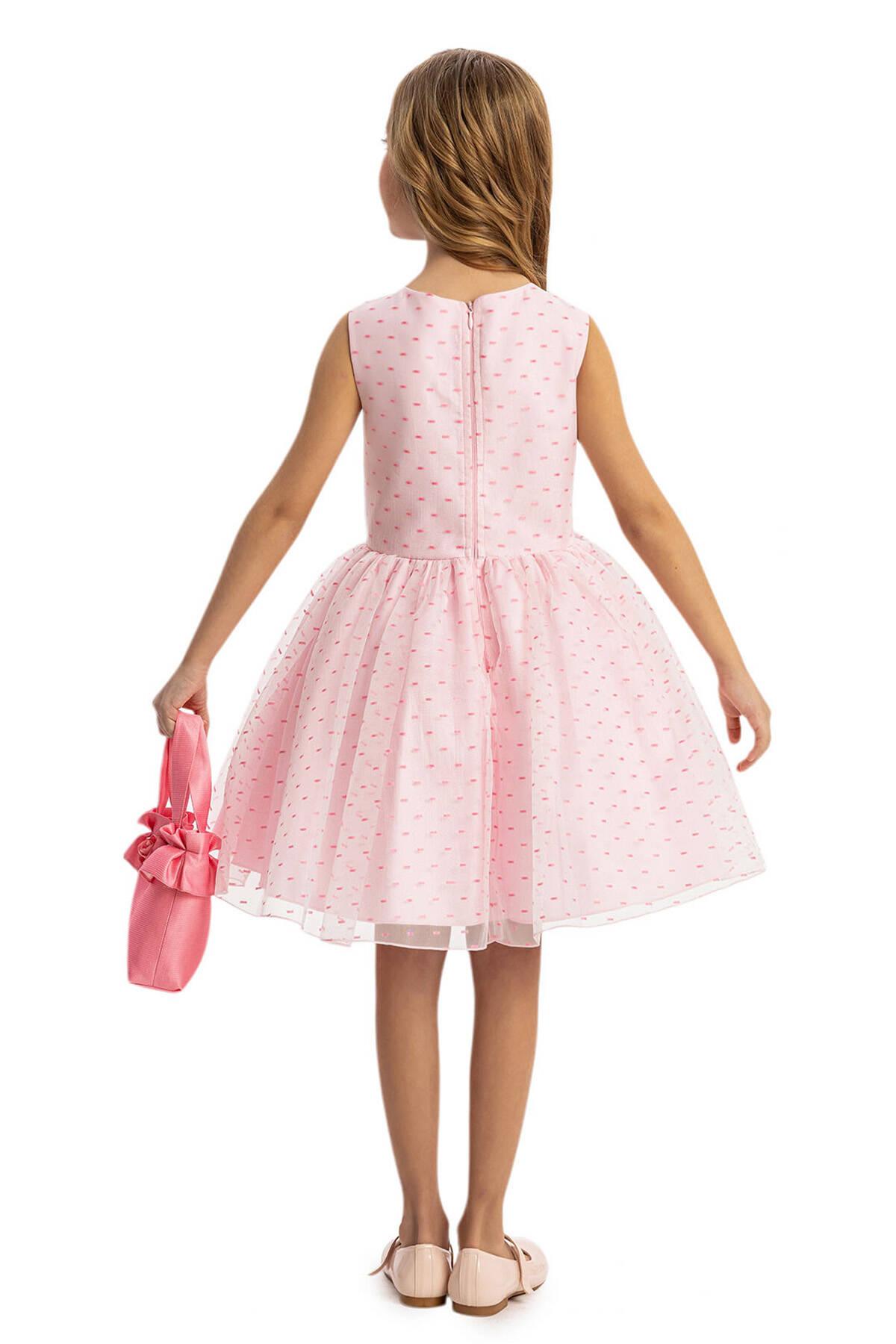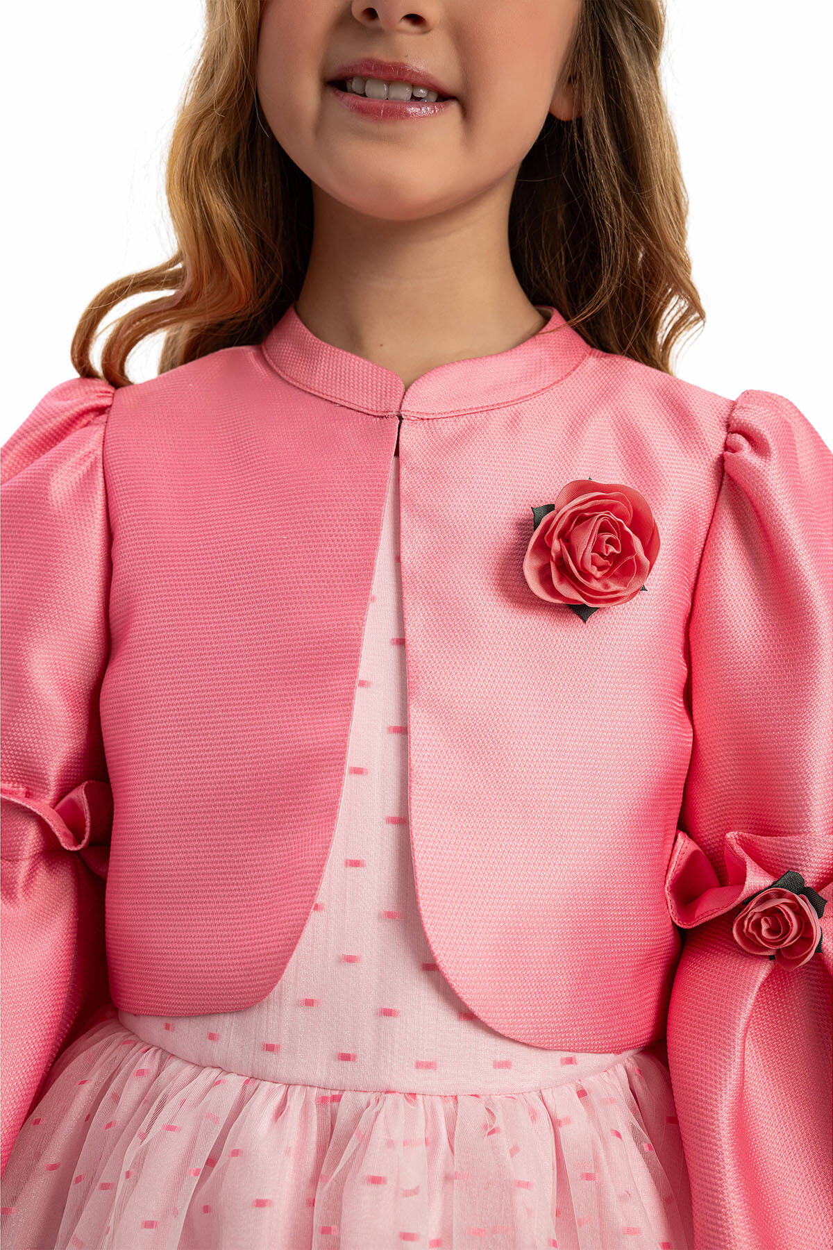 Let your little princess shine in our Pink Polka Dot Dress Set, a stunning combination of style and charm. The sleeveless polka dot dress is designed with a flattering flare silhouette that ensures comfort and grace for every special occasion. This delightful set includes a matching textured jacket with elegant flower details on the sleeves and chest, adding a touch of sophistication. The set is completed with a coordinating bag adorned with a flower embellishment, making it the perfect outfit for weddings, birthdays, or family gatherings.