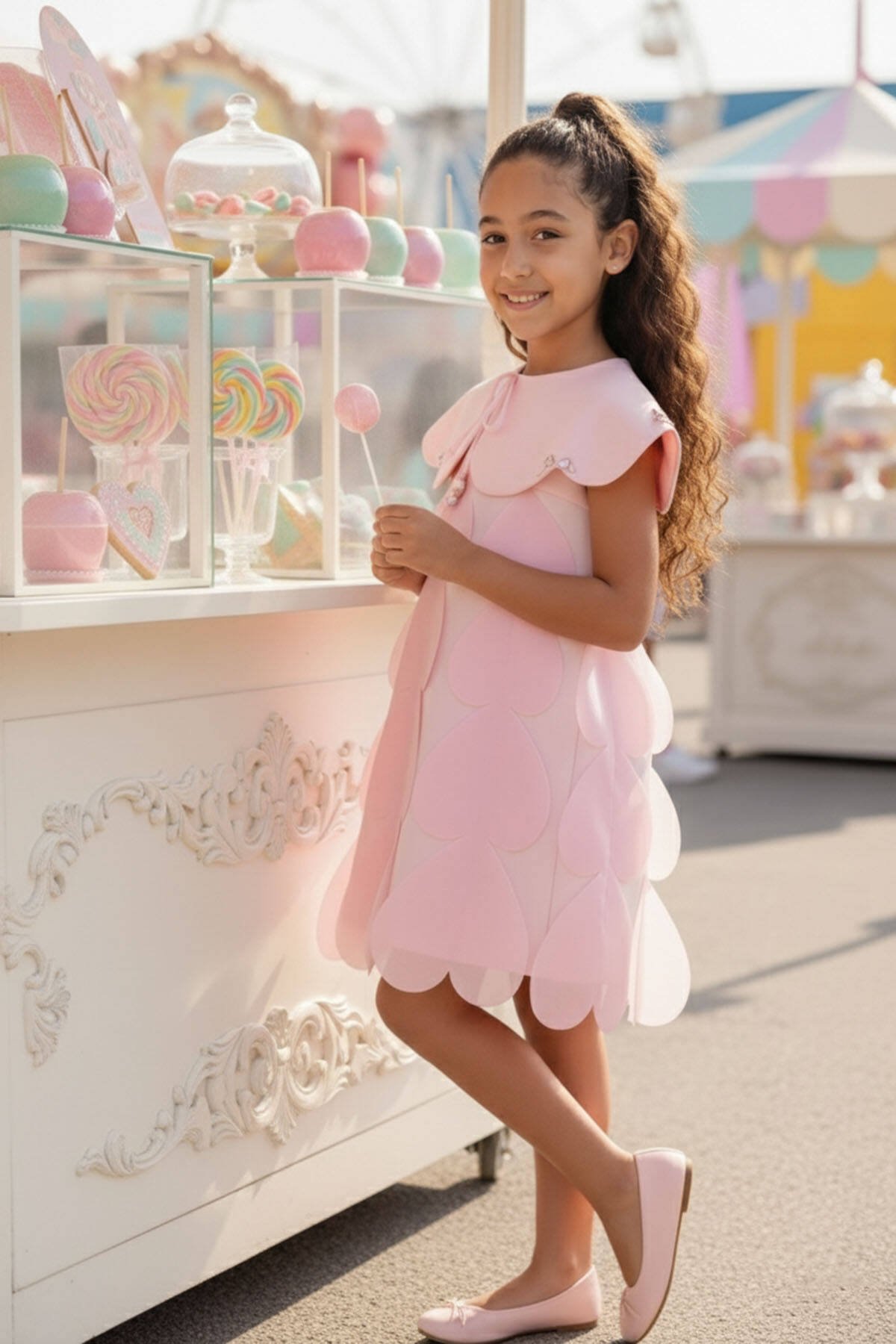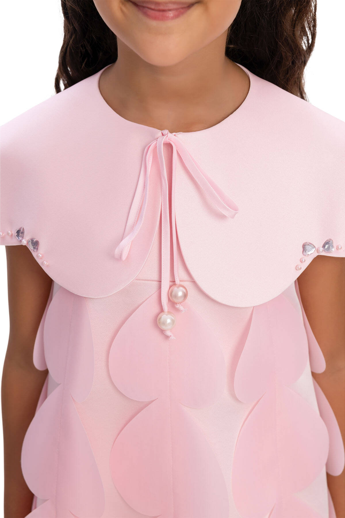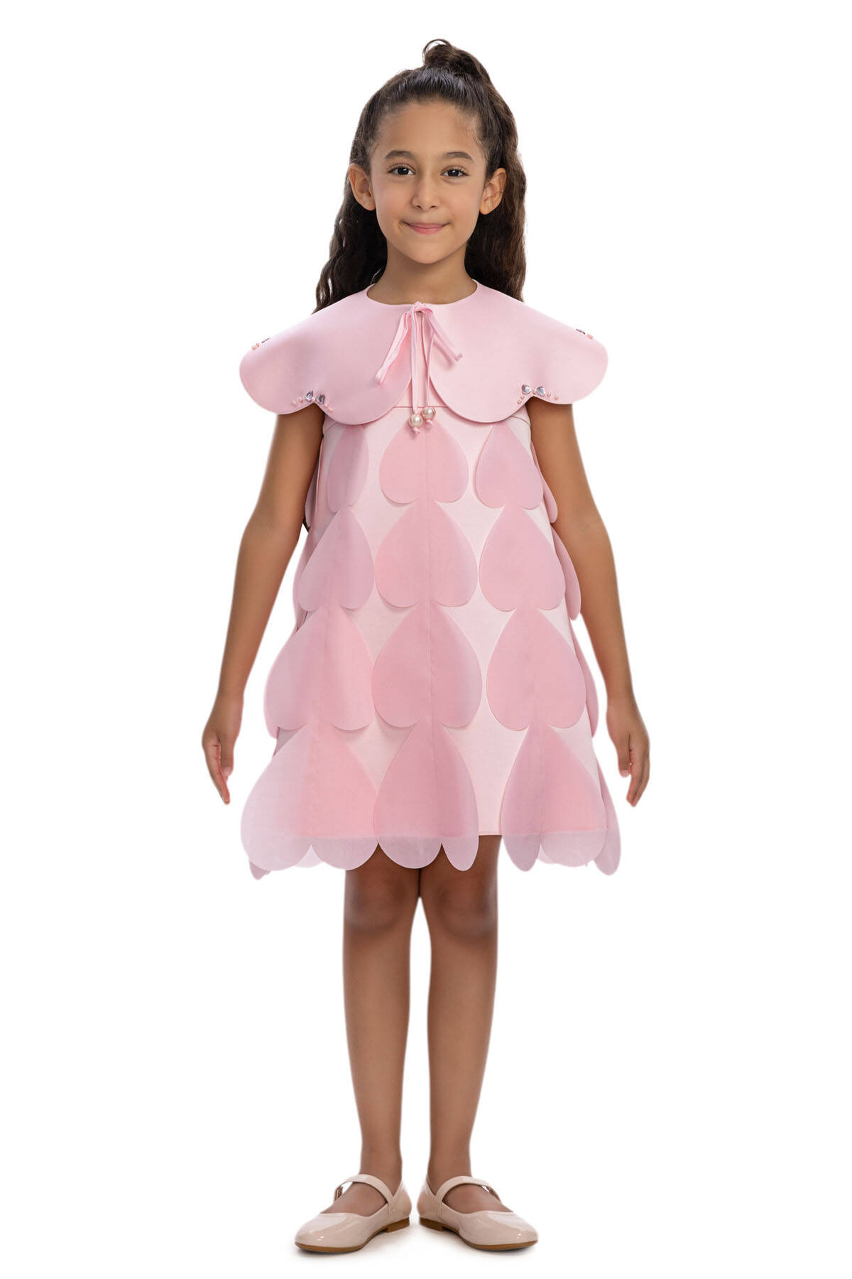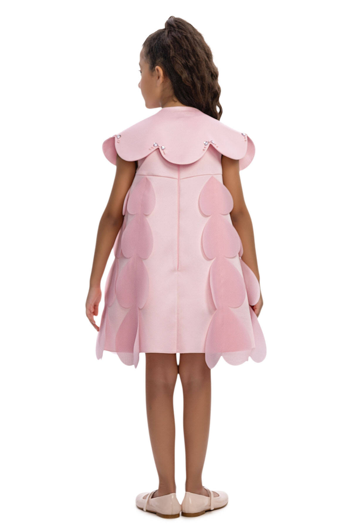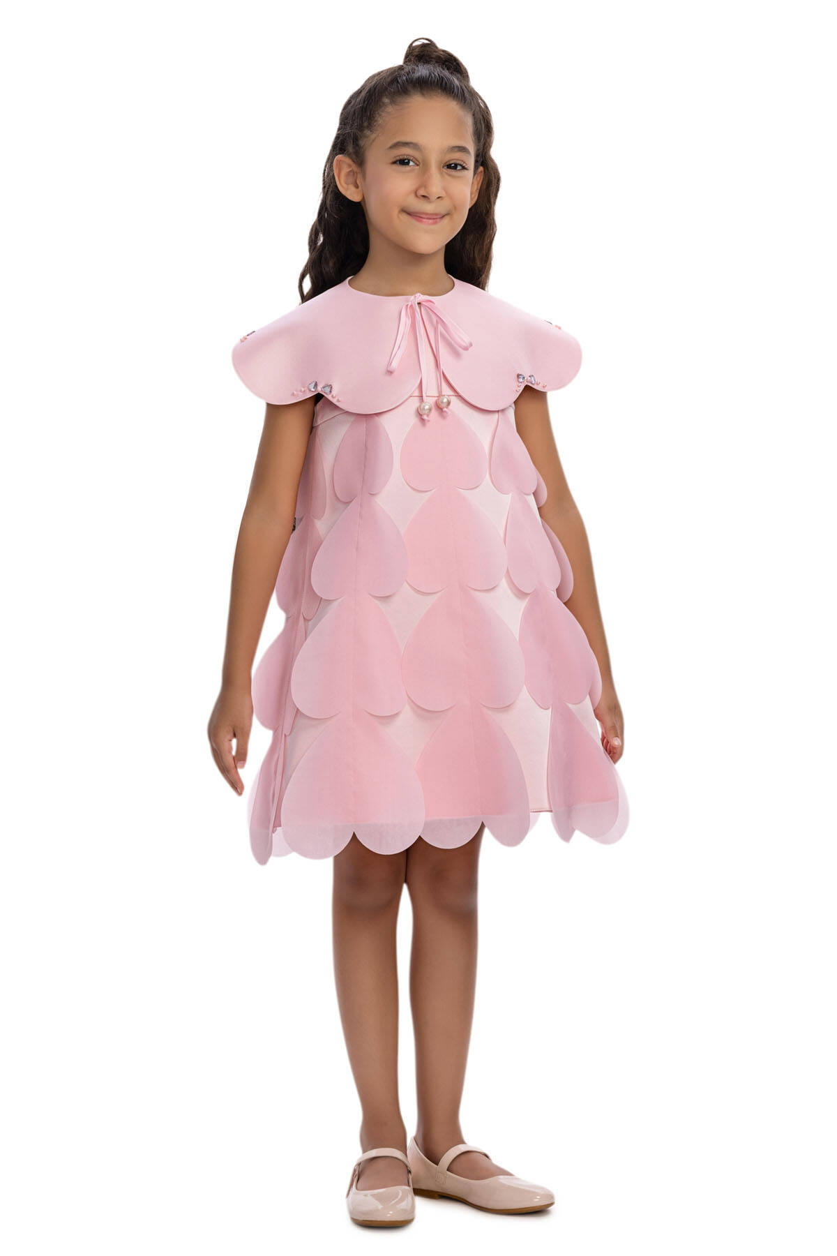 A modern and playful design that makes every little girl feel special! This dress is crafted with layered petal-shaped/ heart-shaped appliqués, creating a unique 3D texture and a stylish silhouette. The look is elevated with a removable oversized collar, detailed with pearls and rhinestones for a touch of sparkle. Worn with the collar, the dress has a chic and polished appearance; without it, it becomes a fun, minimal statement piece. Soft lining ensures comfort, making this dress perfect for birthdays, parties, and all special occasions where she deserves to shine.