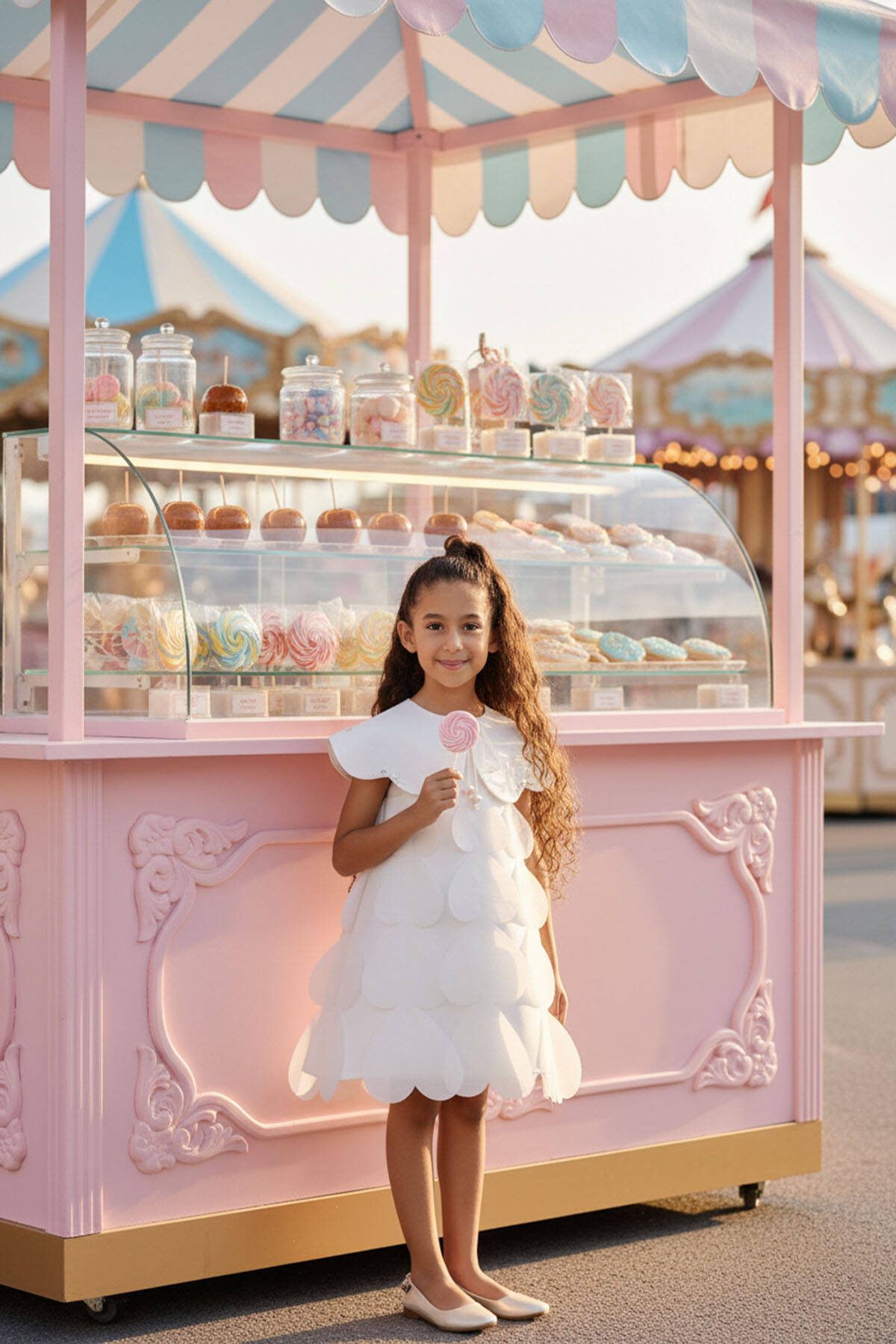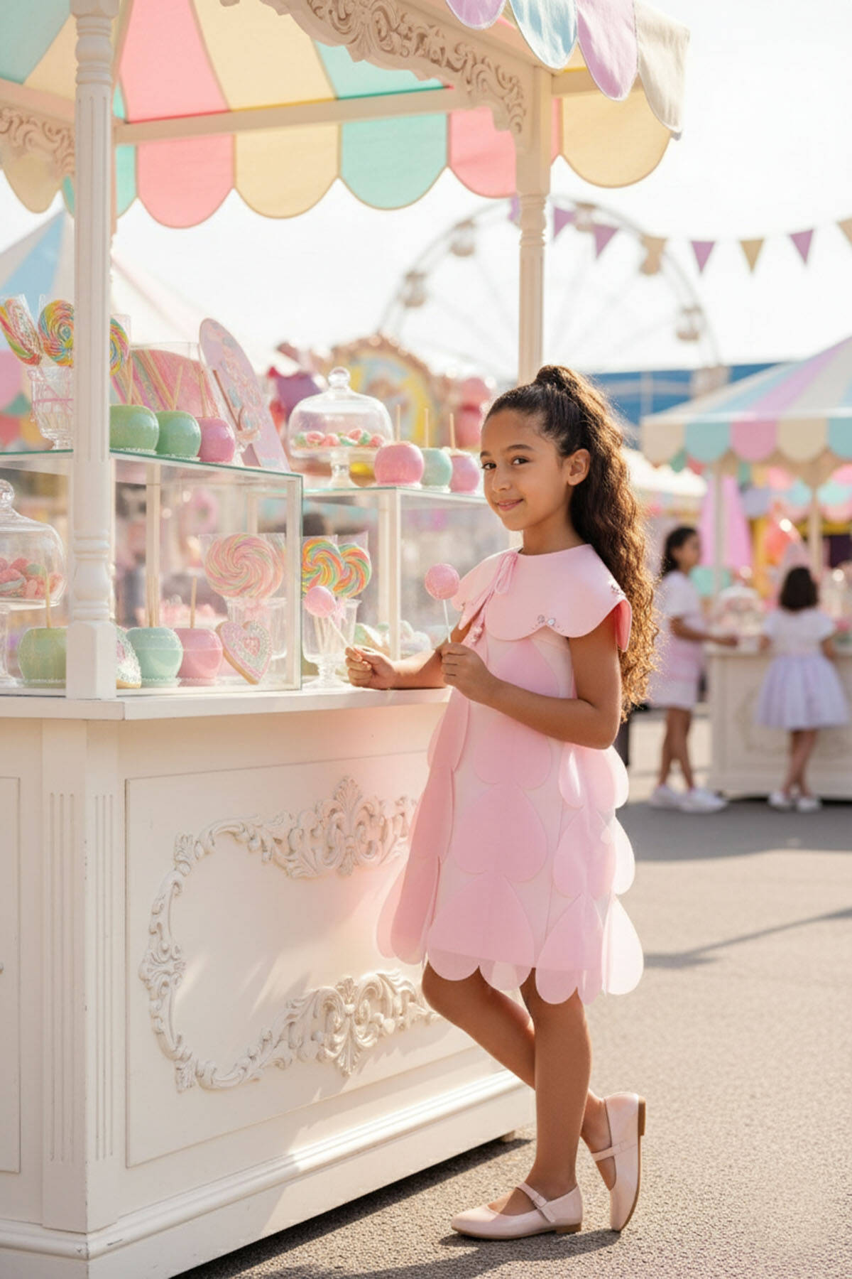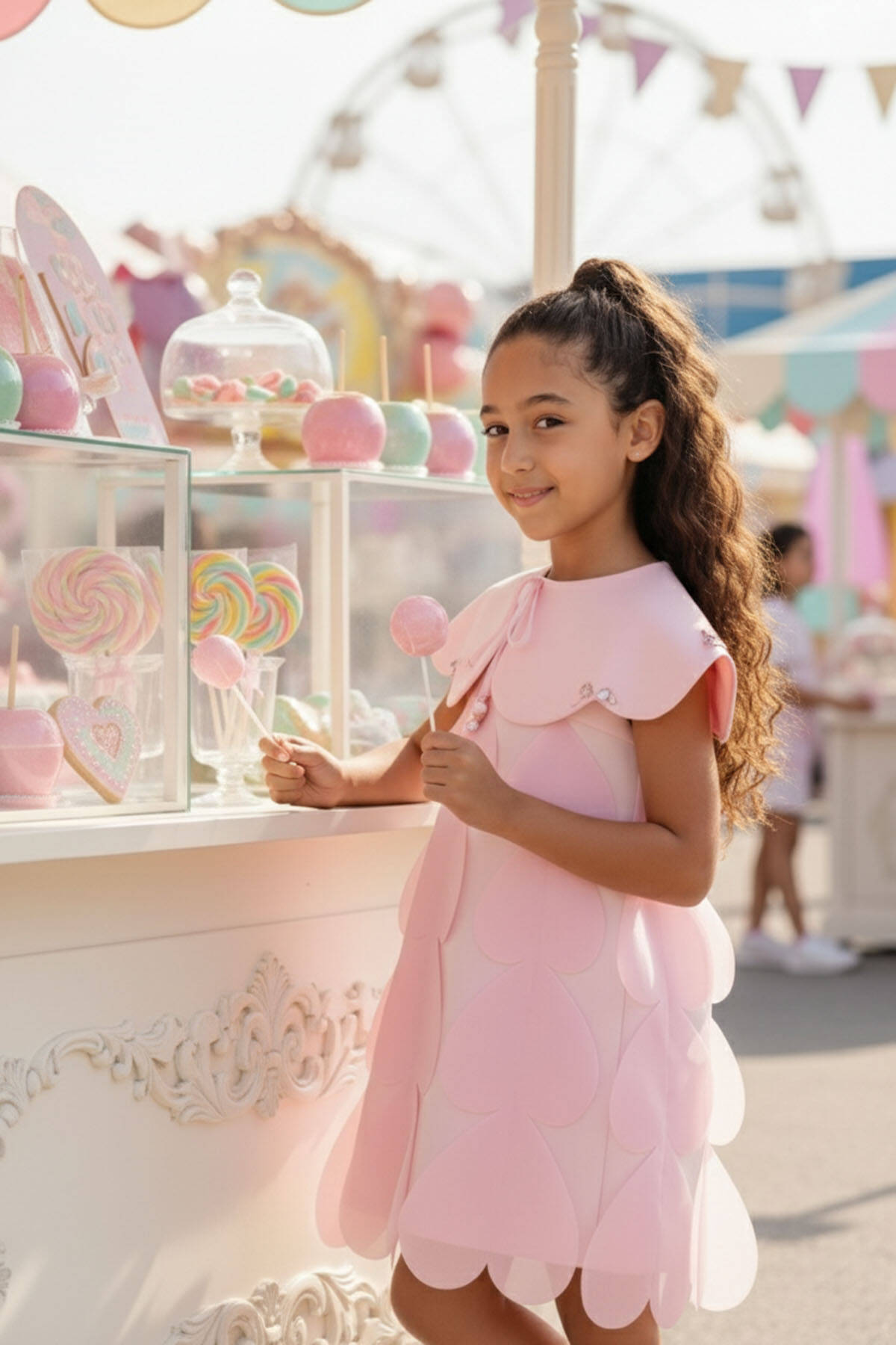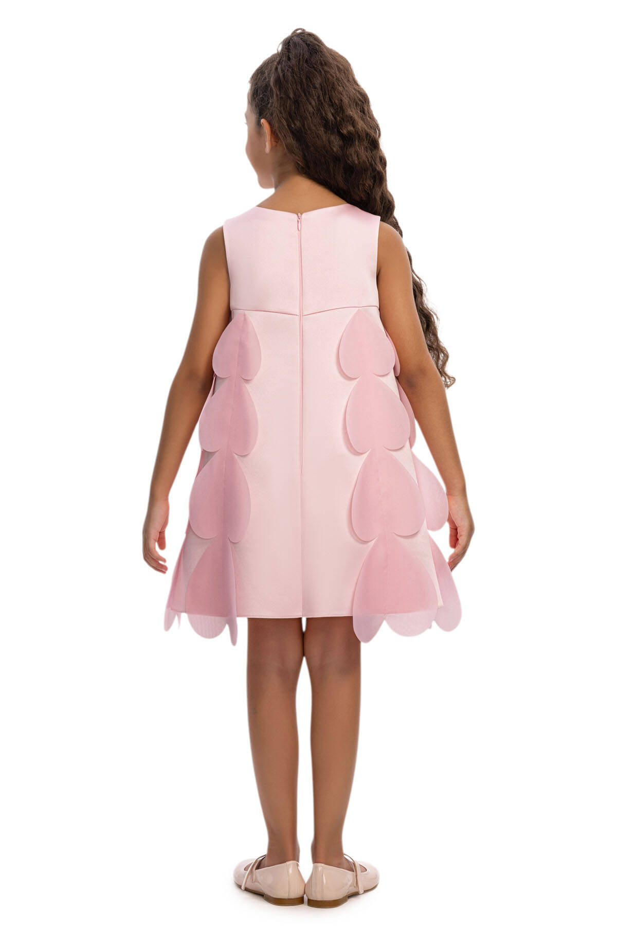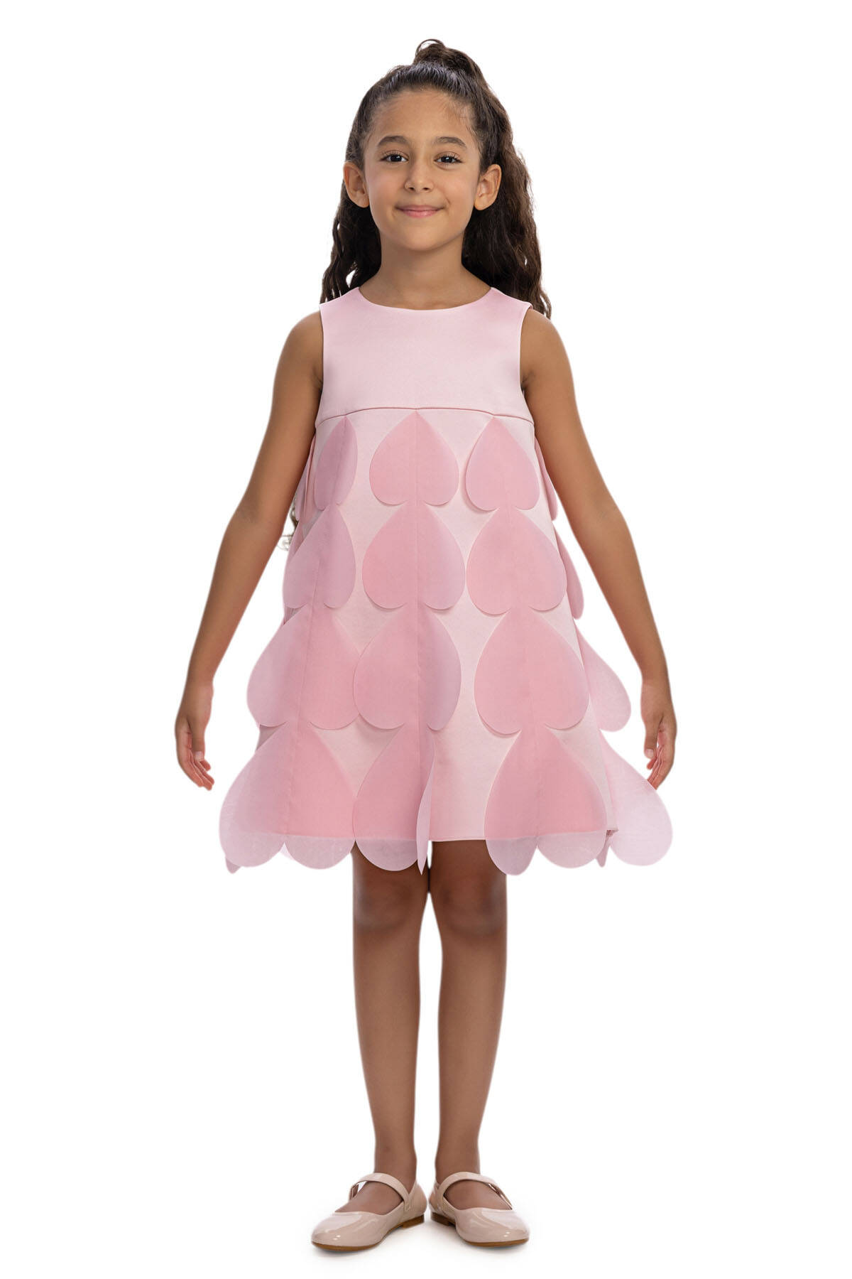 A modern and playful design that makes every little girl feel special! This dress is crafted with layered petal-shaped/ heart-shaped appliqués, creating a unique 3D texture and a stylish silhouette. The look is elevated with a removable oversized collar, detailed with pearls and rhinestones for a touch of sparkle. Worn with the collar, the dress has a chic and polished appearance; without it, it becomes a fun, minimal statement piece. Soft lining ensures comfort, making this dress perfect for birthdays, parties, and all special occasions where she deserves to shine.