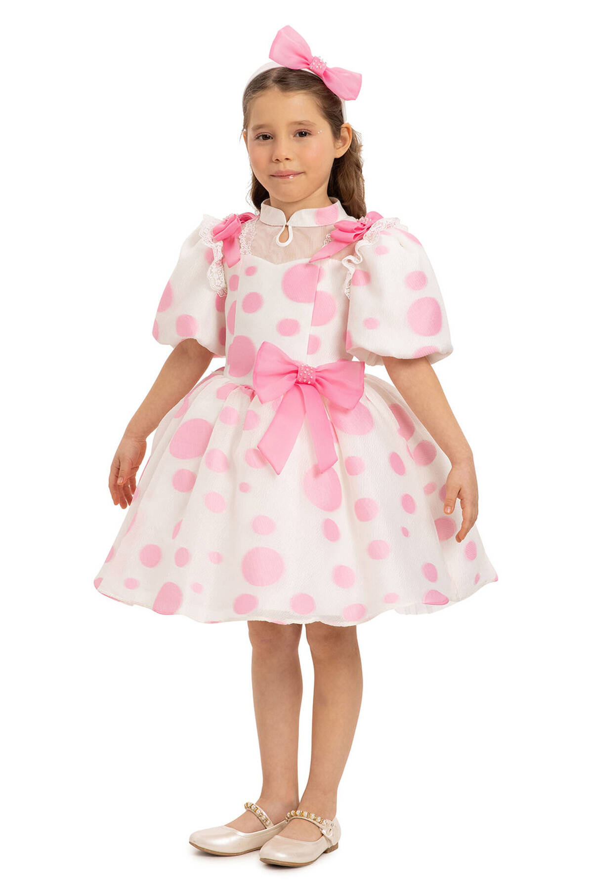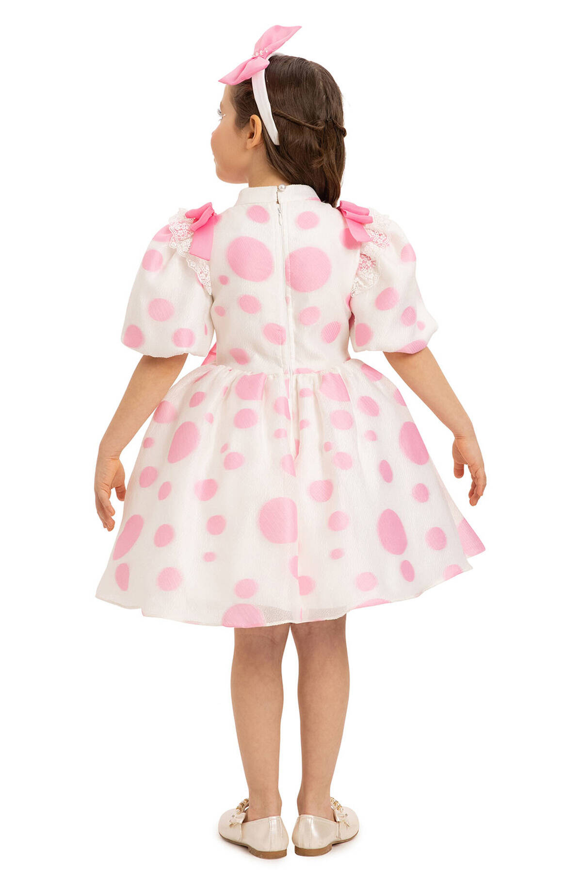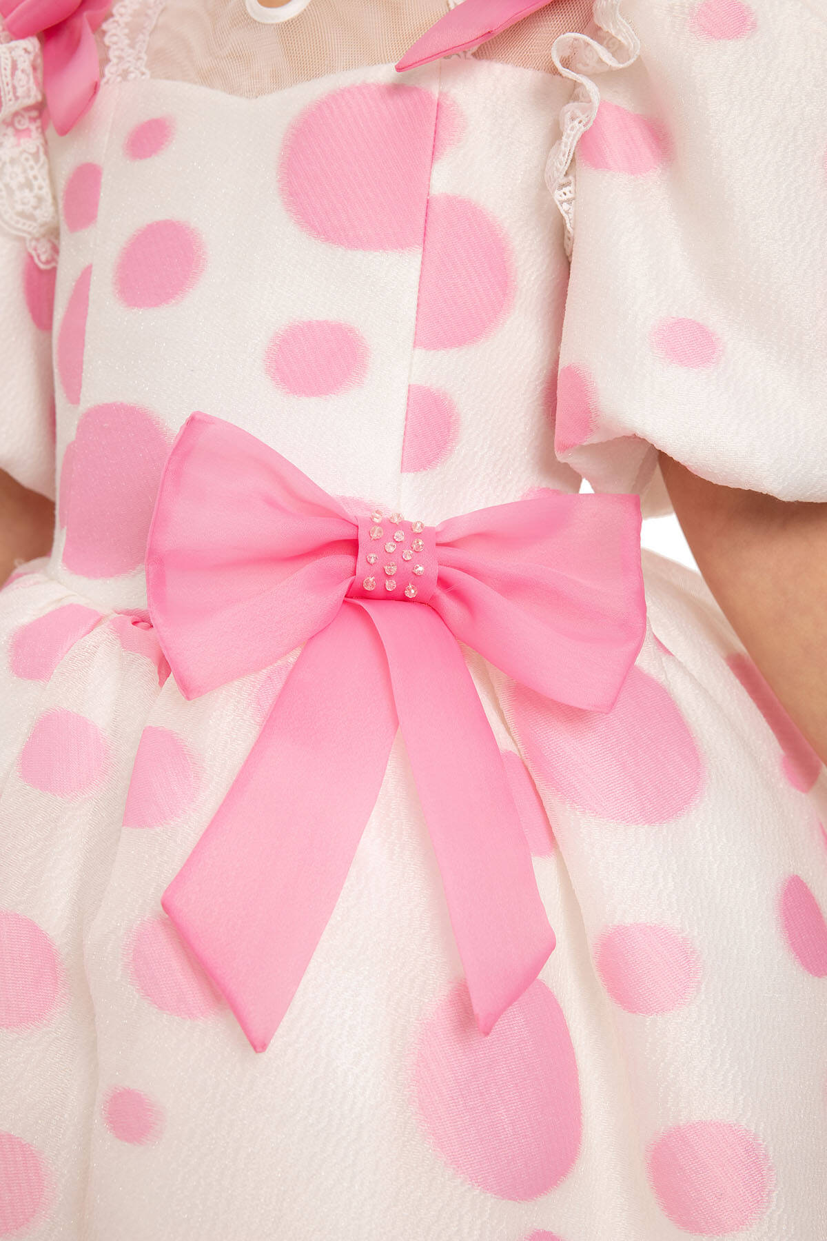 Made from high-quality textured jacquard fabric, featuring an eye-catching polka dot pattern with a soft sheen for added charm. The inner lining ensures comfort throughout the day. A flared A-line silhouette with puff sleeves, delicate lace accents, and a sheer neckline with a button closure. Adorned with a bold, detachable bow at the waist, embellished with sparkling rhinestones for a magical touch. A matching bow hairband crafted from lightweight organza. Perfect for birthday parties, photo sessions, weddings, or any festive event where a little extra sparkle is needed.