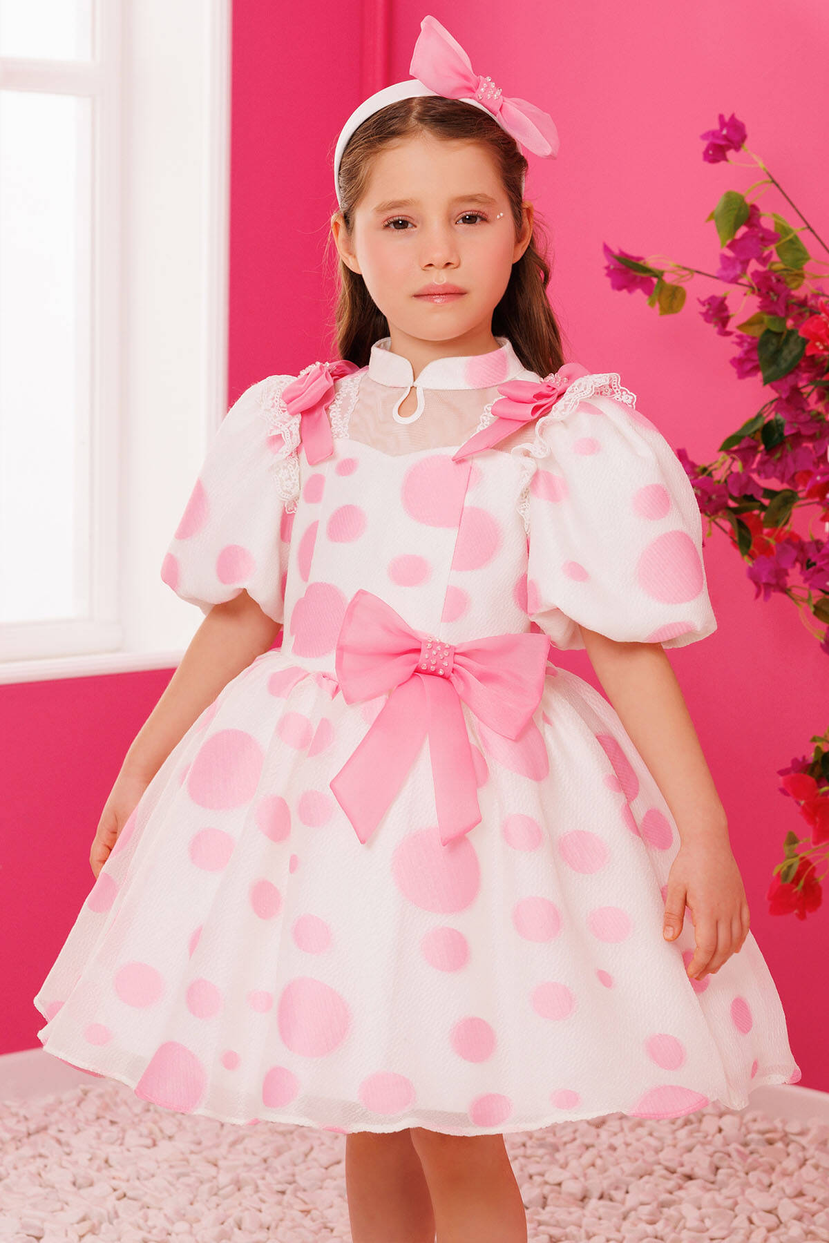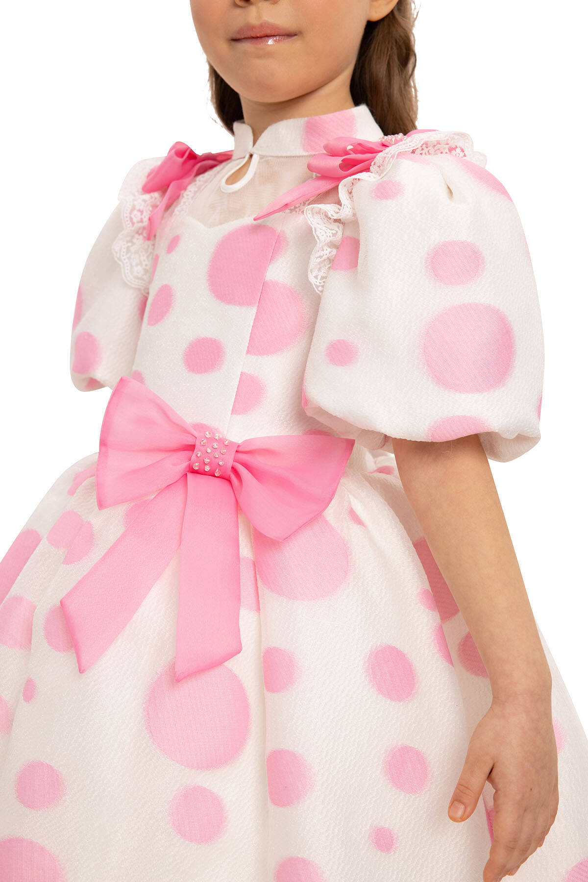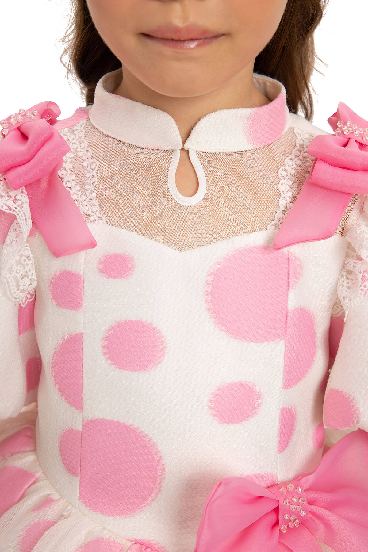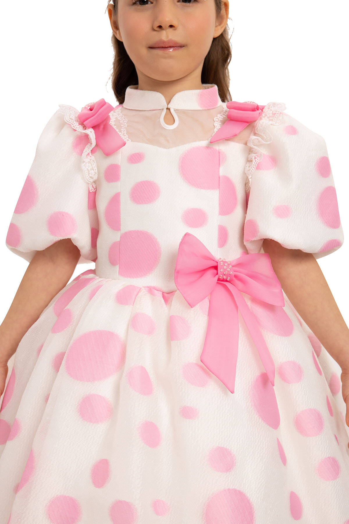 Made from high-quality textured jacquard fabric, featuring an eye-catching polka dot pattern with a soft sheen for added charm. The inner lining ensures comfort throughout the day. A flared A-line silhouette with puff sleeves, delicate lace accents, and a sheer neckline with a button closure. Adorned with a bold, detachable bow at the waist, embellished with sparkling rhinestones for a magical touch. A matching bow hairband crafted from lightweight organza. Perfect for birthday parties, photo sessions, weddings, or any festive event where a little extra sparkle is needed.