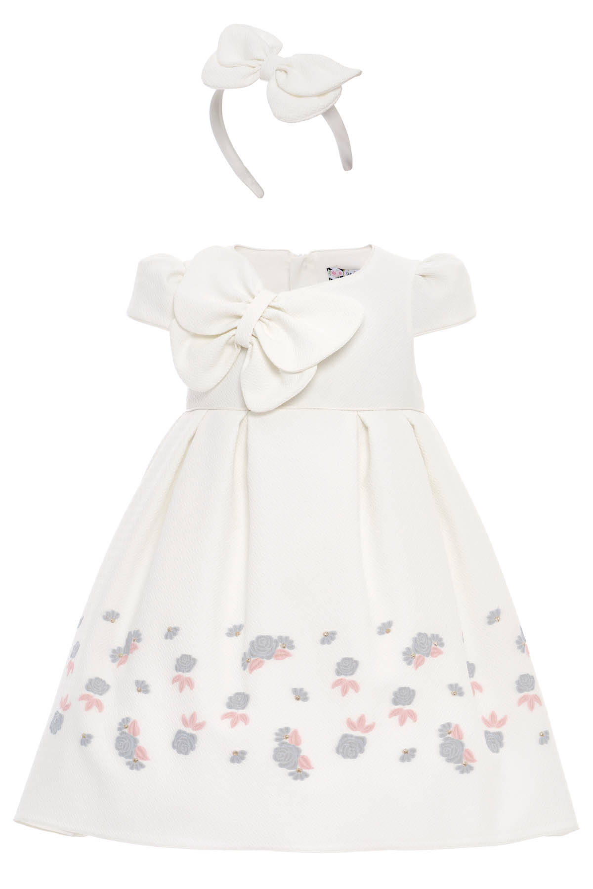 Graceful and oh-so-lovely! This enchanting dress features a soft textured fabric adorned with delicate floral embroidery along the hem, adding a touch of whimsy to its classic silhouette. A dramatic oversized bow at the front brings playful elegance, perfectly matched with the charming headband included in the set. Designed for little girls who love to dress up, this sweet ensemble is perfect for weddings, holidays, and other picture-perfect occasions.
