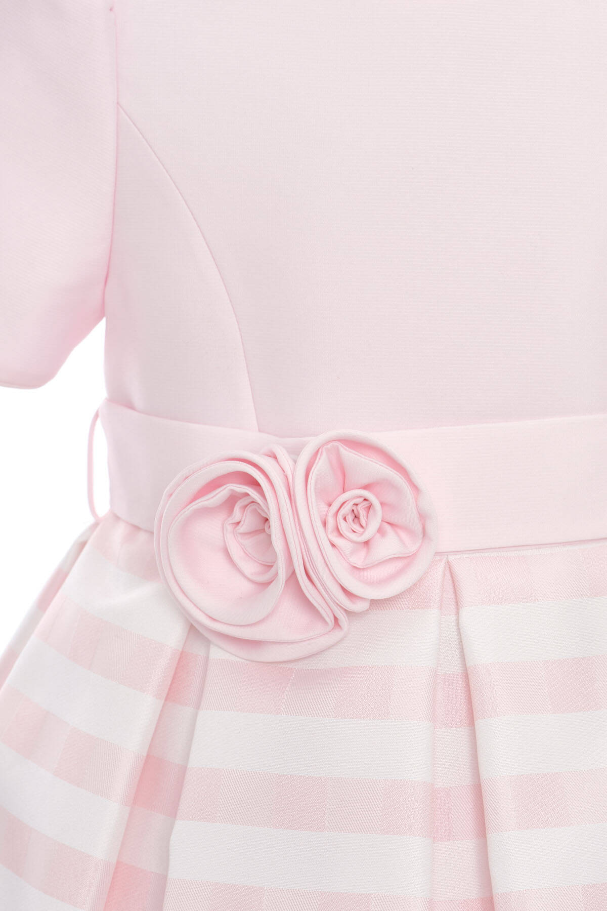 Charming, classic, and full of playful elegance—this dress is a timeless choice for your little one’s most special days. Featuring a structured bodice with short puff sleeves and a voluminous striped organza skirt, this design balances simplicity with subtle sophistication. A double flower detail at the waist adds a romantic touch, while the matching mini purse completes the look—perfect for birthdays, weddings, or festive celebrations.