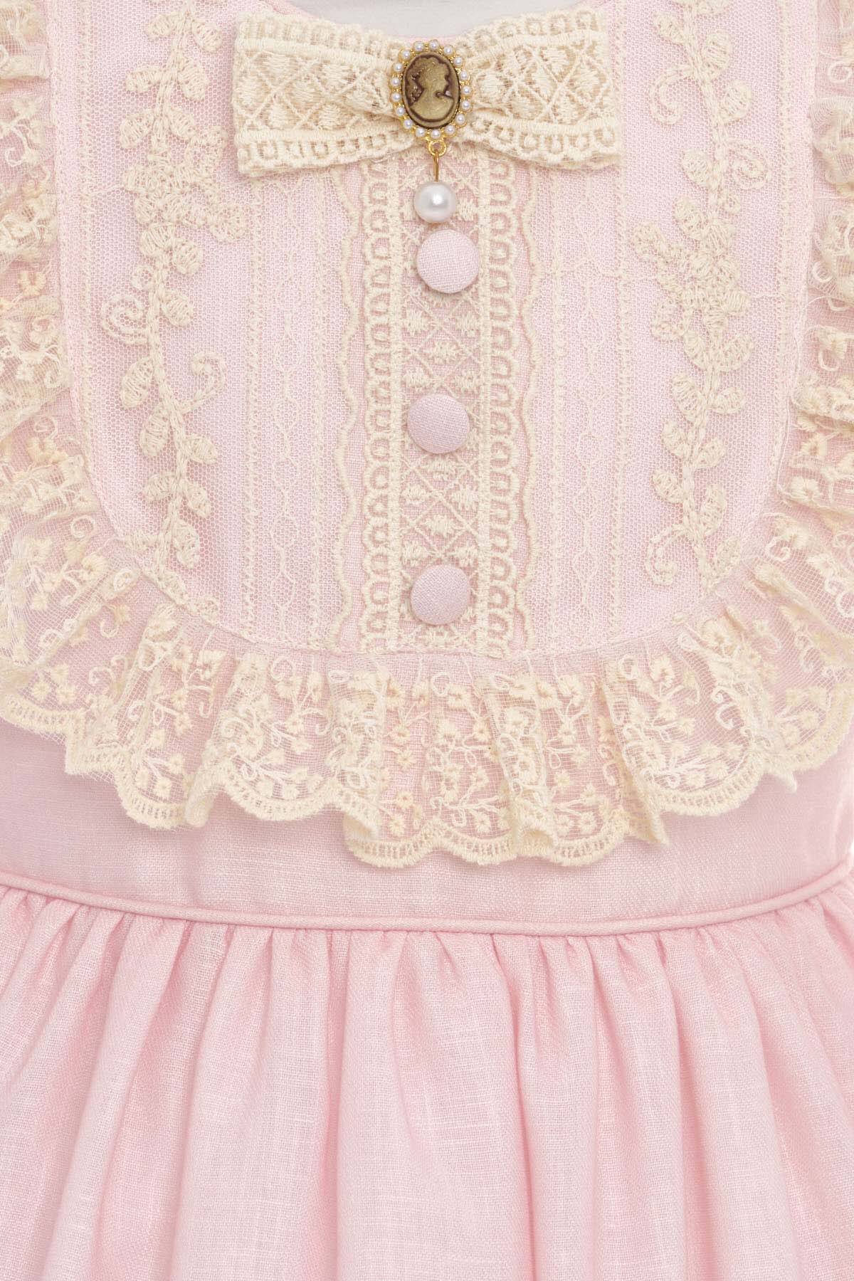 Step into timeless elegance with this beautifully detailed dress for little girls. Crafted in soft pastel tones, the dress features charming puffed sleeves and an intricately embroidered lace bib front. The delicate ivory lace trim along the chest and sleeves adds a romantic, vintage touch. A lovely lace bow with a cameo-style brooch and pearl pendant decorates the neckline, while the full skirt is perfect for twirling. The back is finished with a large matching bow, and the included headband completes the sophisticated look.