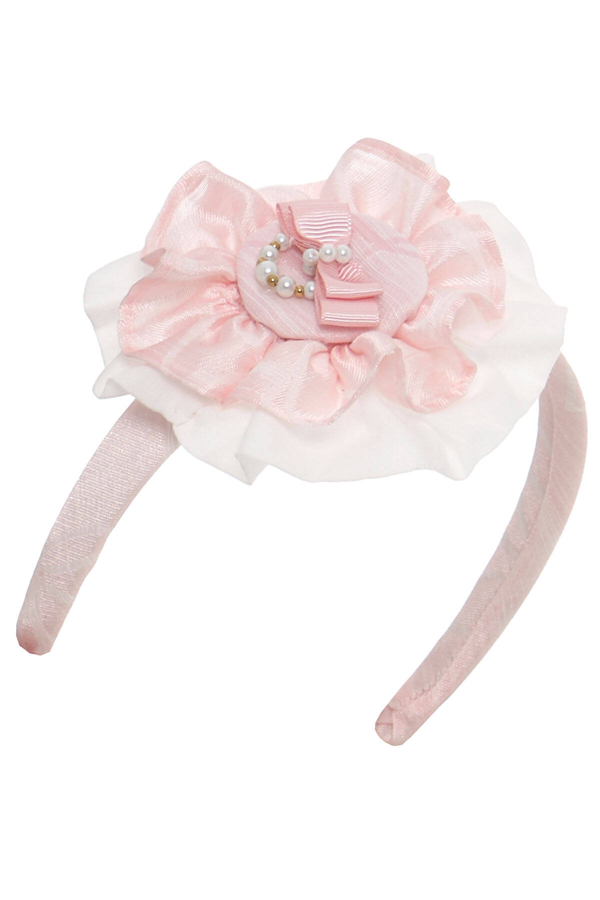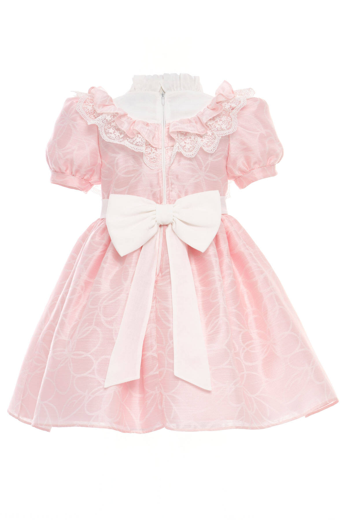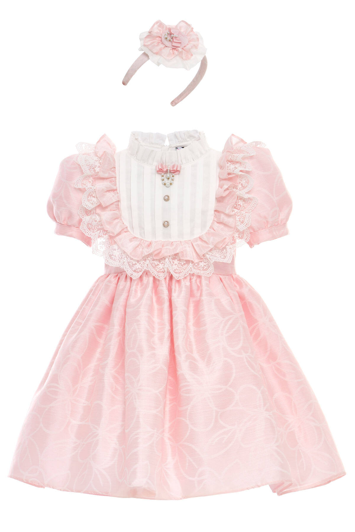 A delightful dress with storybook sweetness and elegant detailing. Crafted from soft floral-patterned organza, this design features a structured white bib with pleated stripes and pearl button accents. The ruffled bodice is framed with embroidered lace trim and puff sleeves, creating a classic silhouette full of vintage charm. A layered satin bow at the back and a matching embellished headband complete the look—perfect for birthdays, weddings, and magical celebrations.