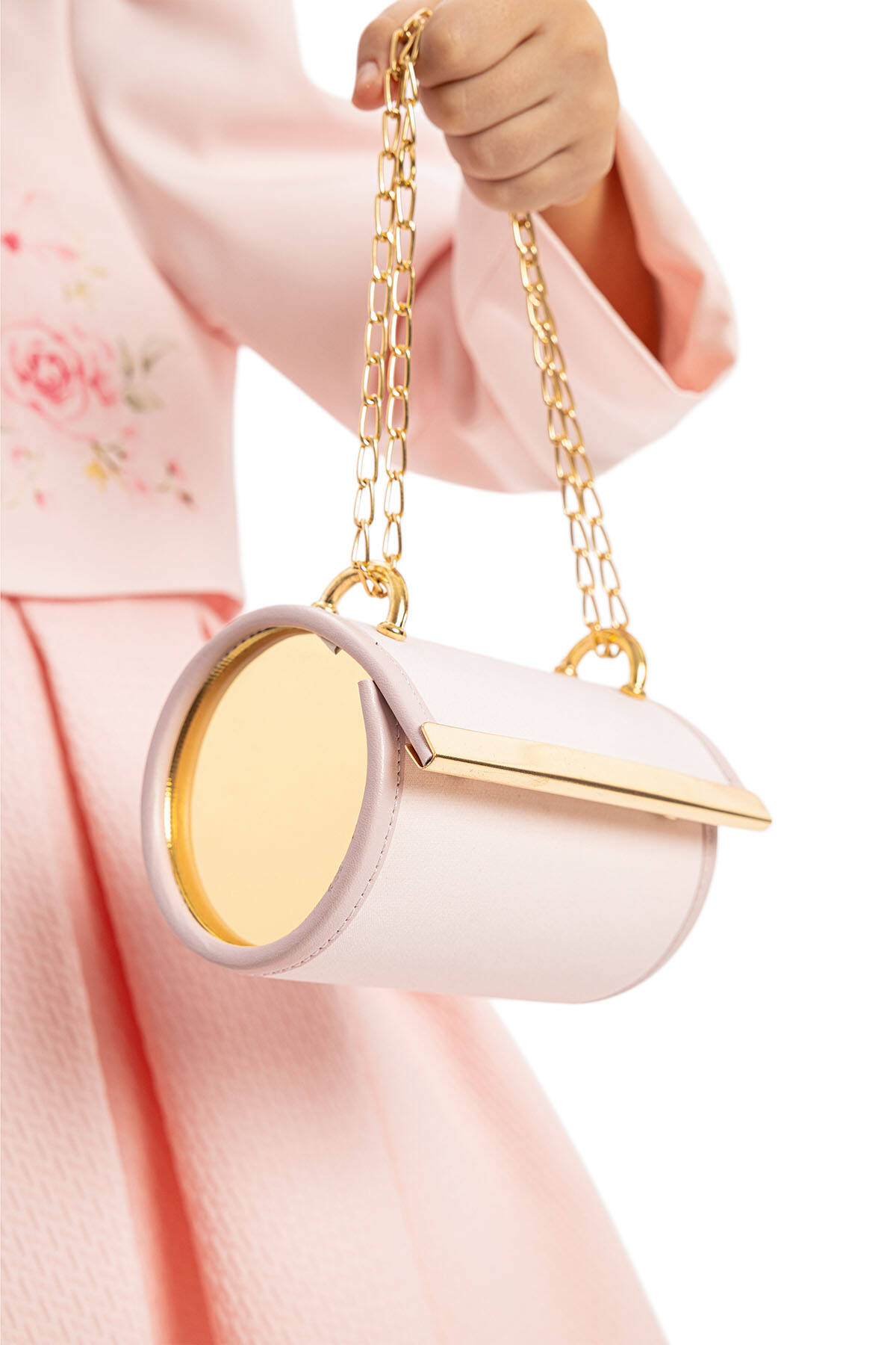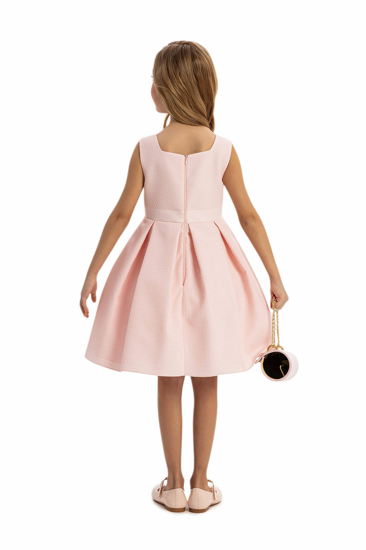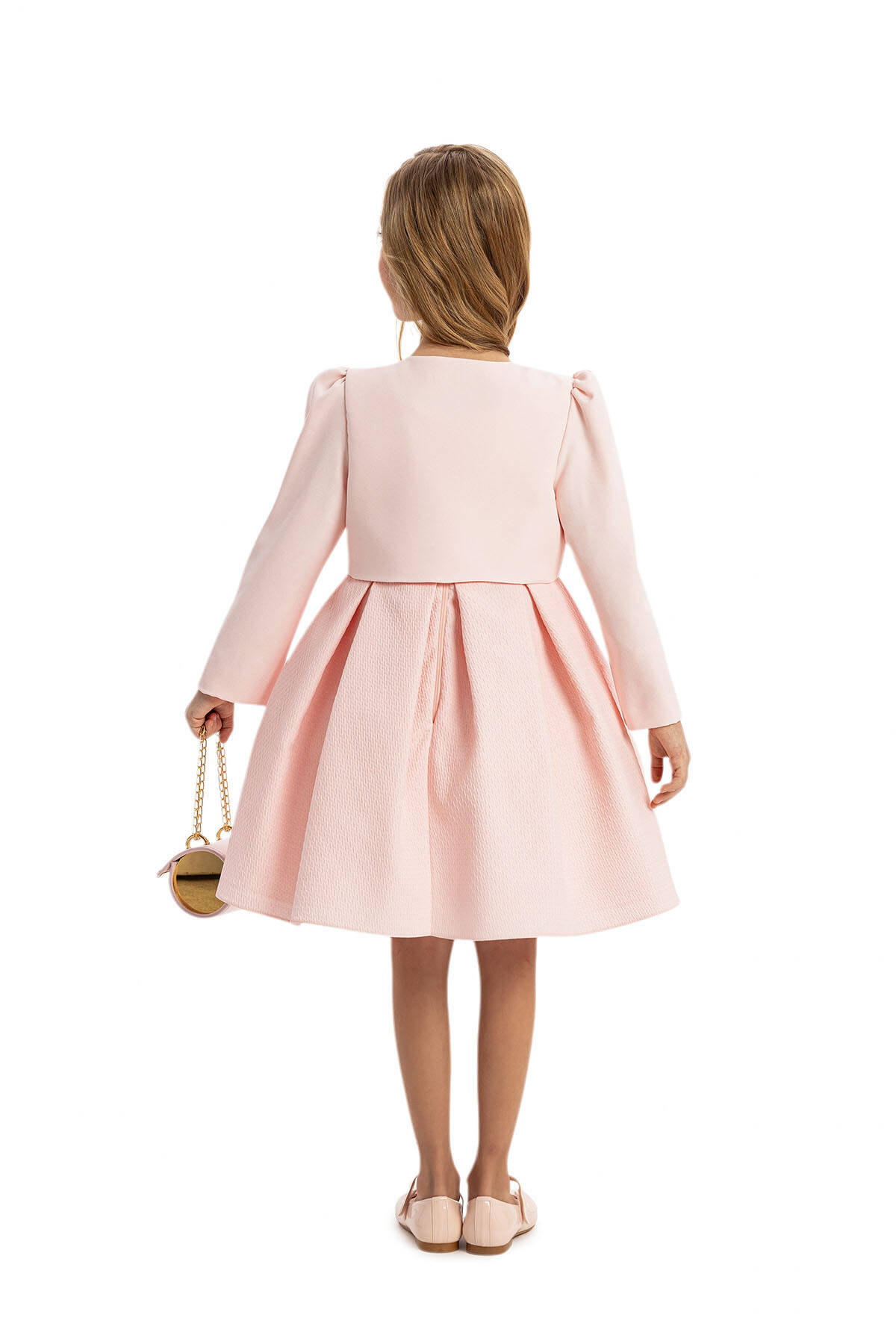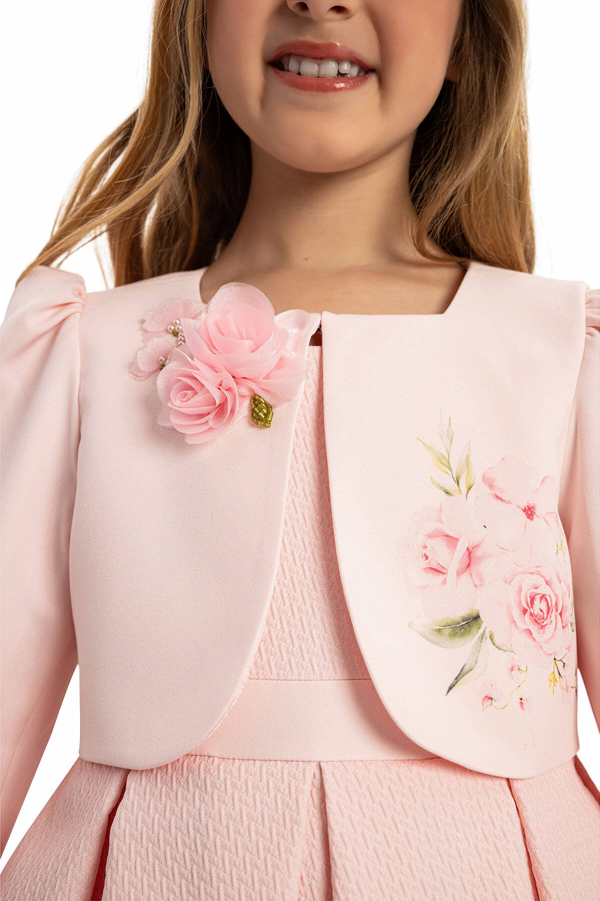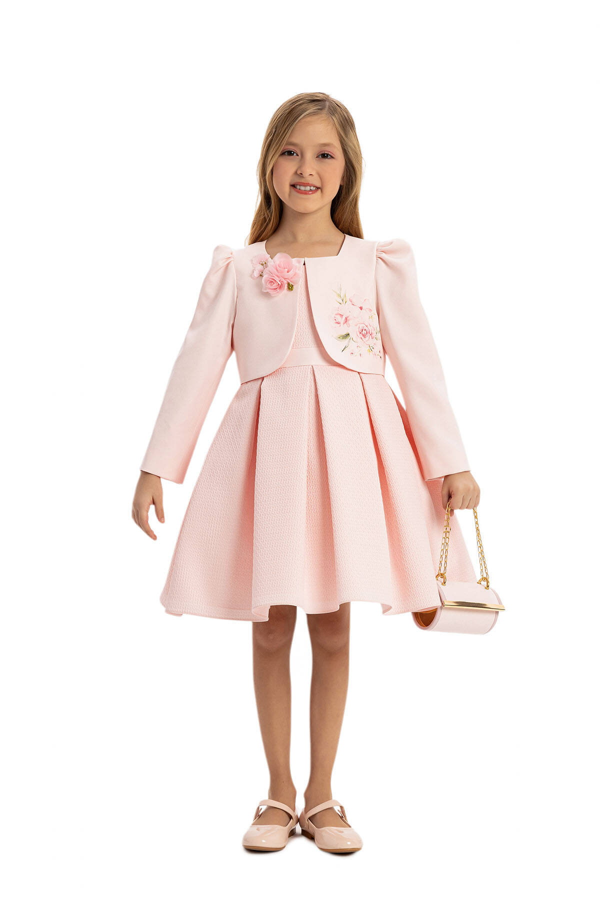 This sophisticated 3-piece set is perfect for your little one's special moments. The set includes a sleeveless dress, a stylish jacket, and a matching bag. Crafted from premium jacquard fabric, the dress features a textured finish and a pleated skirt that adds volume and elegance. The jacket is adorned with exquisite floral appliqués and 3D details, while the charming bag with a golden chain handle completes the look for a truly polished ensemble.