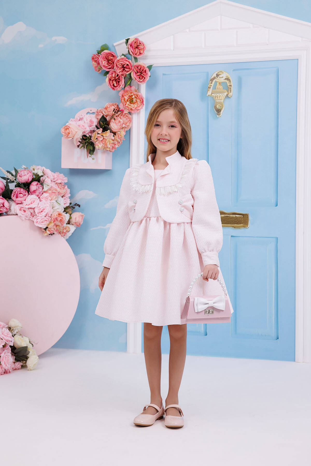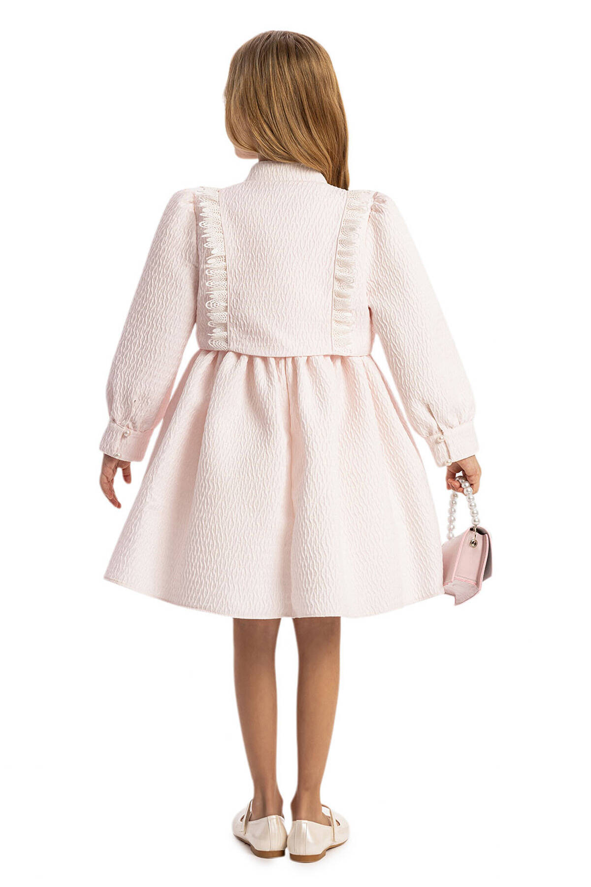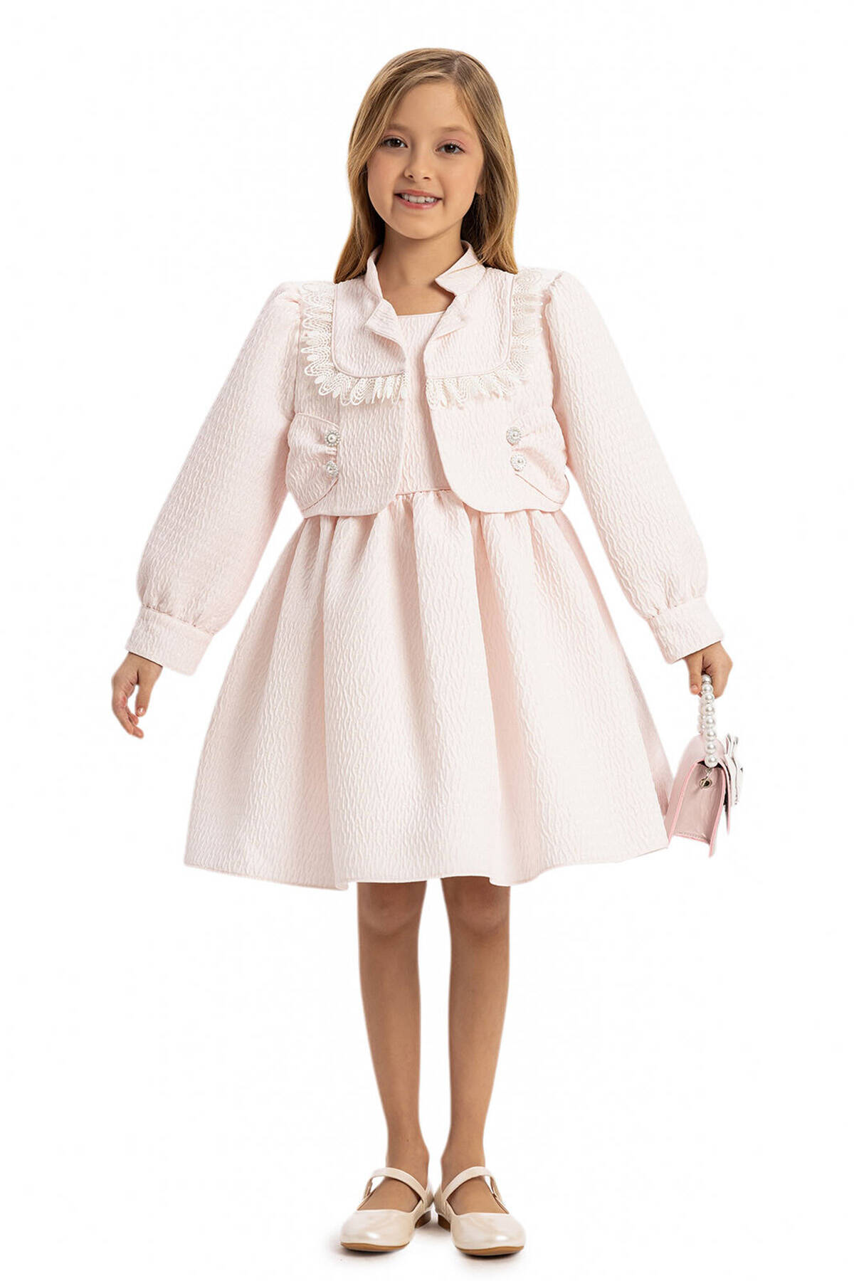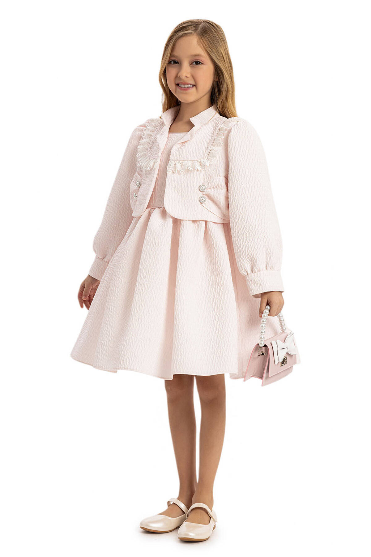 This sophisticated 3-piece set is designed for stylish little ones, featuring a charming dress, a coordinating jacket, and an adorable handbag. Crafted from high-quality textured jacquard fabric, the dress offers a subtle shimmer and luxurious feel. The matching jacket is adorned with delicate fringe details, pearl buttons, and a tailored fit, providing both elegance and warmth. The set is completed with a chic handbag featuring a bow embellishment and pearl handle, adding a playful yet polished touch.
