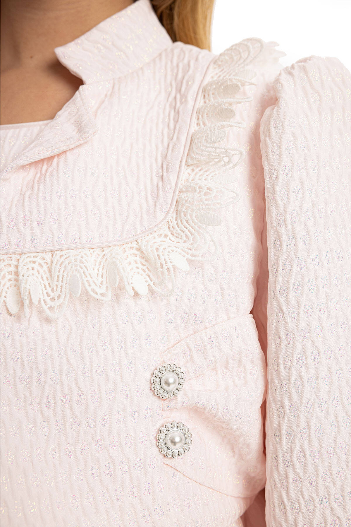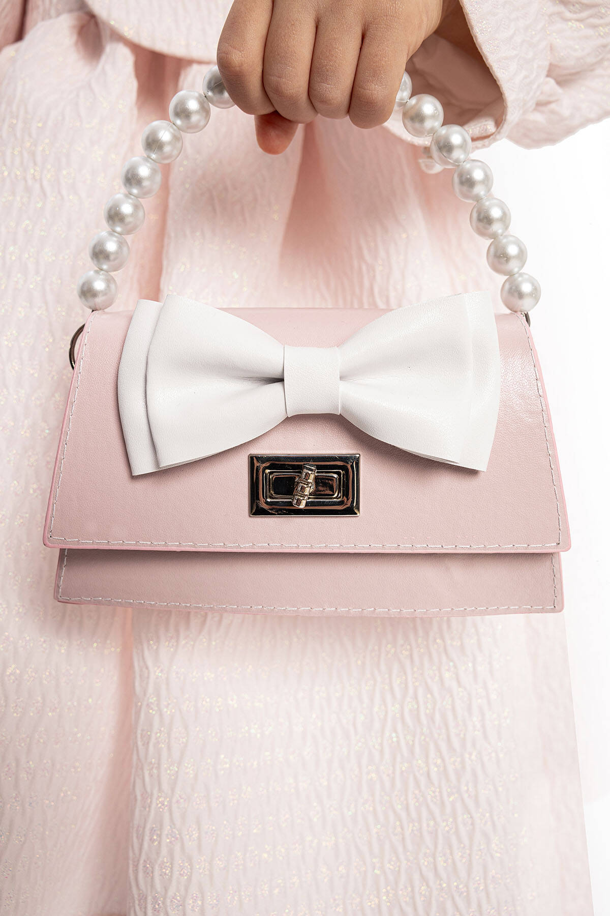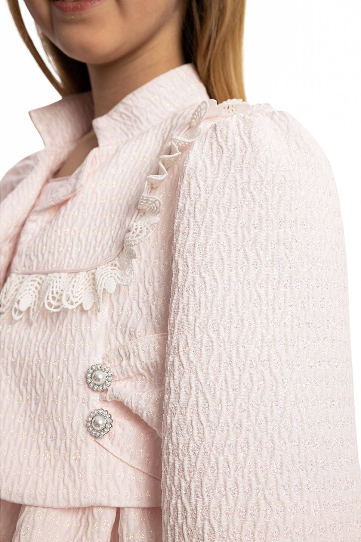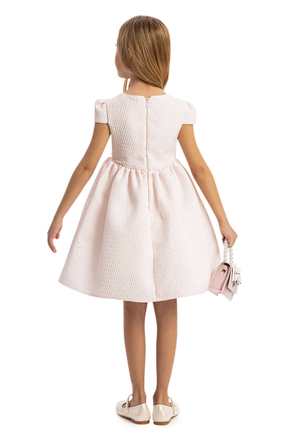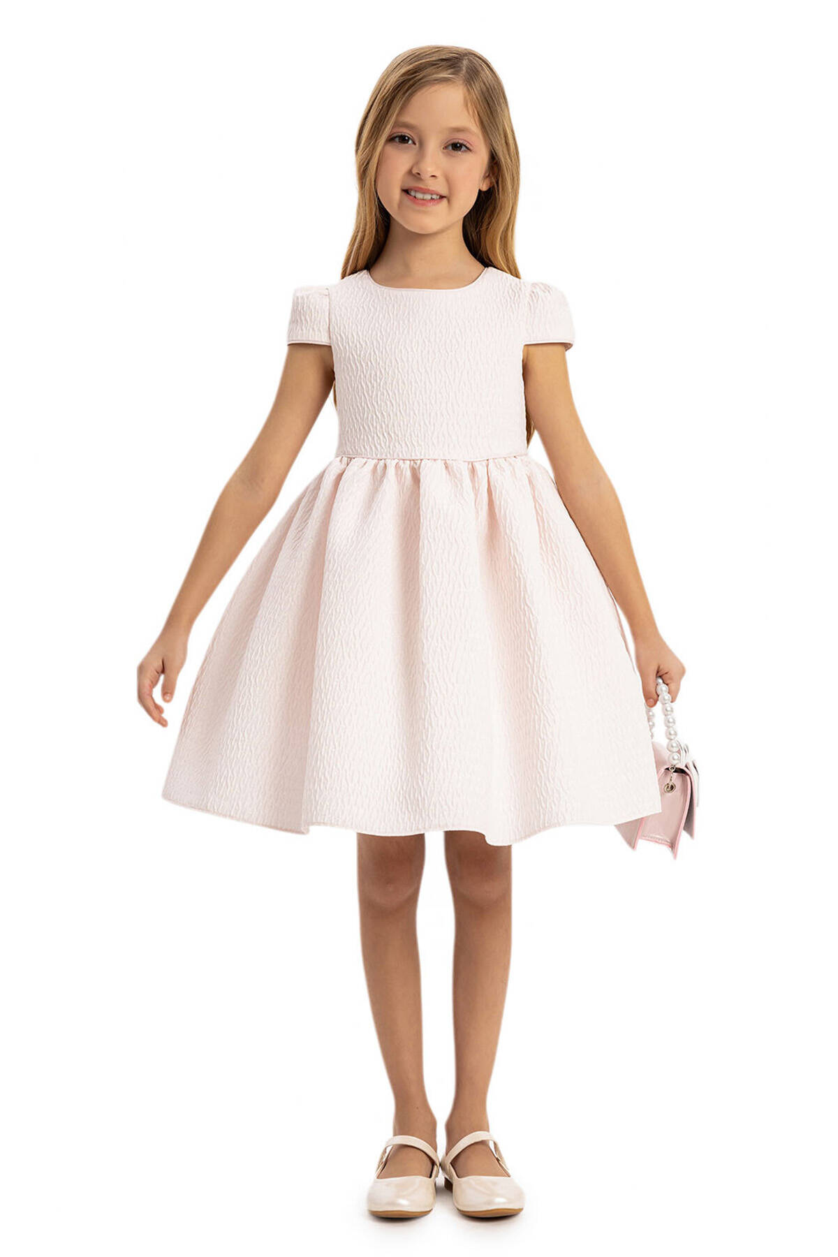 This sophisticated 3-piece set is designed for stylish little ones, featuring a charming dress, a coordinating jacket, and an adorable handbag. Crafted from high-quality textured jacquard fabric, the dress offers a subtle shimmer and luxurious feel. The matching jacket is adorned with delicate fringe details, pearl buttons, and a tailored fit, providing both elegance and warmth. The set is completed with a chic handbag featuring a bow embellishment and pearl handle, adding a playful yet polished touch.