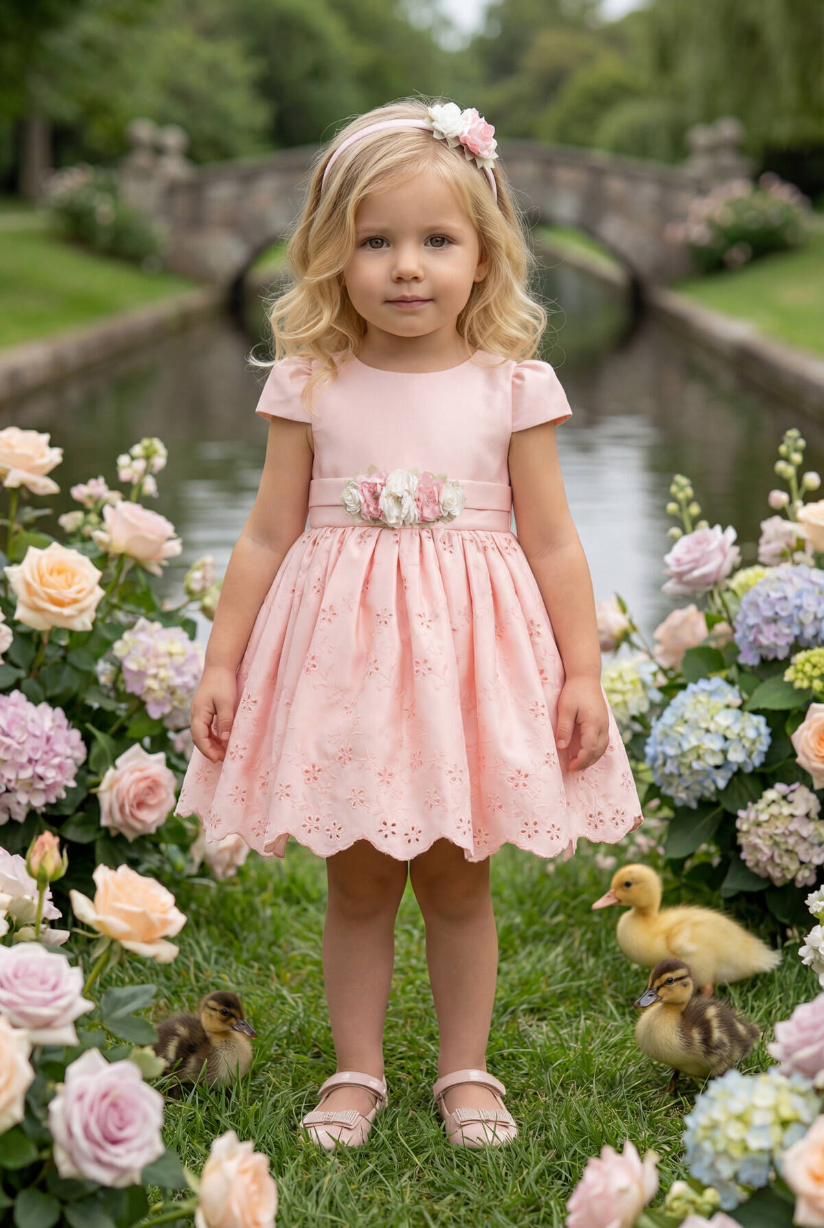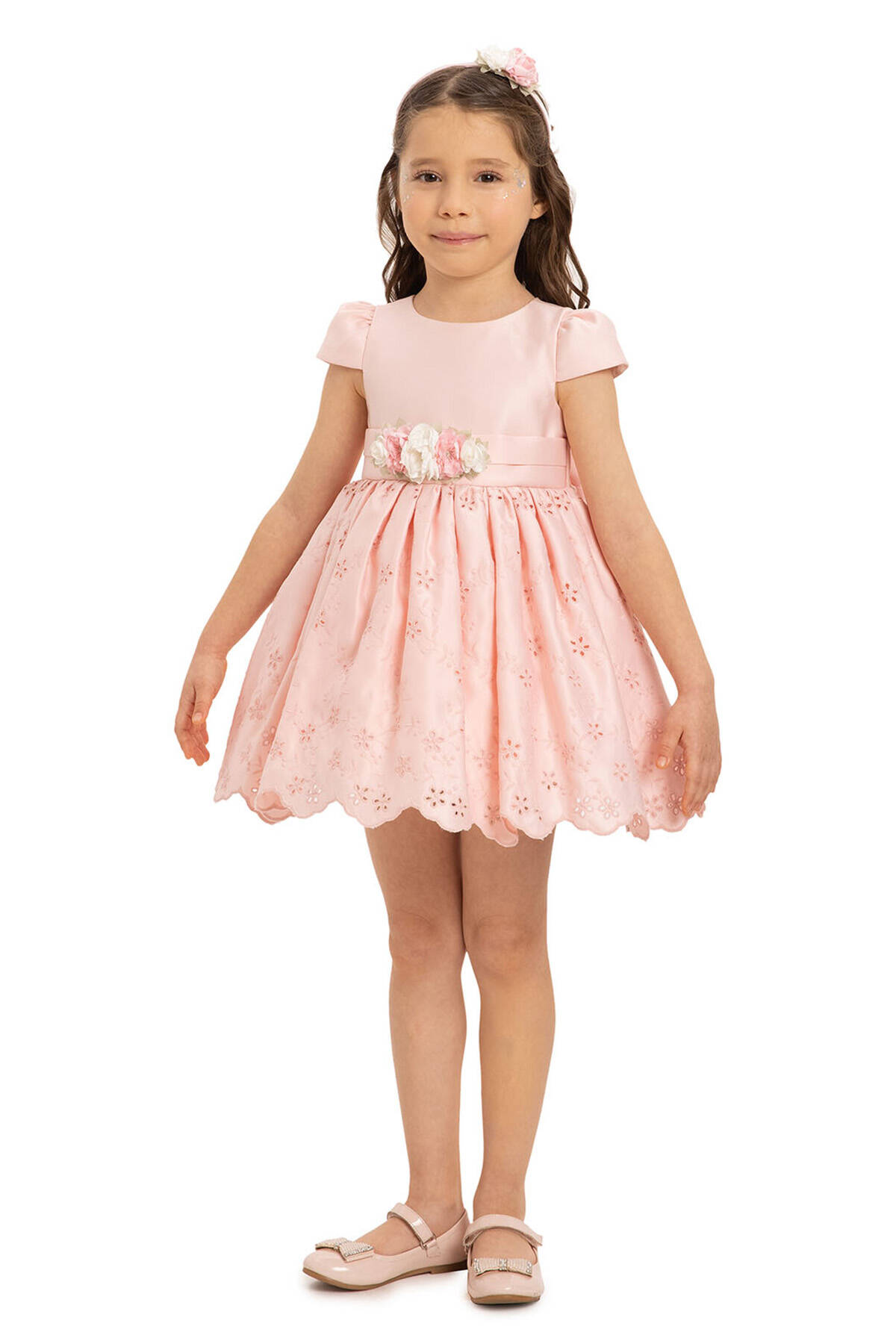 The dress features delicate embroidery and a scalloped hem, complemented by a statement bow at the back. The waistline is embellished with a floral applique, adding a touch of elegance. Accompanied by a matching floral hair accessory, this set creates a coordinated, picture-perfect outfit.