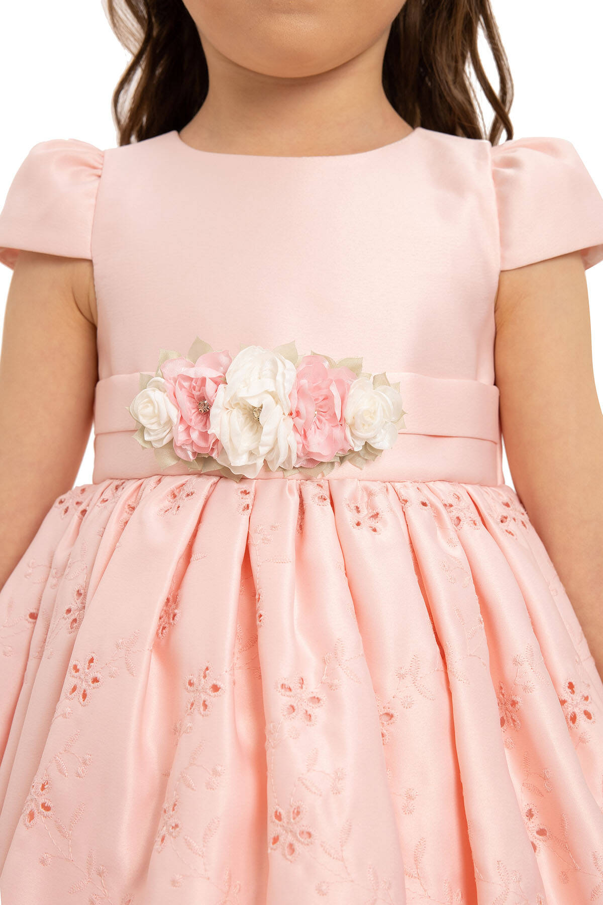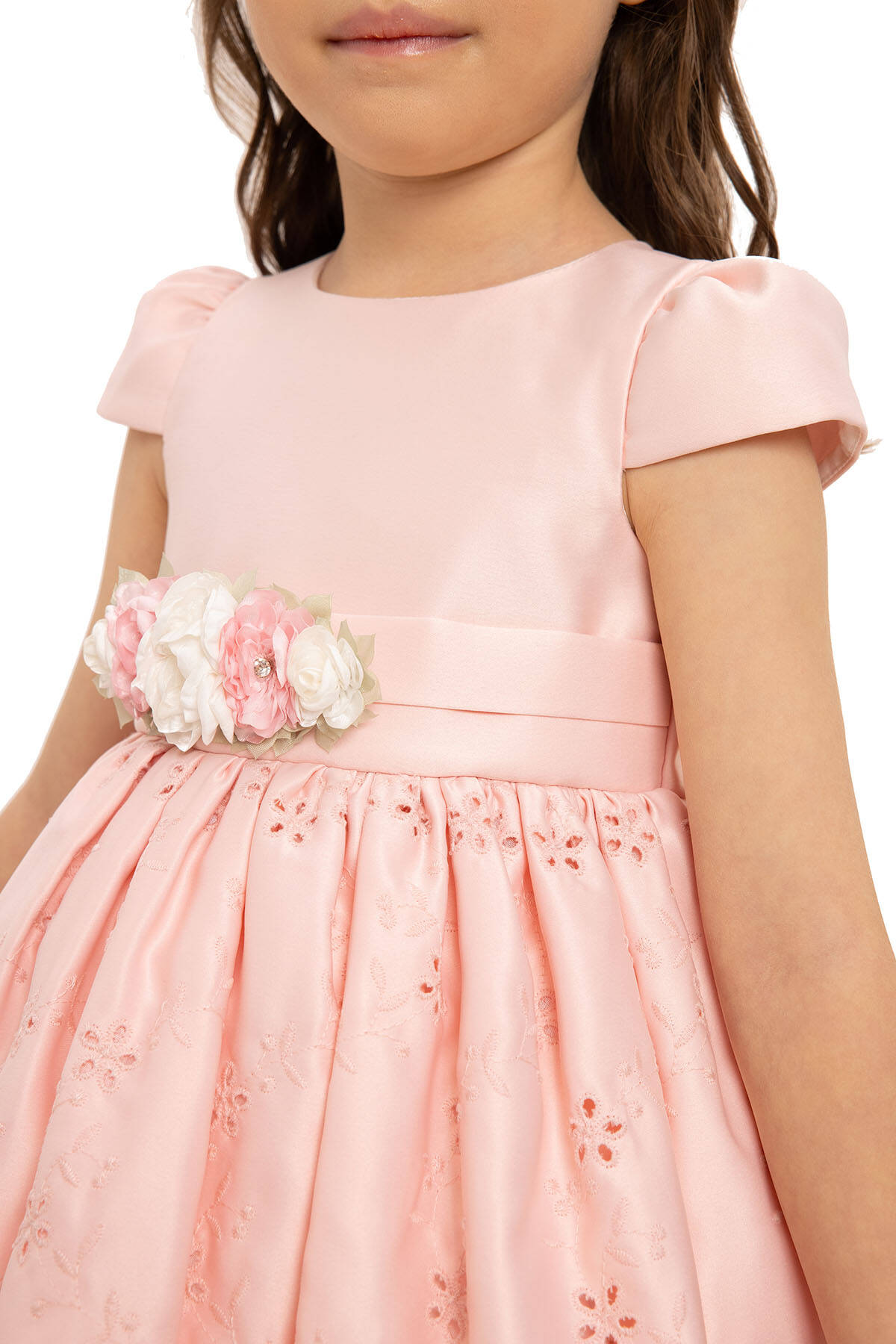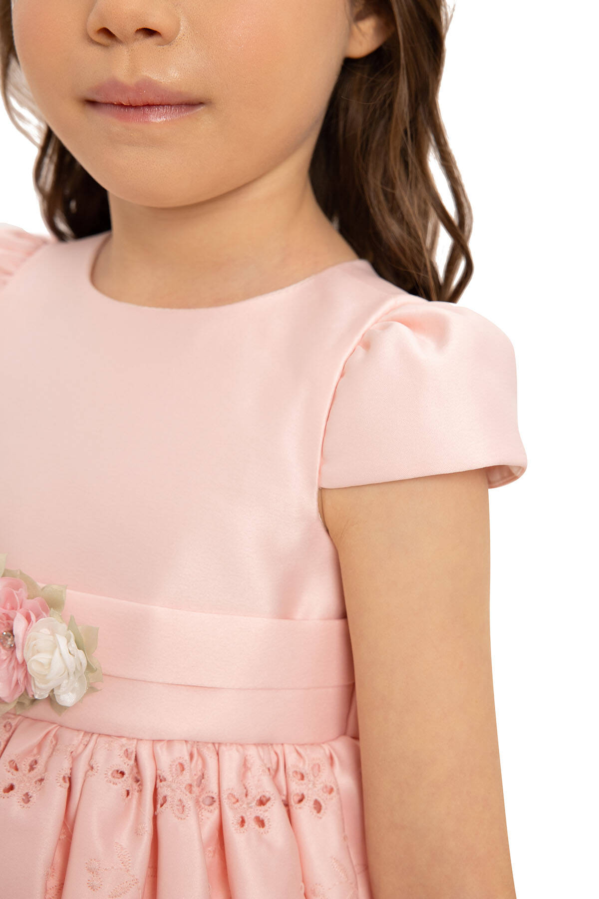 - Satin fabric with embroidered details on the skirt