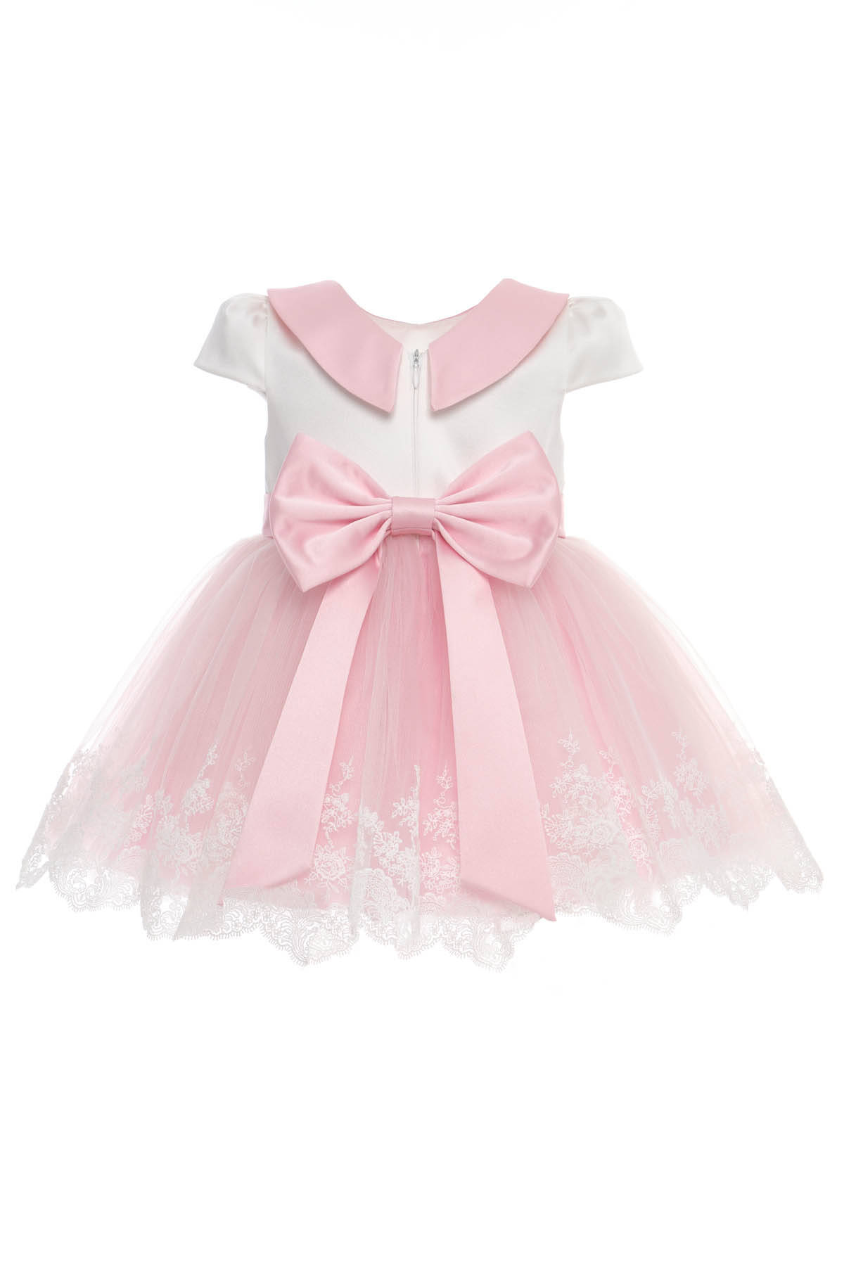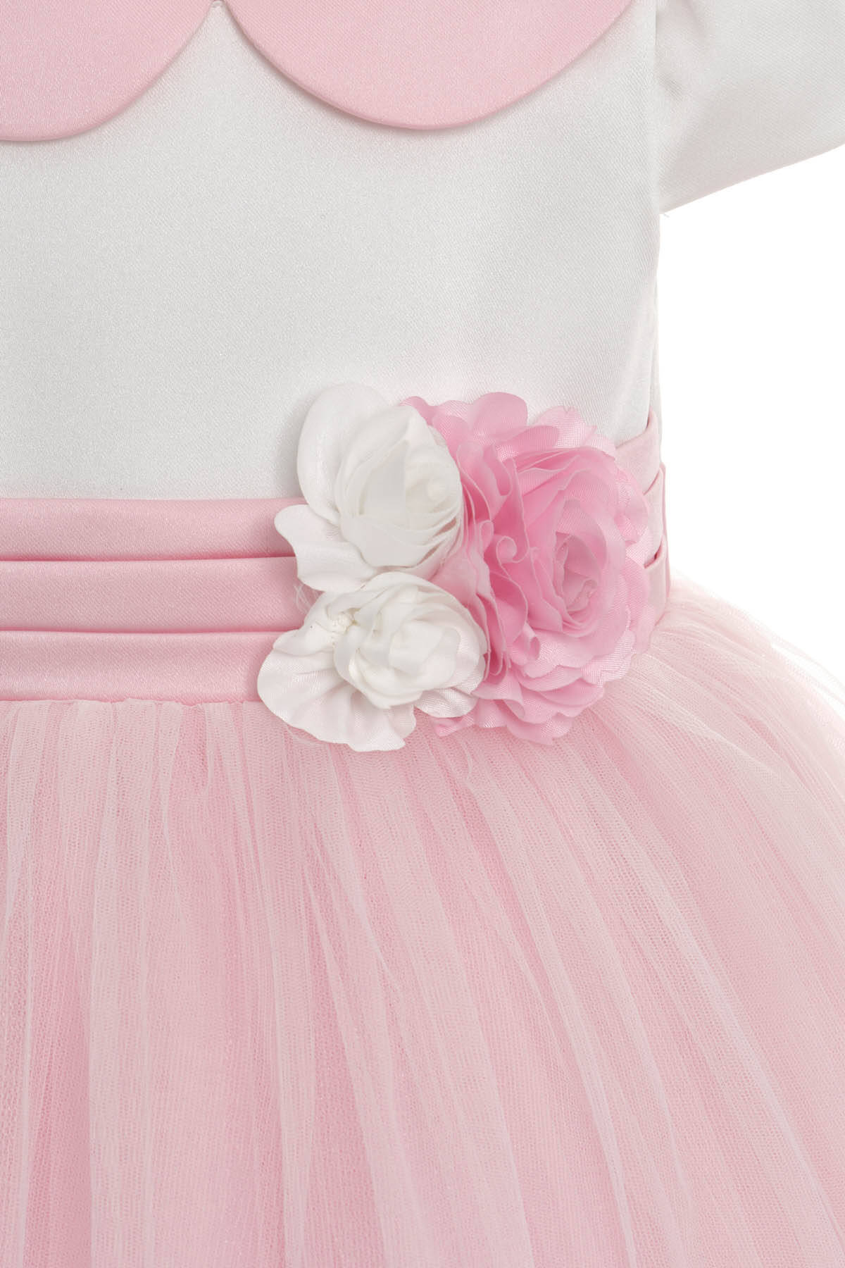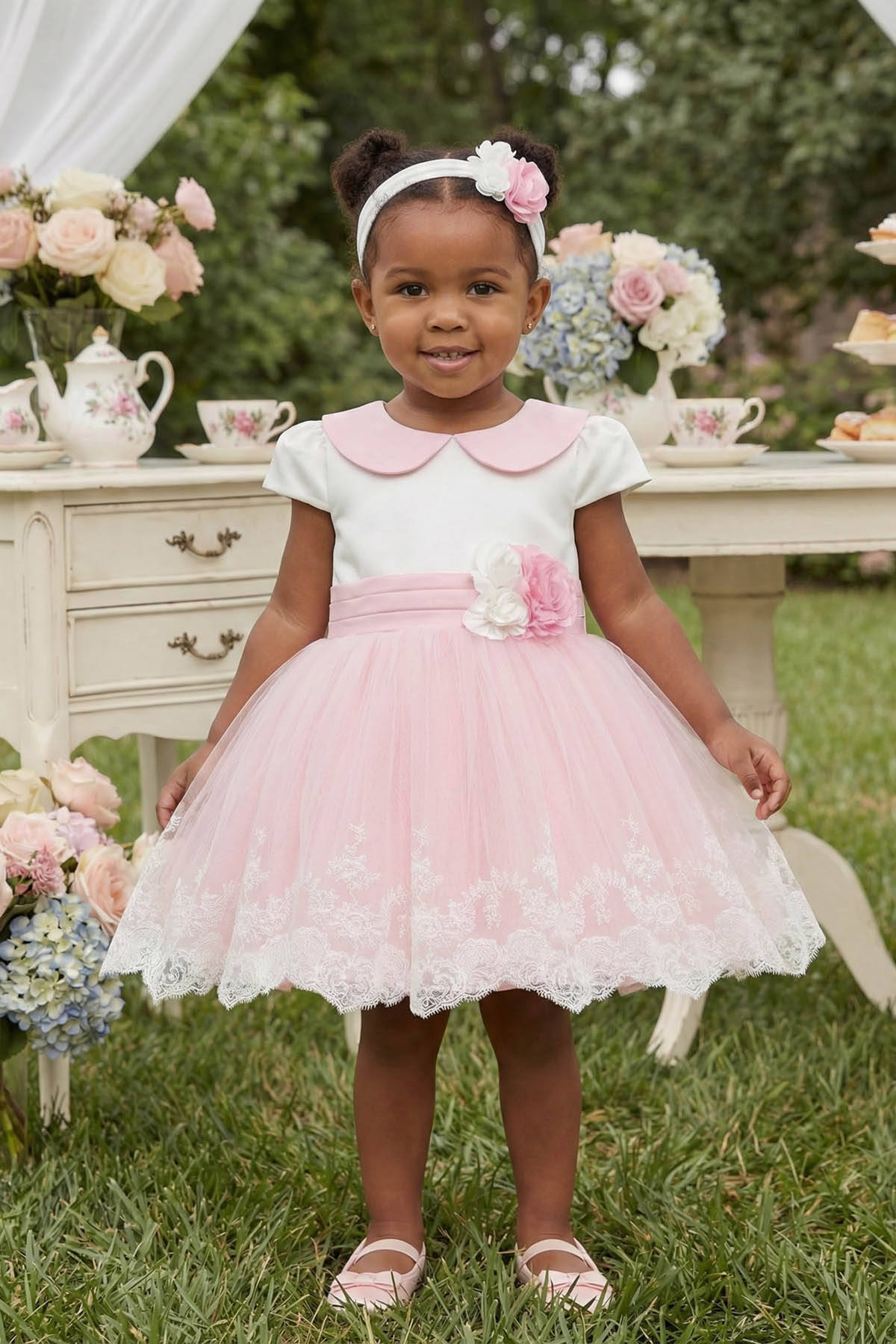A dream dress for your little one's most precious moments! This elegant two-piece set includes a satin bodice dress with a soft tulle skirt and delicate lace hem, paired with a matching floral headband. The Peter Pan collar and layered waistband adorned with chiffon flowers add extra sweetness, while the large back bow completes the look with timeless charm.