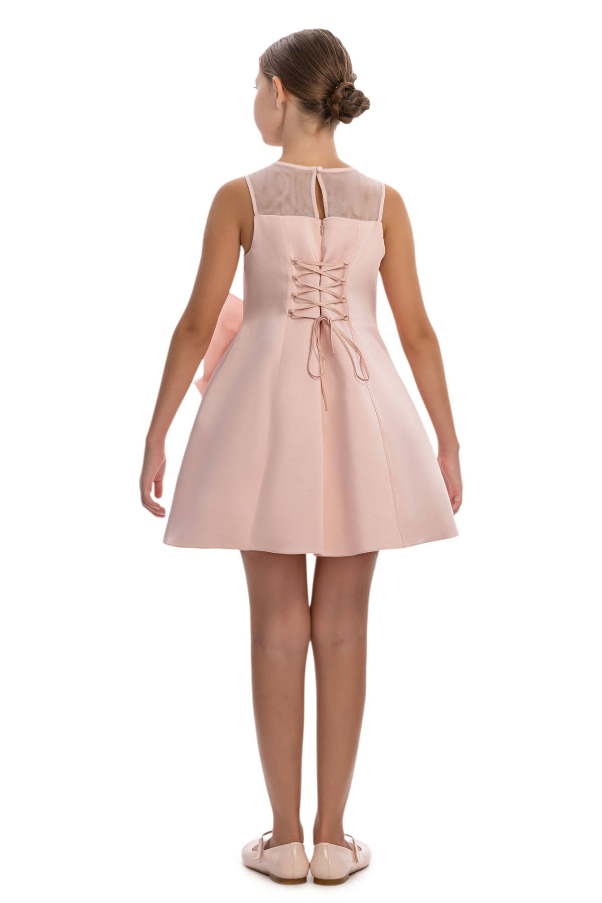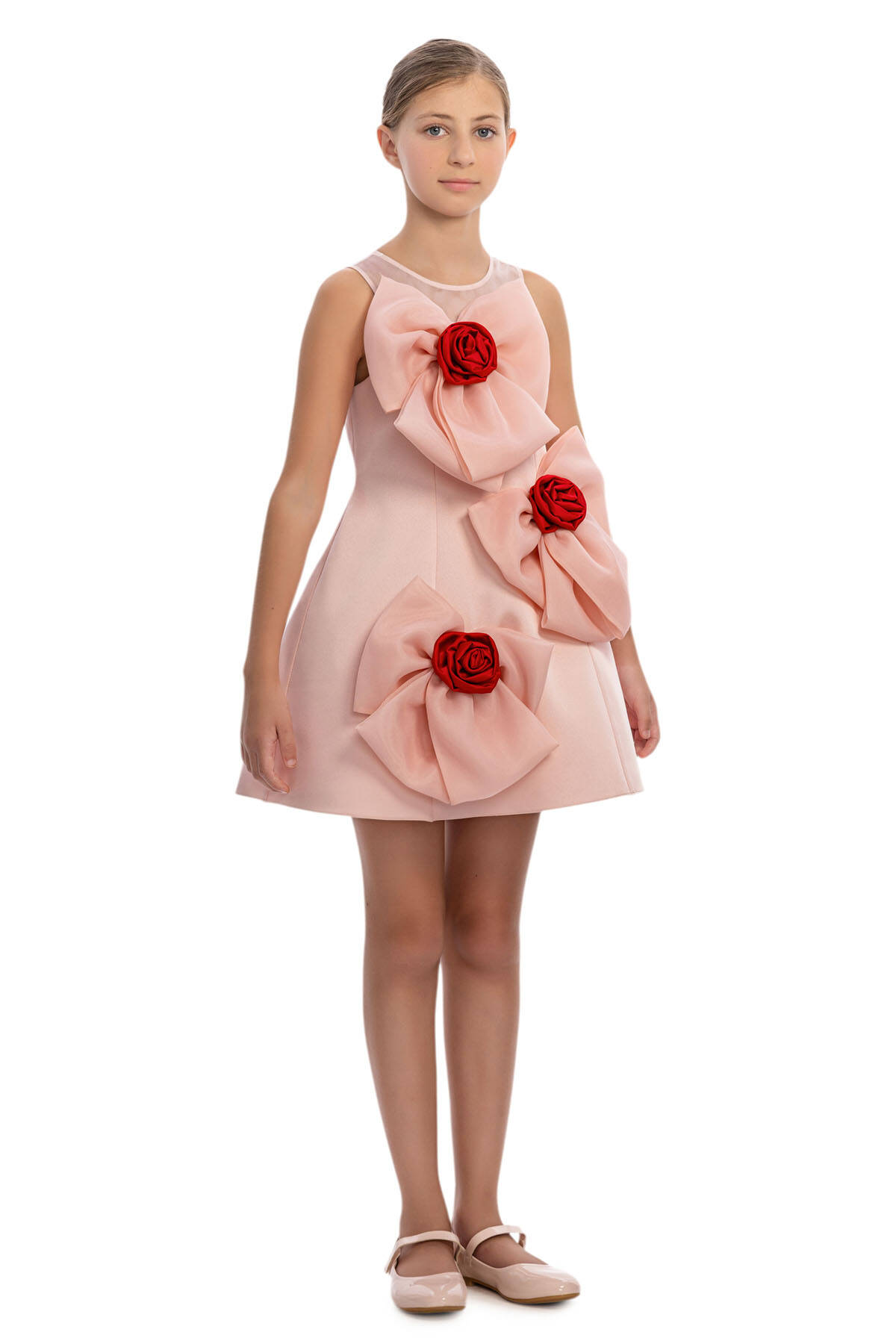 A chic and playful party dress with couture-inspired details! This sleeveless dress features a fitted bodice with a sheer mesh neckline and a flared skirt for a modern, youthful silhouette. The highlight of the design is the oversized bows adorned with bold 3D rose centers, creating a statement look that’s both stylish and fun. The back lace-up closure ensures a perfect fit, while the lightweight lining makes it comfortable for all-day wear. Perfect for birthdays, parties, or special occasions, this dress is made for girls who love to stand out with elegance and flair.