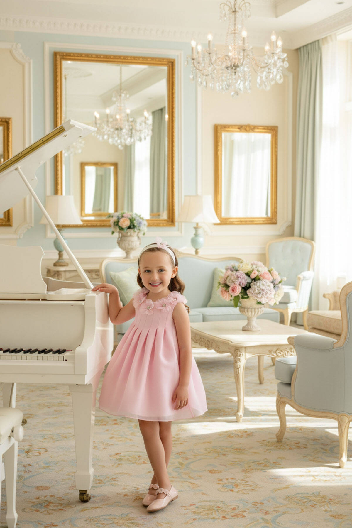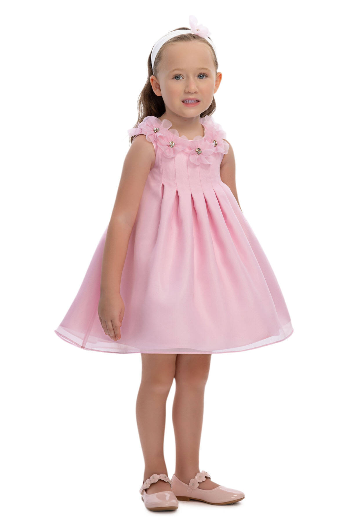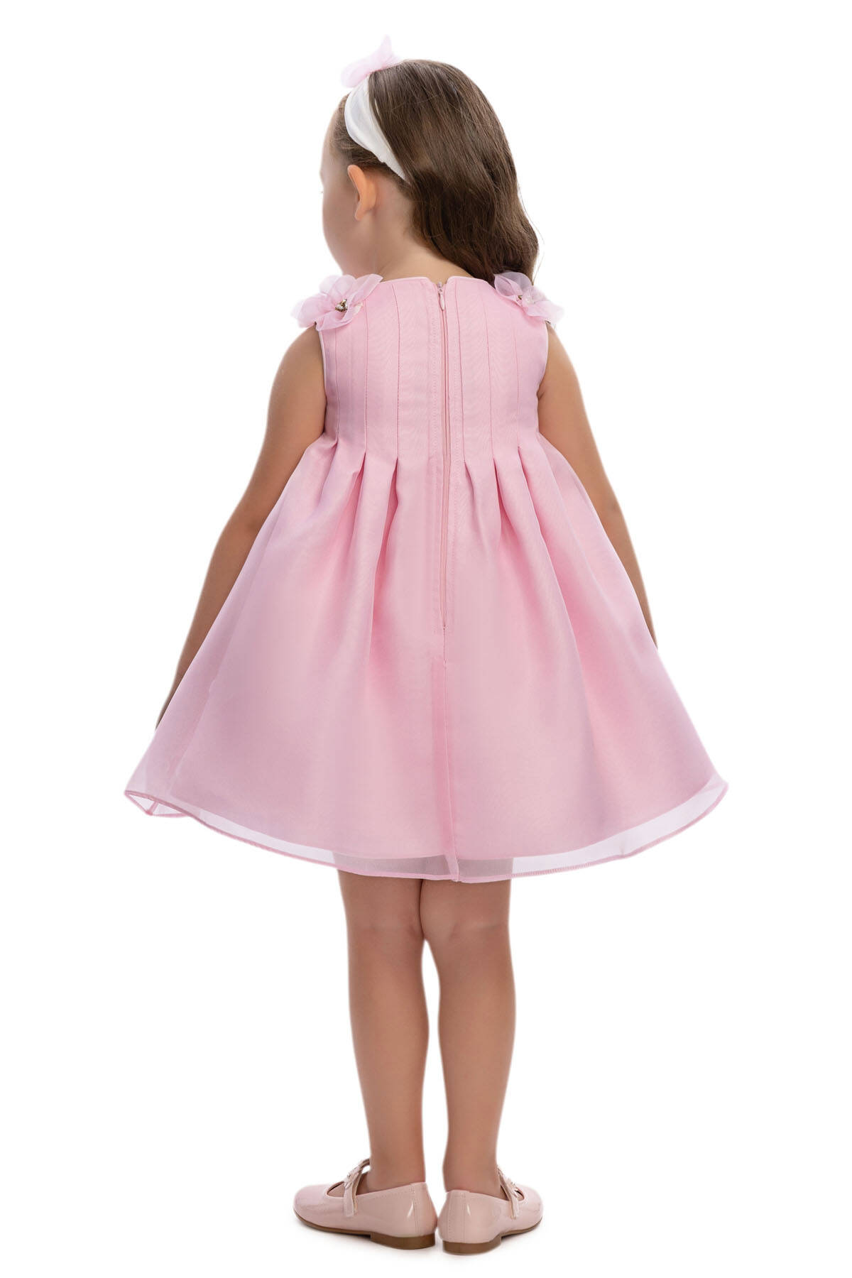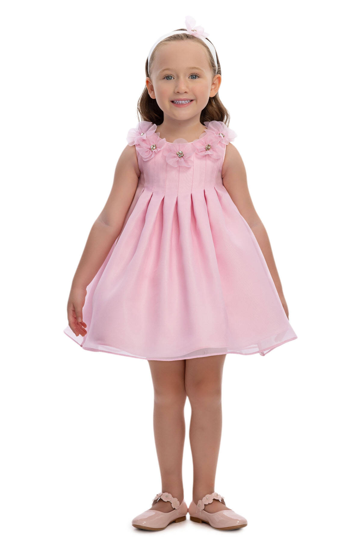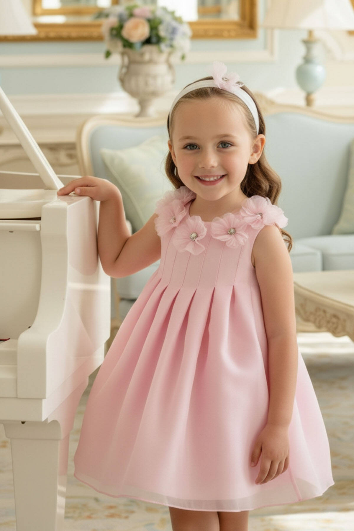Delicate, dreamy, and designed for special little moments — this baby dress set is pure elegance. The sleeveless A-line silhouette is adorned with soft pleats, creating a graceful flow that allows both style and comfort.The neckline is beautifully decorated with 3D chiffon flowers, each embellished with sparkling crystal stones at the center, adding a touch of sophistication to the playful design. A matching floral headband completes the look, making it perfectly coordinated for photographs and celebrations.Lightweight and lined for comfort, this dress is ideal for birthdays, christenings, and festive gatherings a timeless choice that blends charm and luxury.