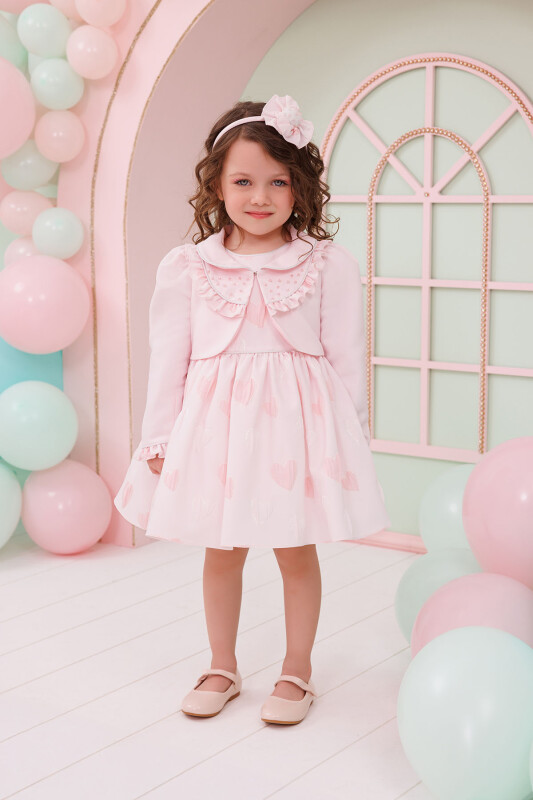 This delightful three-piece set is perfect for your little one's special occasions. The set includes a charming sleeveless dress, a matching long-sleeve jacket, and an adorable hair accessory, creating a complete and coordinated look. The dress is made from soft jacquard fabric, featuring a playful heart pattern with a subtle shimmer that adds a touch of magic. The jacket, crafted from the same fabric, boasts delicate ruffle details and shimmering accents on the collar and cuffs, making it an elegant layering piece. The matching hair accessory ties the outfit together for a picture-perfect ensemble.