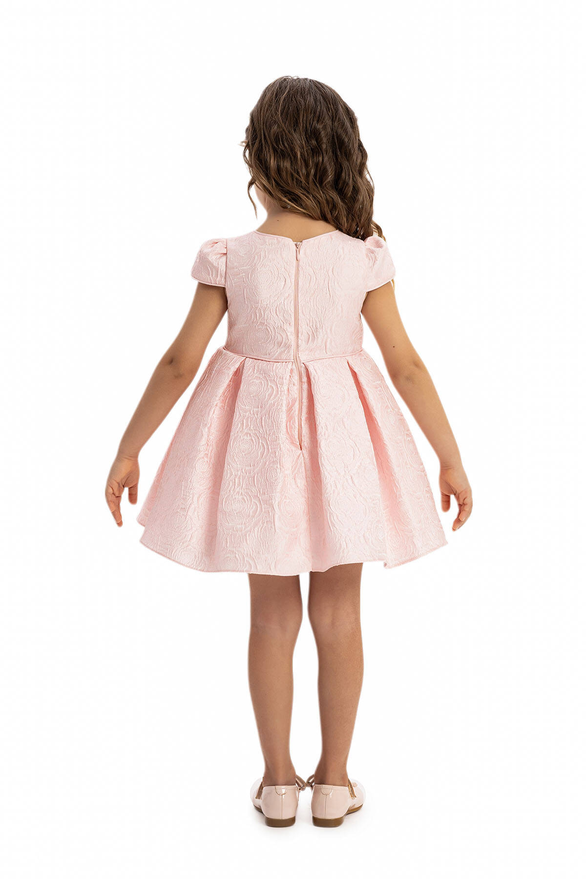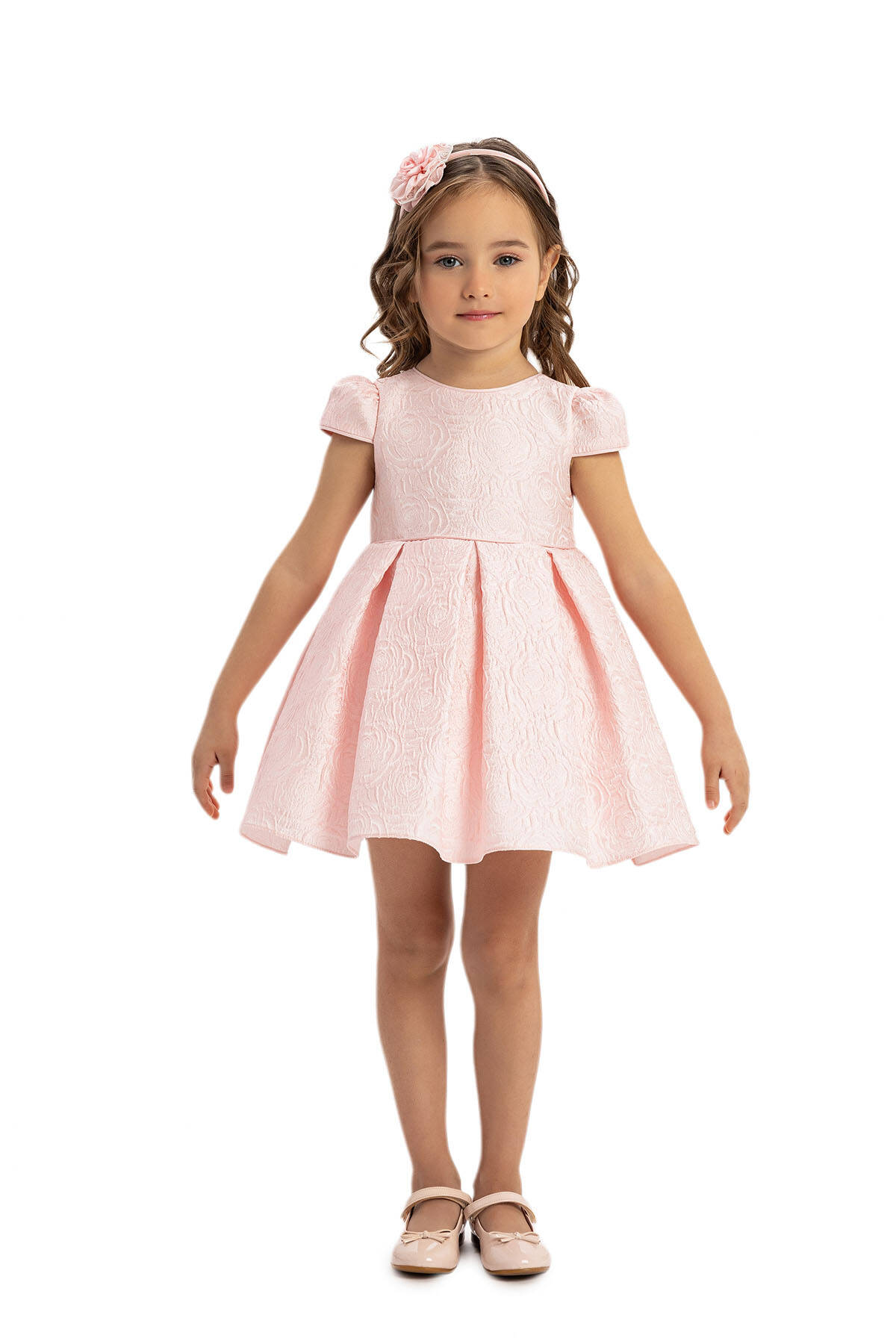 This charming set is perfect for your little one, making every celebration even more magical! The sleeveless dress features a classic flared skirt with a textured floral jacquard pattern, creating a timeless look. The matching jacket brings sophistication with its elegant ruffle details, delicate lace trims, and a sweet heart-shaped embellishment on the collar. The set is completed with a matching headband featuring a floral accent, adding the perfect finishing touch to the ensemble. Soft, comfortable, and breathable, this outfit is ideal for birthdays, family events, or any special occasion, keeping your little one stylish and at ease all day long.