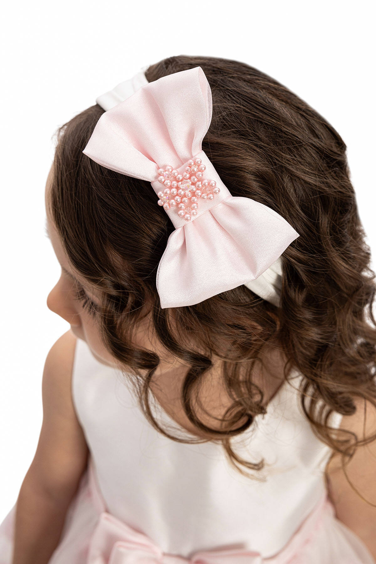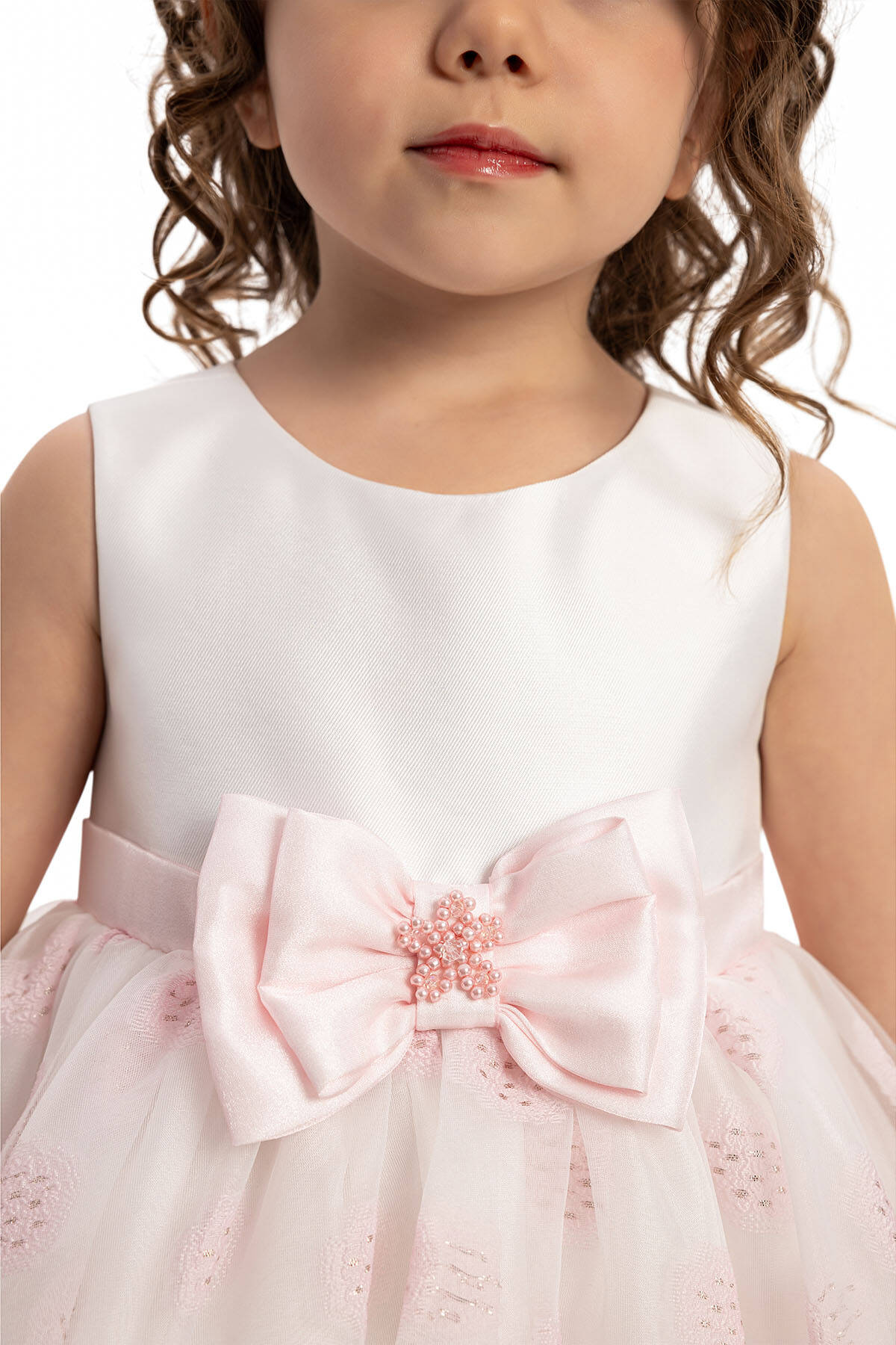 The dress features a shimmering organza overlay adorned with glittery polka dots, creating a magical, playful look. A satin bow at the waist, embellished with pearl and bead details, adds an extra layer of elegance. The flared skirt offers a flowing silhouette perfect for twirling, while the matching hair accessory completes this enchanting outfit, making it ideal for birthdays, photoshoots, or special occasions.