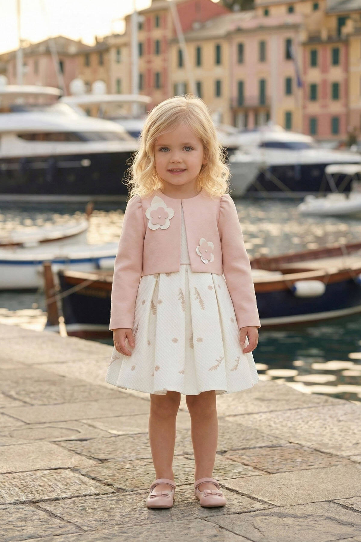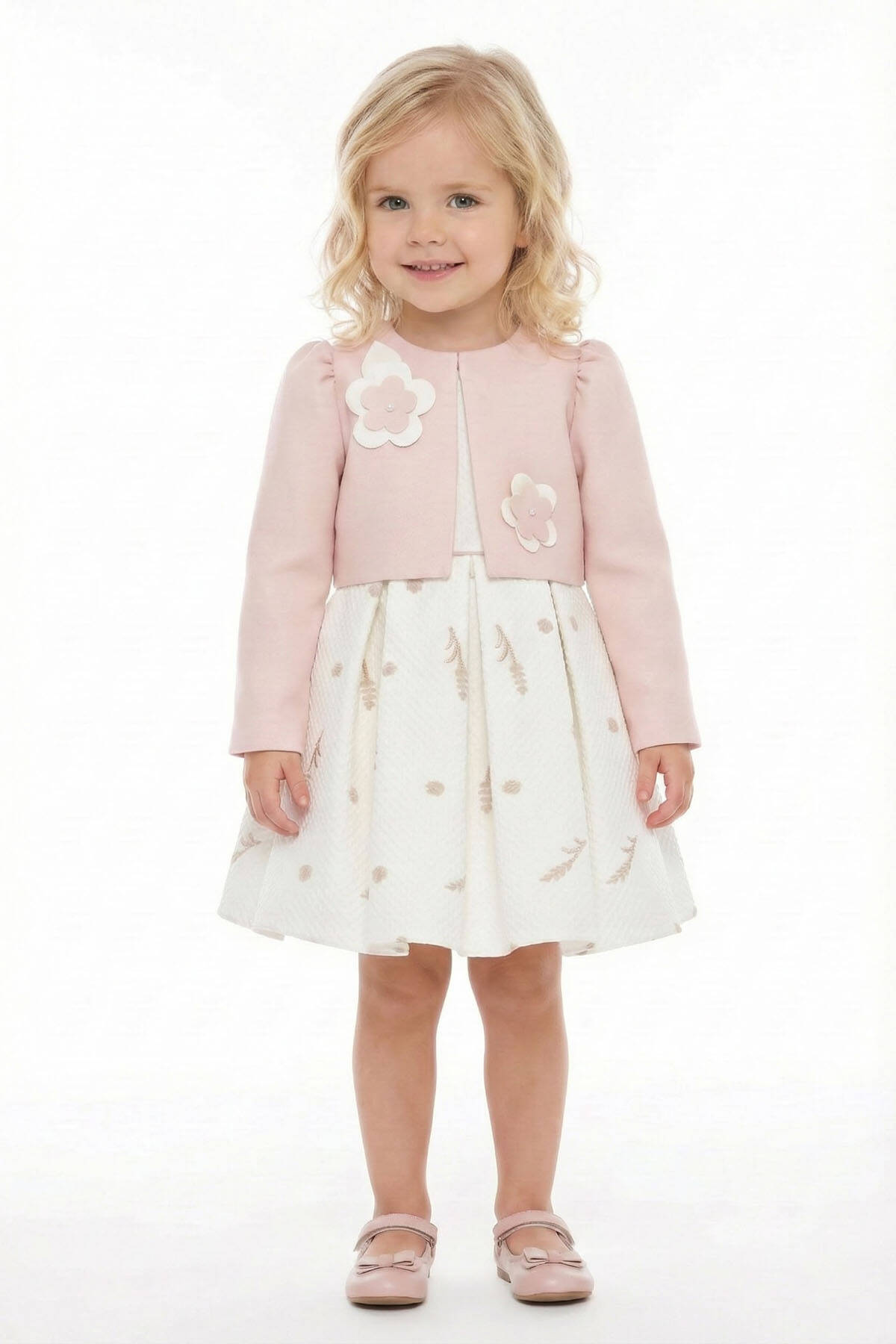 Sweetness in every stitch. This adorable two-piece baby set features a sleeveless embroidered dress with soft pleats and delicate floral patterns, paired with a charming cropped jacket adorned with oversized flower appliqués and pearl details. Perfect for birthdays, family photos, or her very first party look.