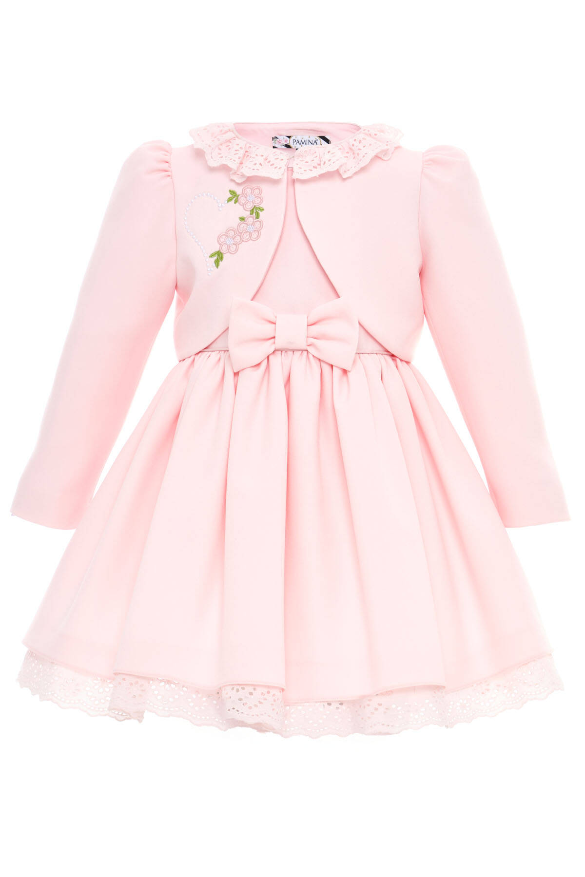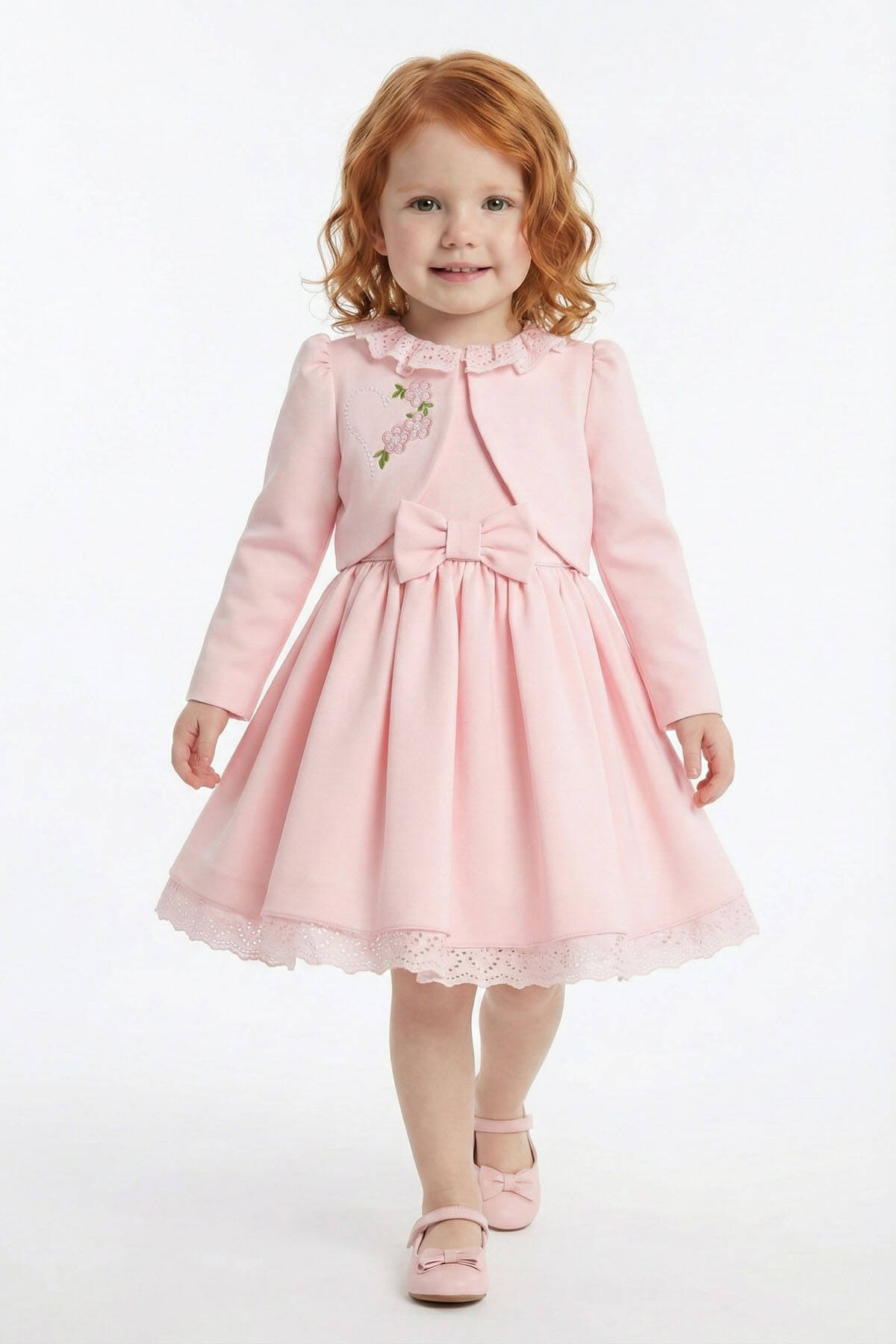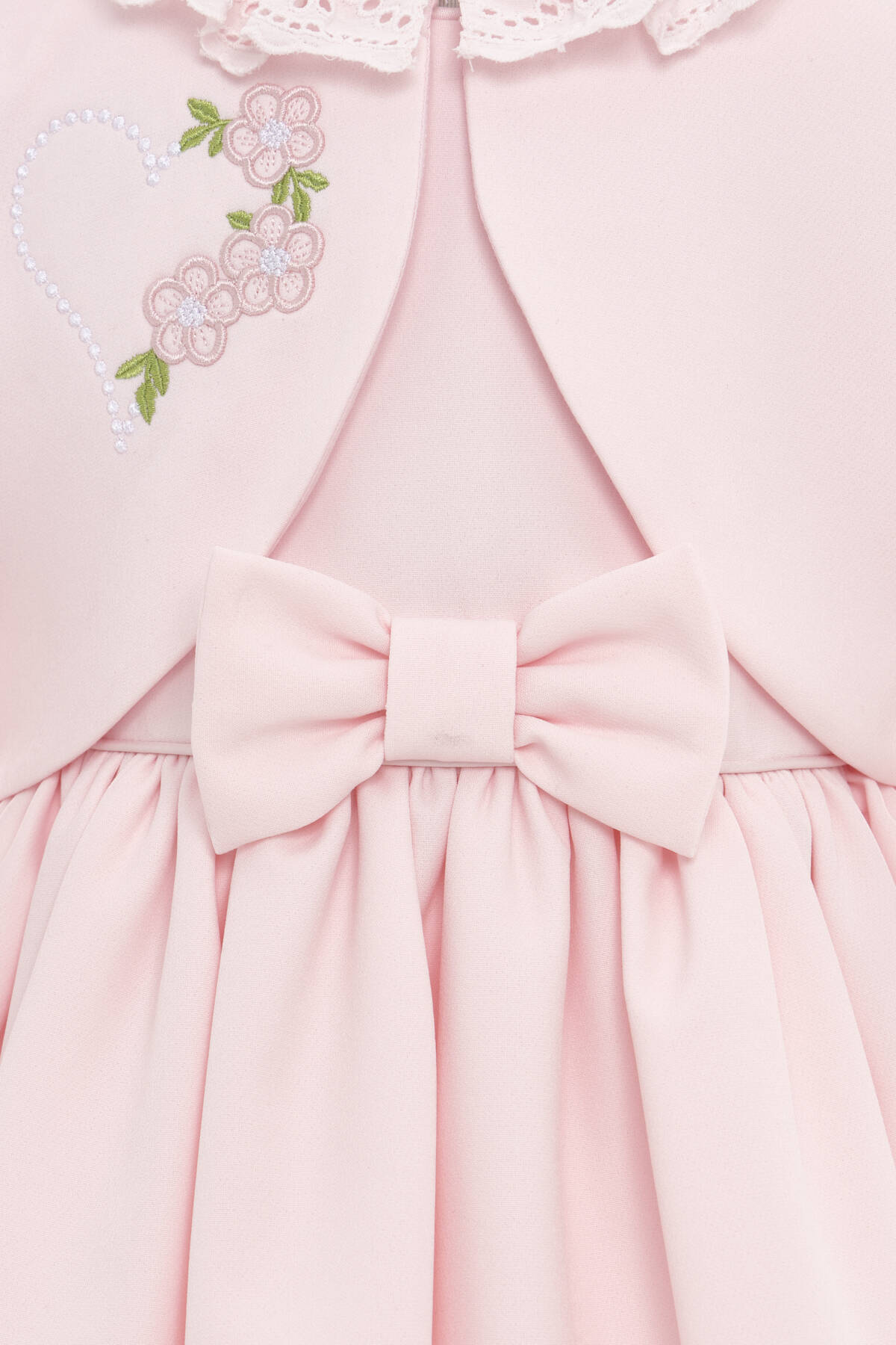 Delicate, dreamy, and designed for special memories. This two-piece set brings together timeless charm and baby-soft comfort. The look features a classic sleeveless dress with a full skirt, accented by a sweet oversized bow and scalloped lace hem. Layered with the matching long-sleeve jacket, it becomes a picture-perfect outfit for all your little one’s most cherished occasions. The jacket is detailed with floral embroidery, a heart motif made of pearls, and a dainty lace-trimmed collar.