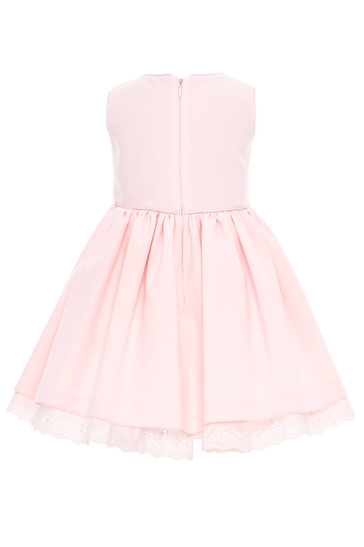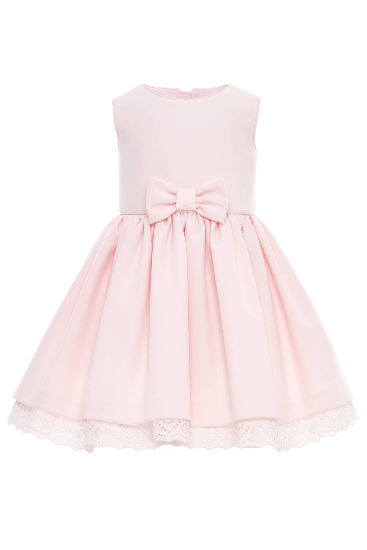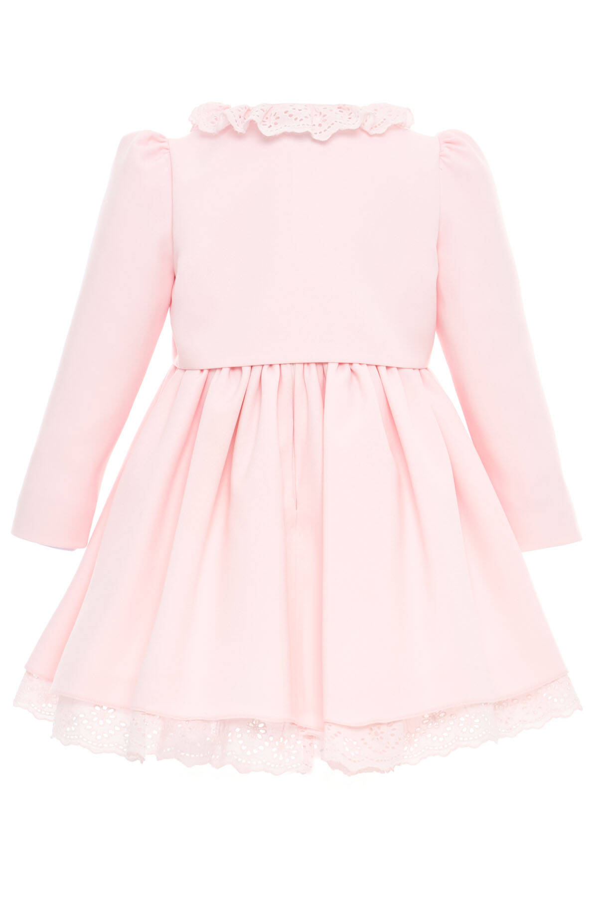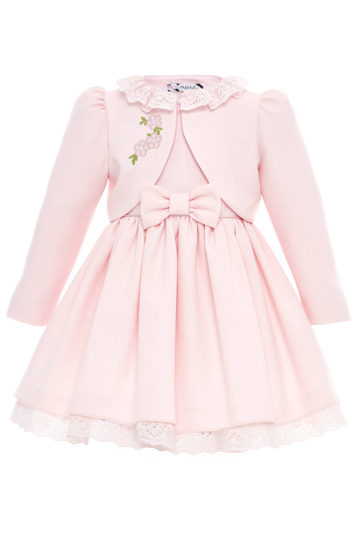 Delicate, dreamy, and designed for special memories. This two-piece set brings together timeless charm and baby-soft comfort. The look features a classic sleeveless dress with a full skirt, accented by a sweet oversized bow and scalloped lace hem. Layered with the matching long-sleeve jacket, it becomes a picture-perfect outfit for all your little one’s most cherished occasions. The jacket is detailed with floral embroidery, a heart motif made of pearls, and a dainty lace-trimmed collar.