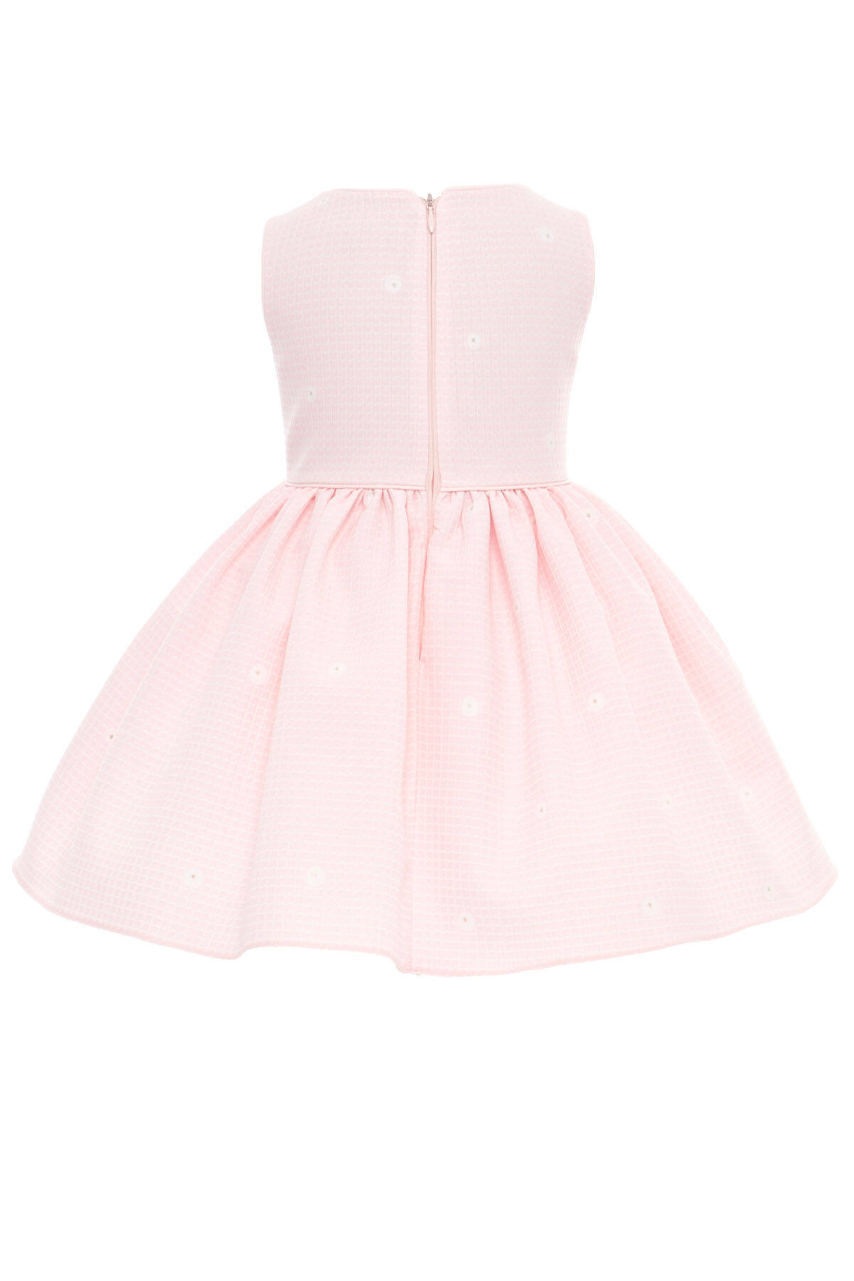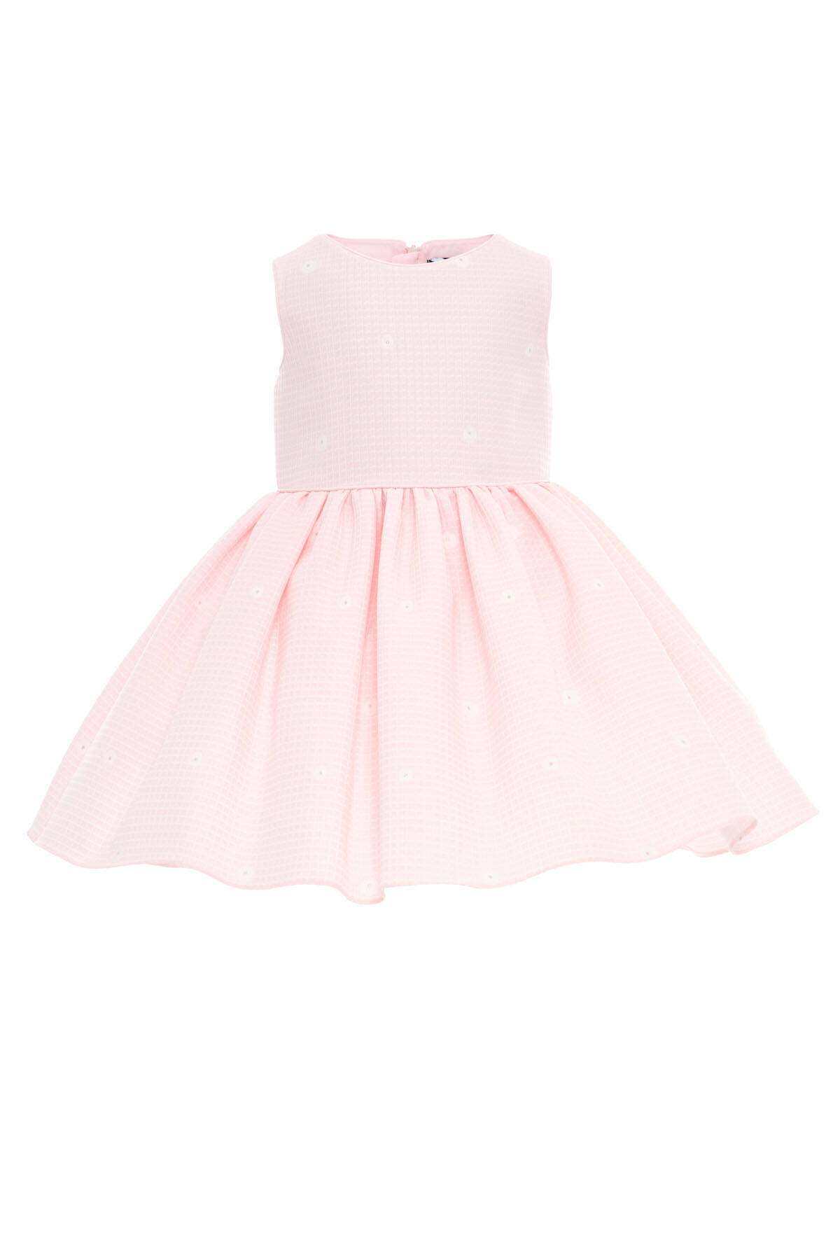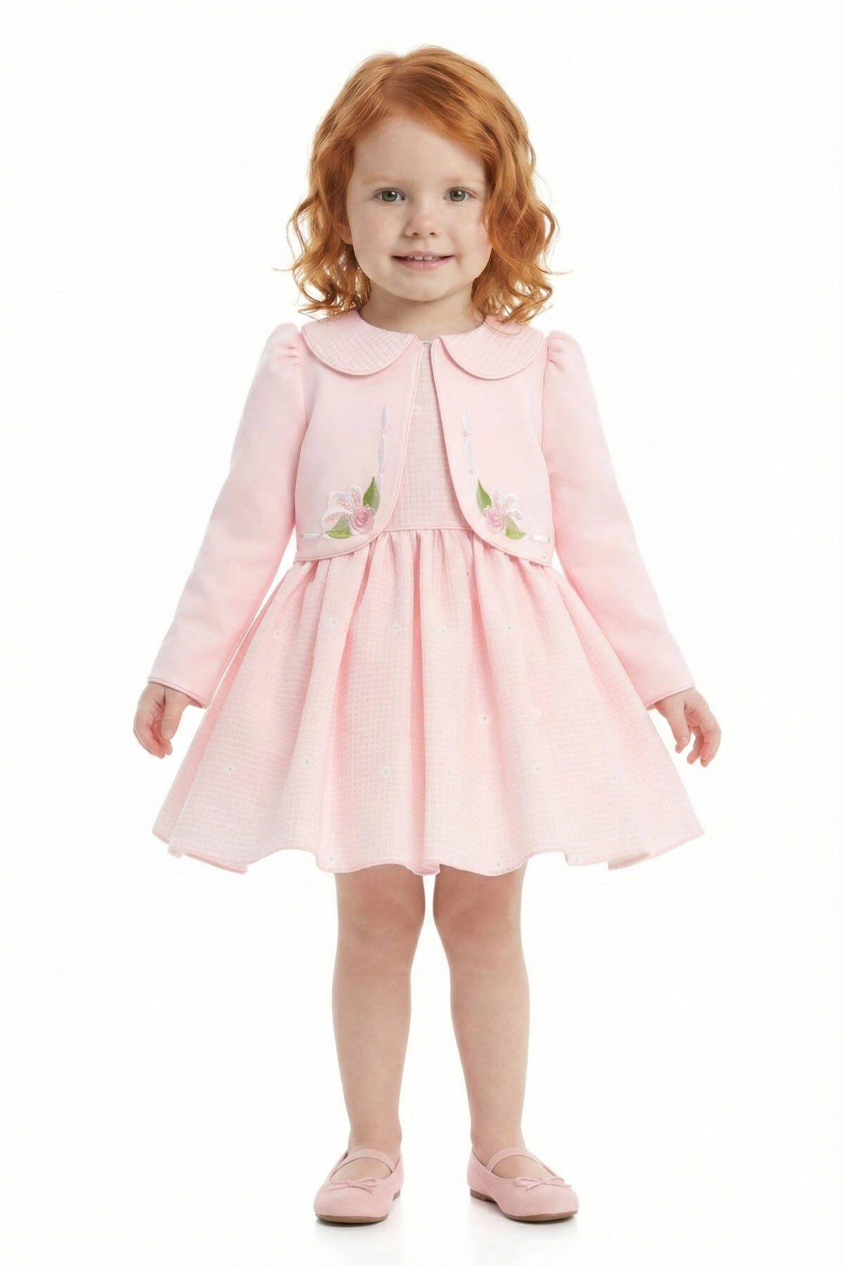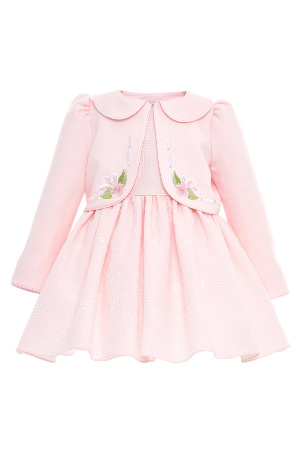 A graceful ensemble designed to capture the innocence and beauty of babyhood. This charming two-piece set includes a sleeveless dress crafted from soft textured fabric with subtle daisy-like embroidery, paired with a beautifully tailored long-sleeve jacket.The jacket features floral embroidery in soft pastels, complete with sequin accents and a rounded Peter Pan collar for a touch of timeless charm. Whether worn together for special occasions or separately for everyday elegance, this outfit is as versatile as it is beautiful.