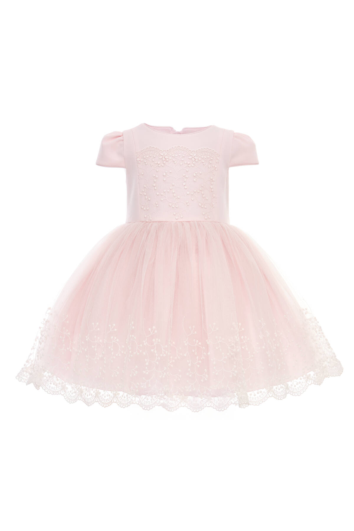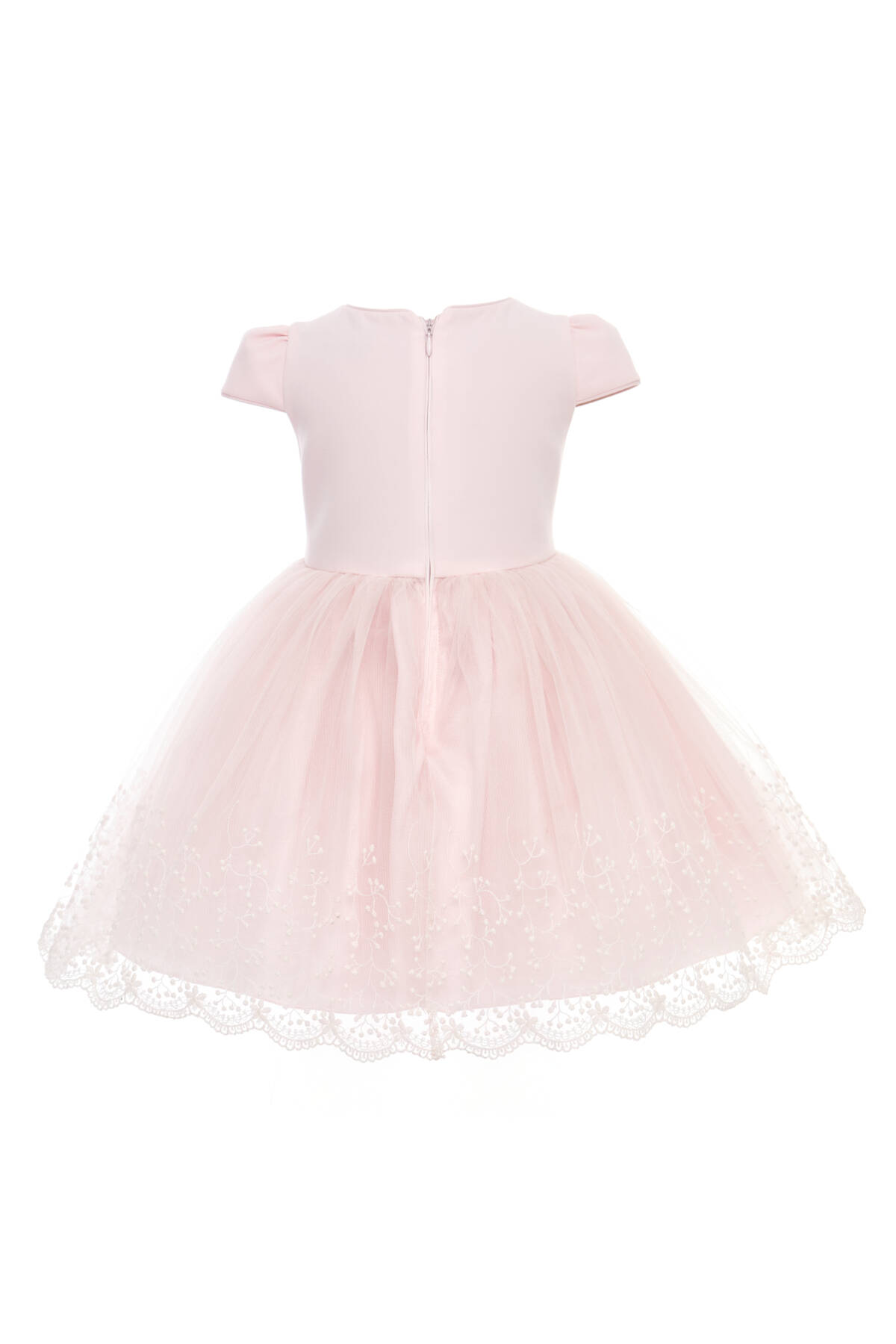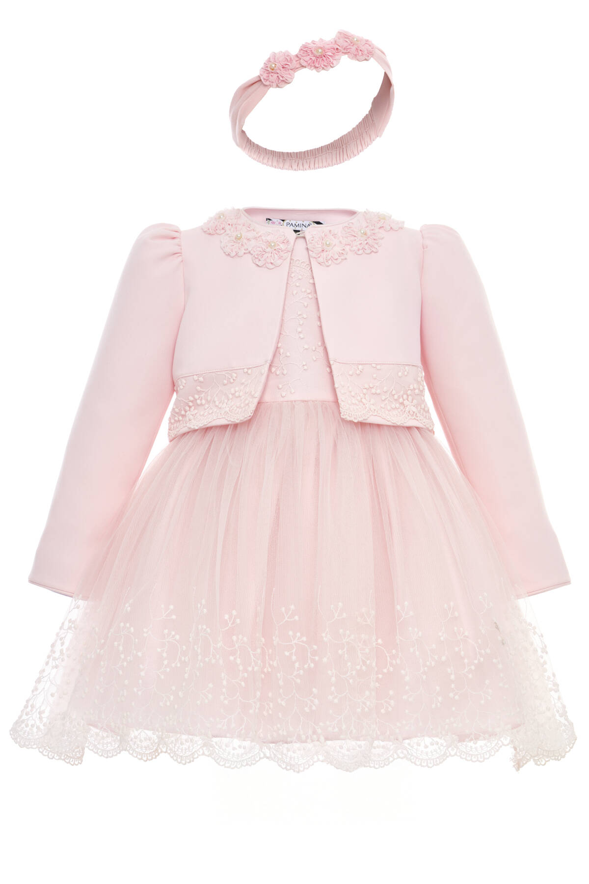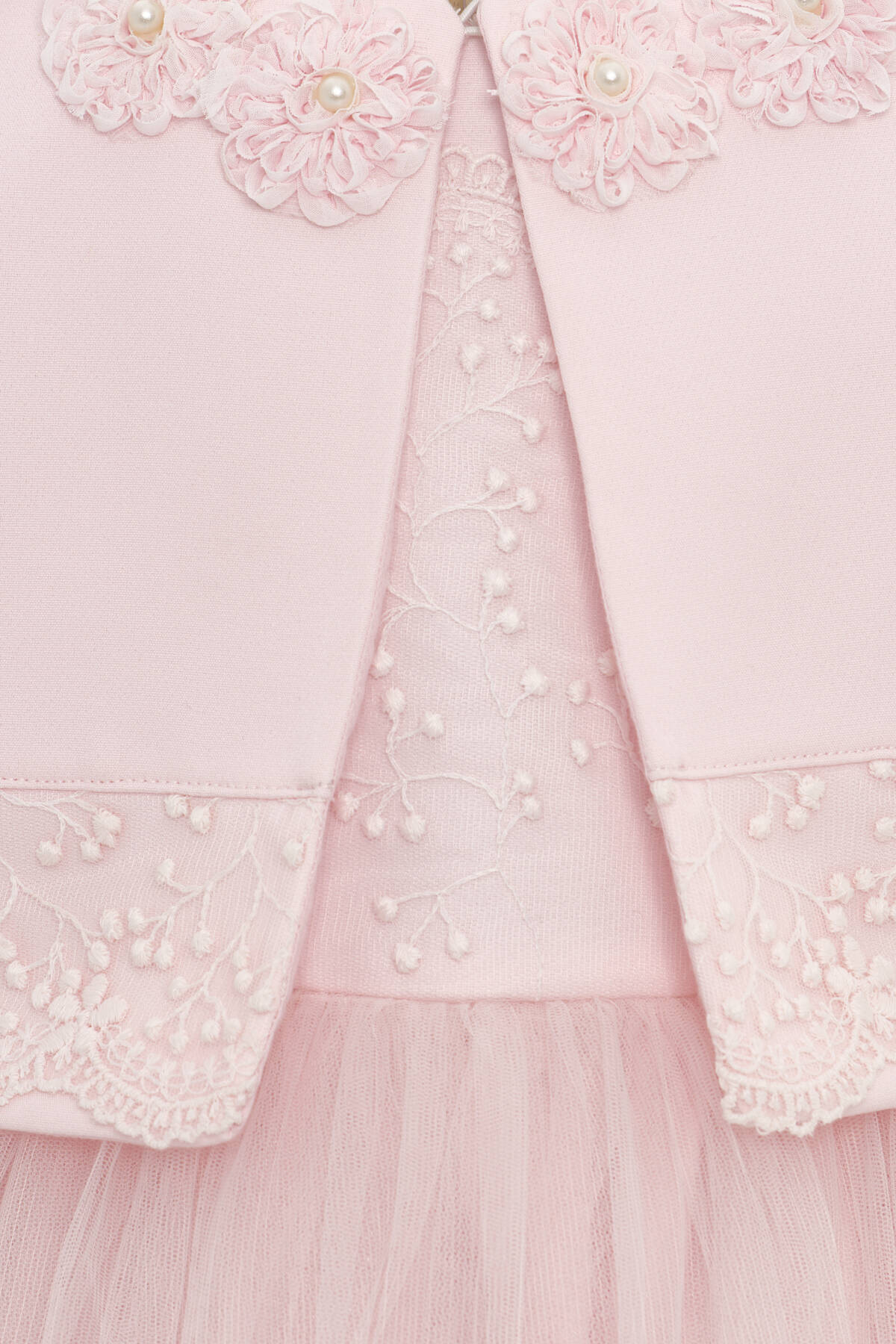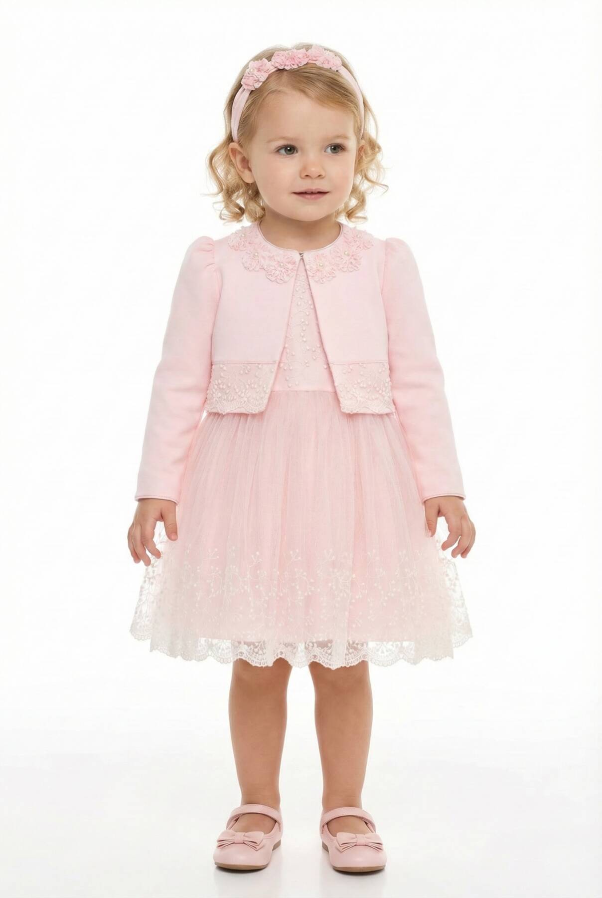 A dreamy ensemble made for your little one’s most precious occasions. This exquisite two-piece set includes a soft tulle dress adorned with delicate embroidery and a scalloped lace hem, paired with a structured bolero jacket featuring floral appliqués and pearl accents along the collar. With its timeless silhouette and handcrafted details, this set is perfect for birthdays, christenings, or elegant family gatherings. Designed for comfort, beauty, and unforgettable memories.