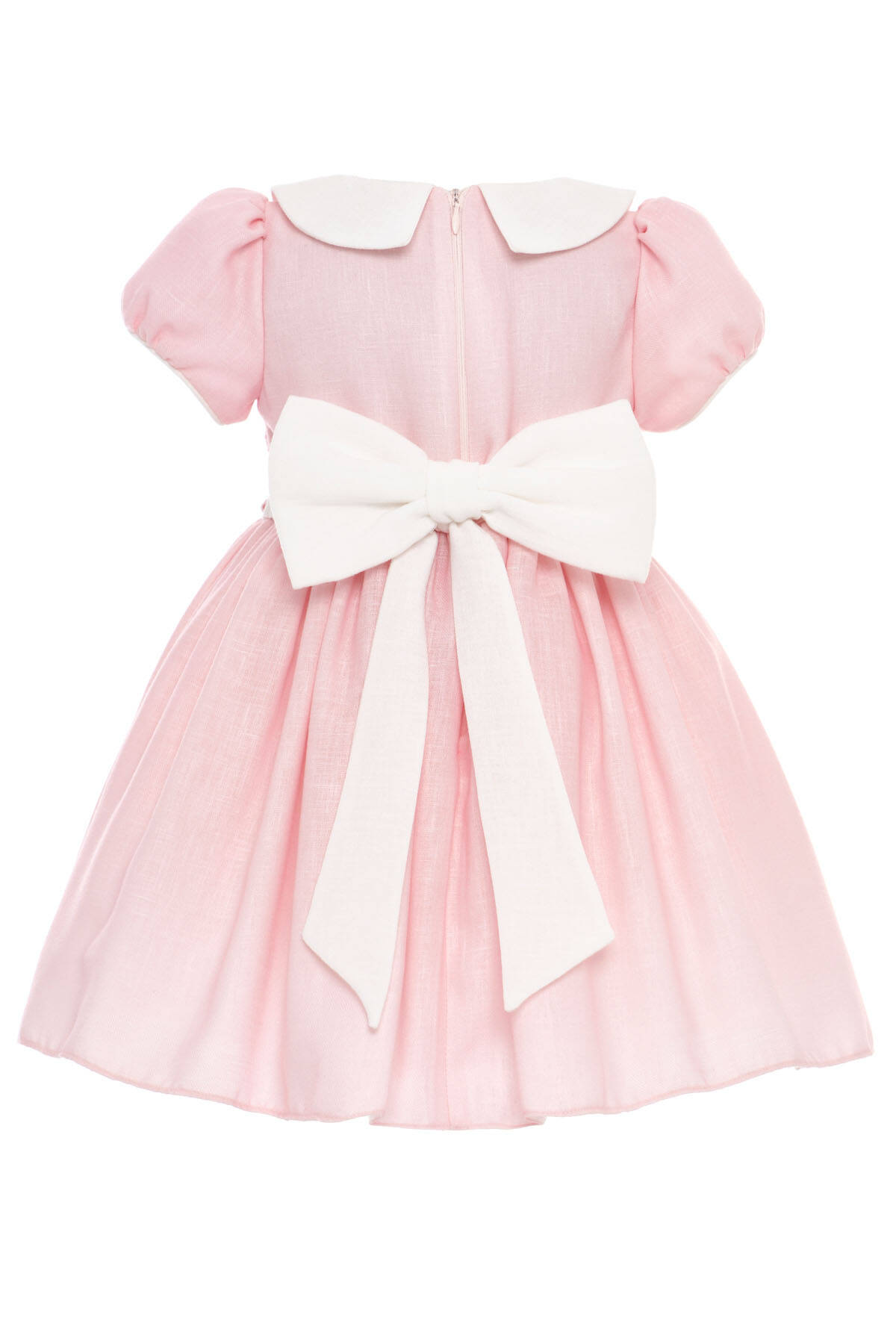 Bring charm to every occasion with this enchanting baby dress and matching headband set. Crafted in soft pastel shades, the dress features a crisp white Peter Pan collar, puffed sleeves, and hand-smocked detailing with tiny embroidered flowers for a delicate vintage touch. The oversized back bow and coordinating floral headband complete the timeless look—perfect for birthdays, tea parties, or special photoshoots.